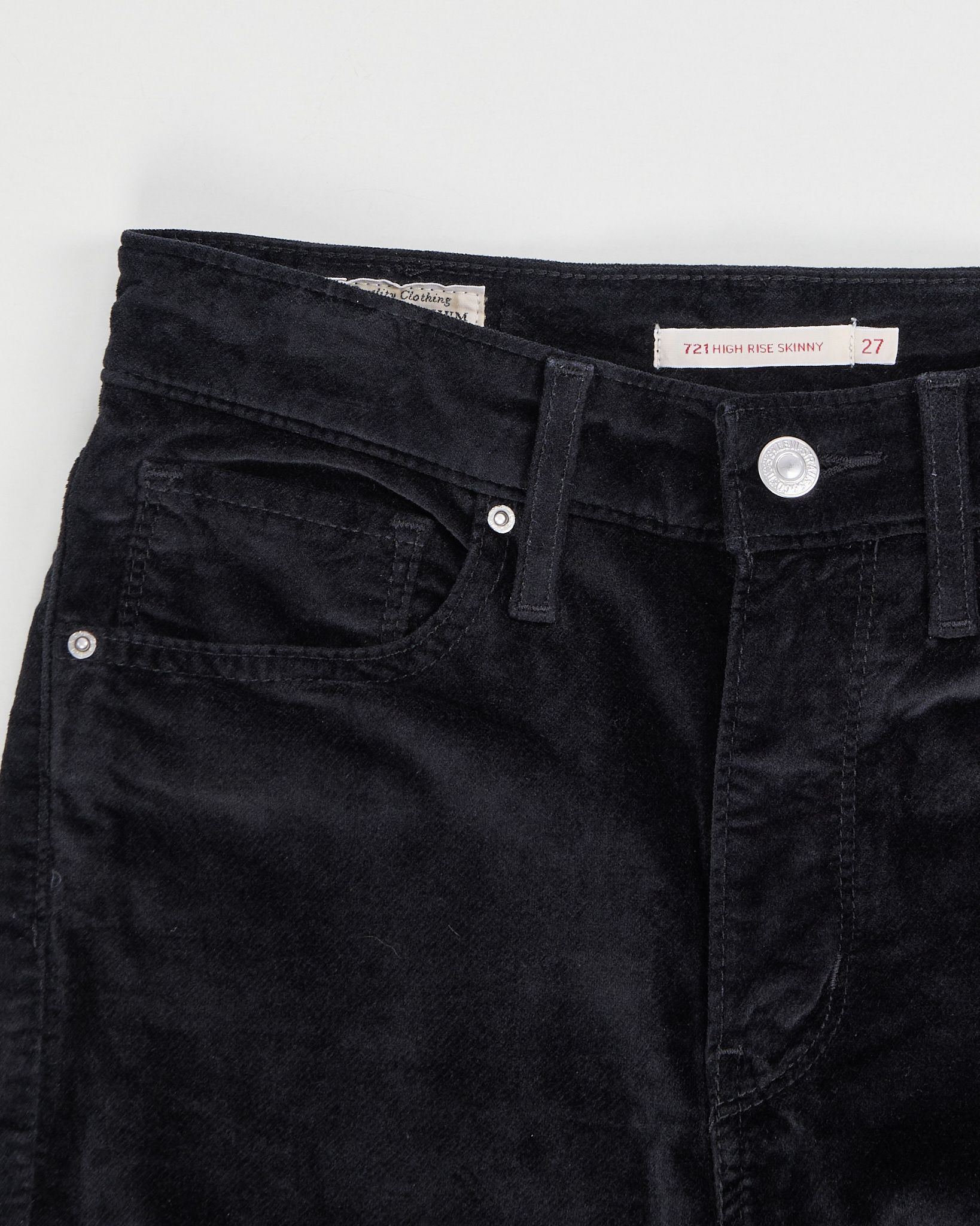 Джинсы Levi’s 721 выполнены из плотного бархатистого денима черного цвета. Высокая посадка, скинни, функциональные карманы по бокам.