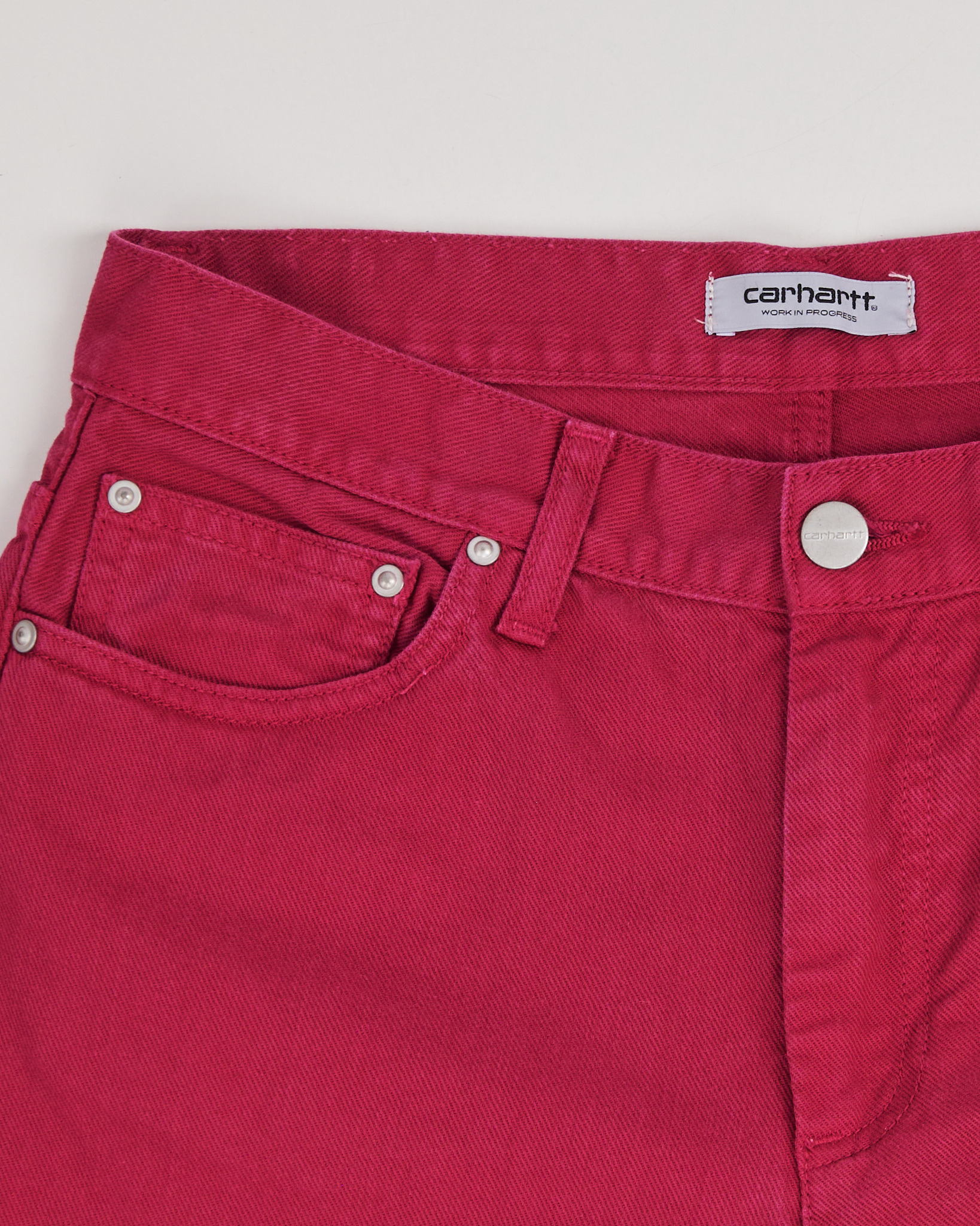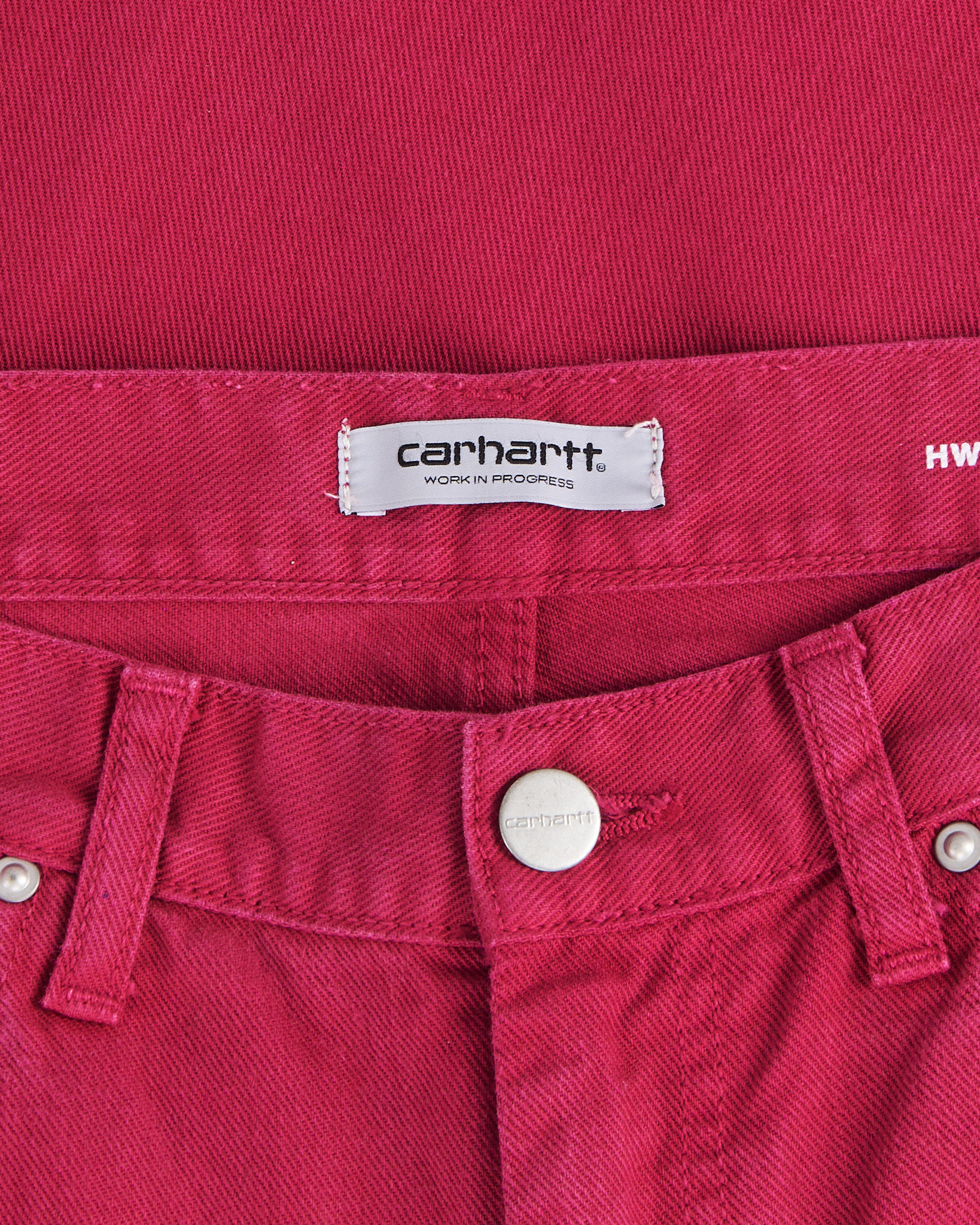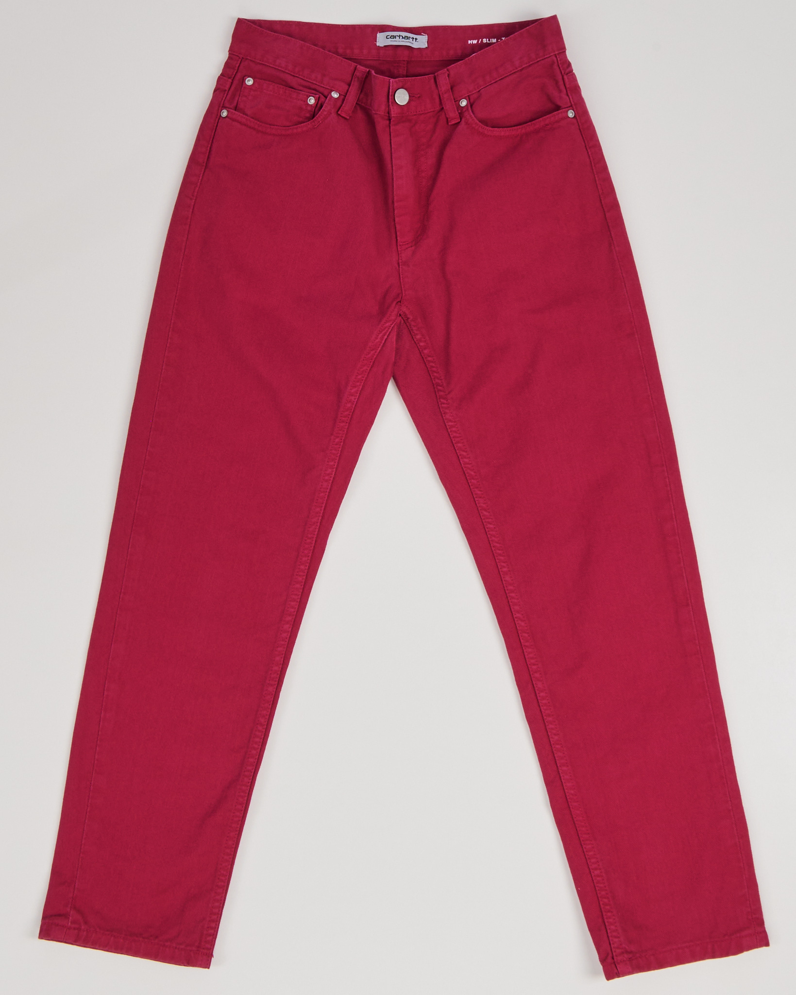 Джинсы Carhartt из 100% хлопка в ярко-розовом цвете. Укороченная модель, посадка slim - облегающий крой. Классическая конструкция пять карманов.