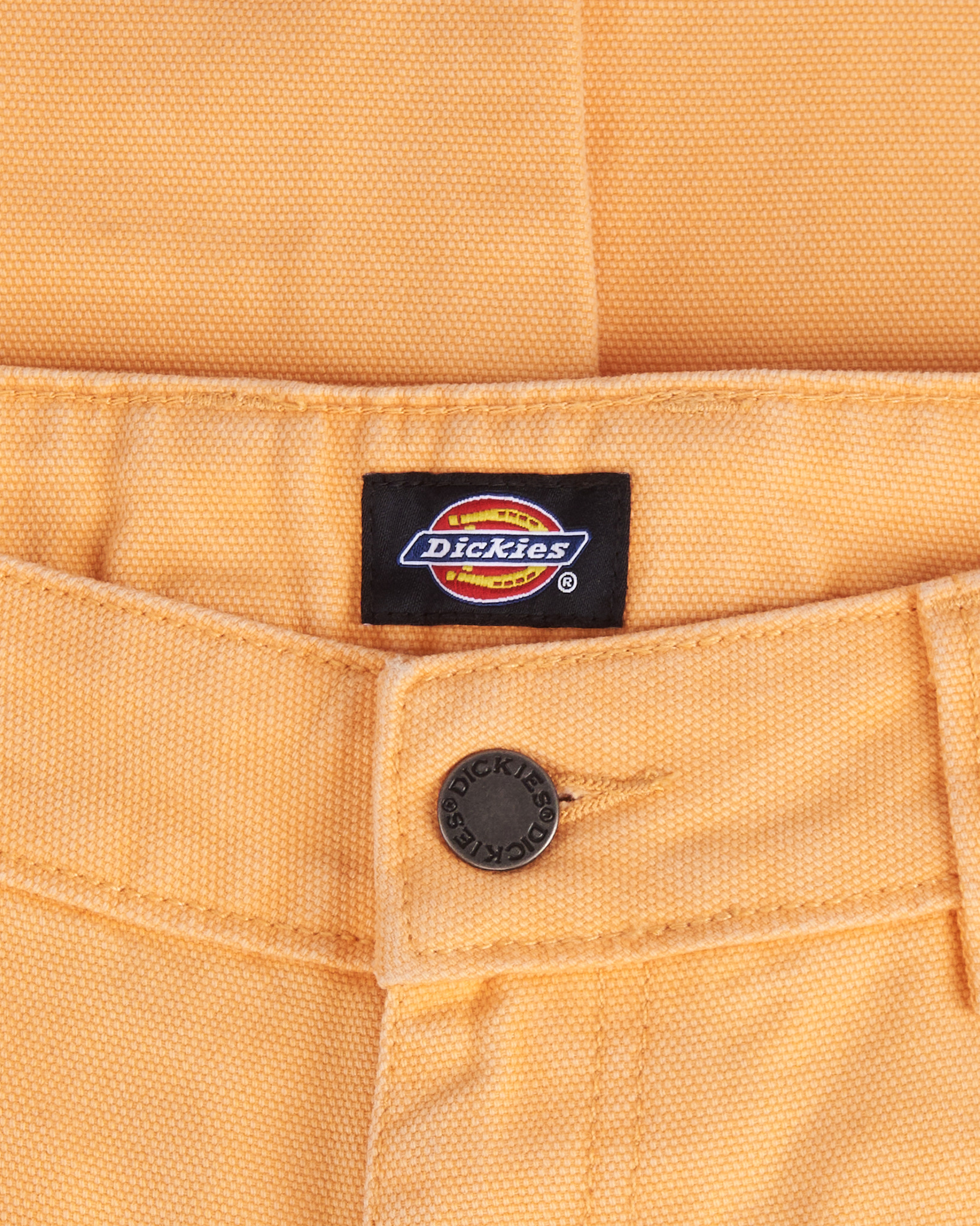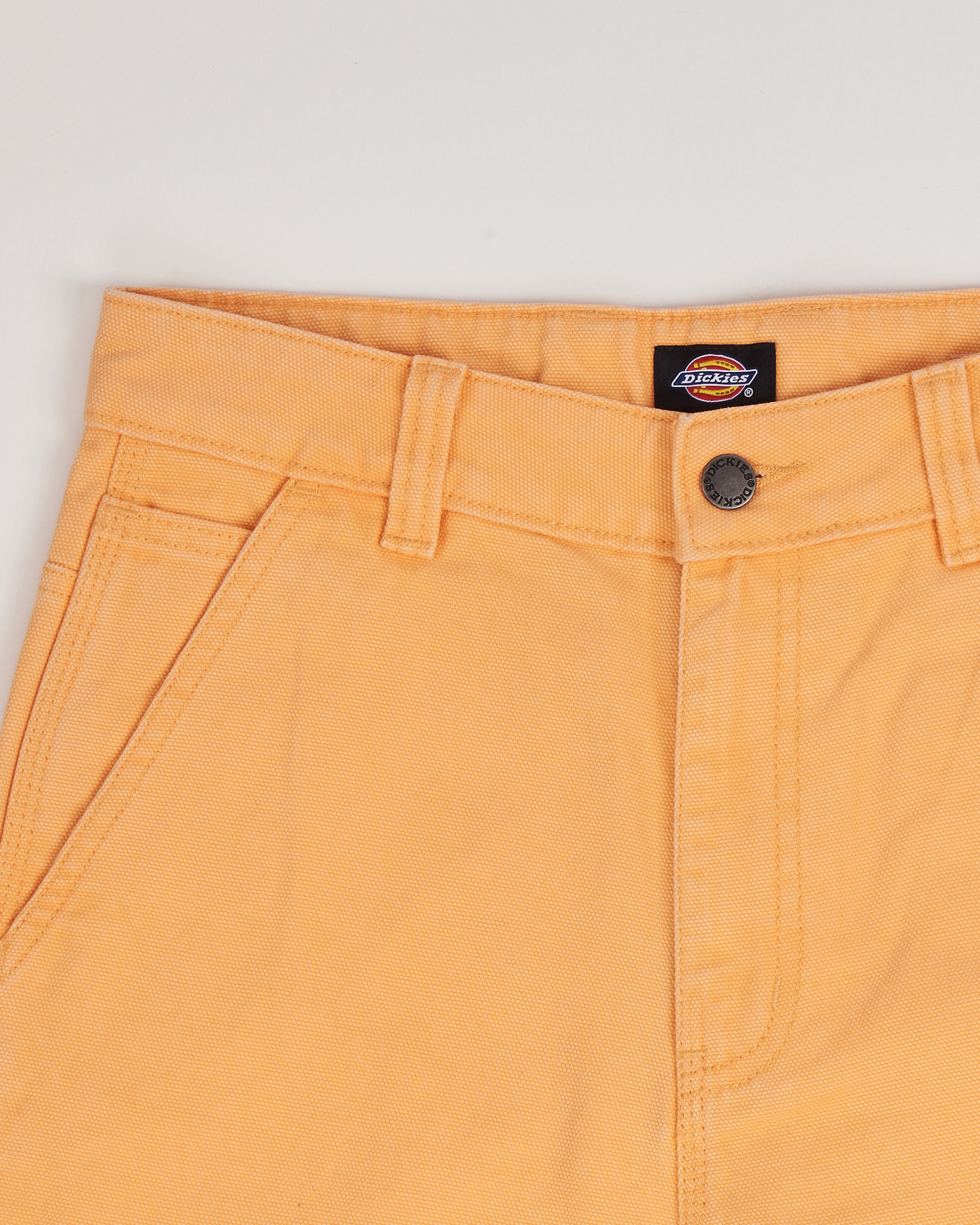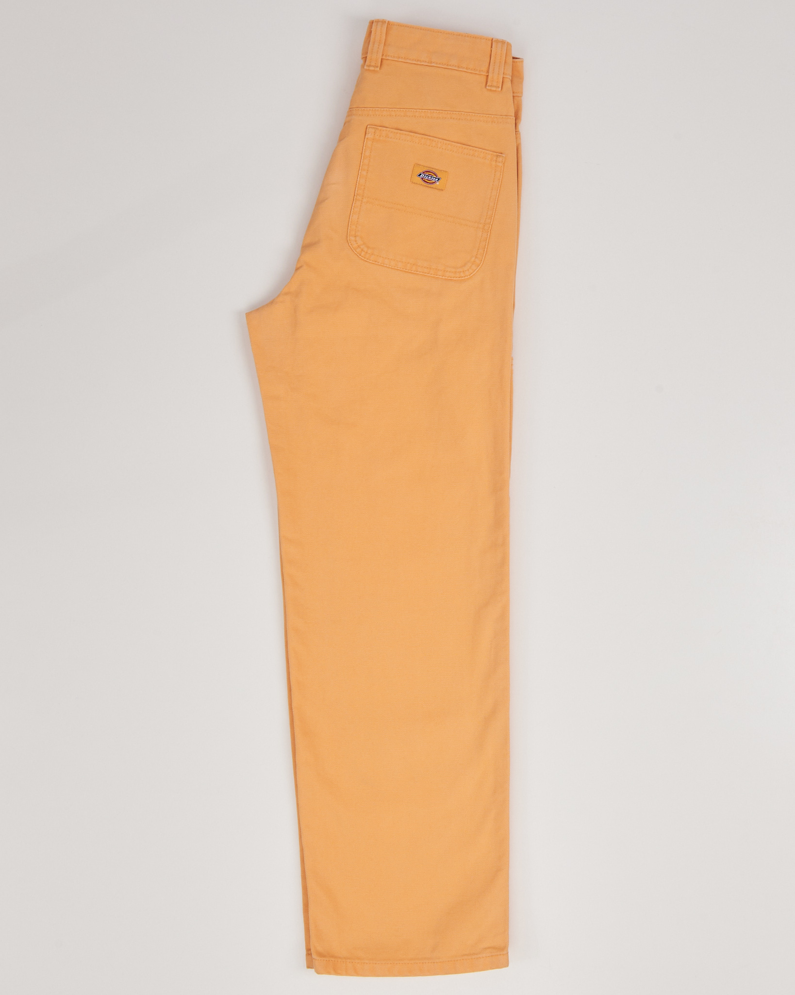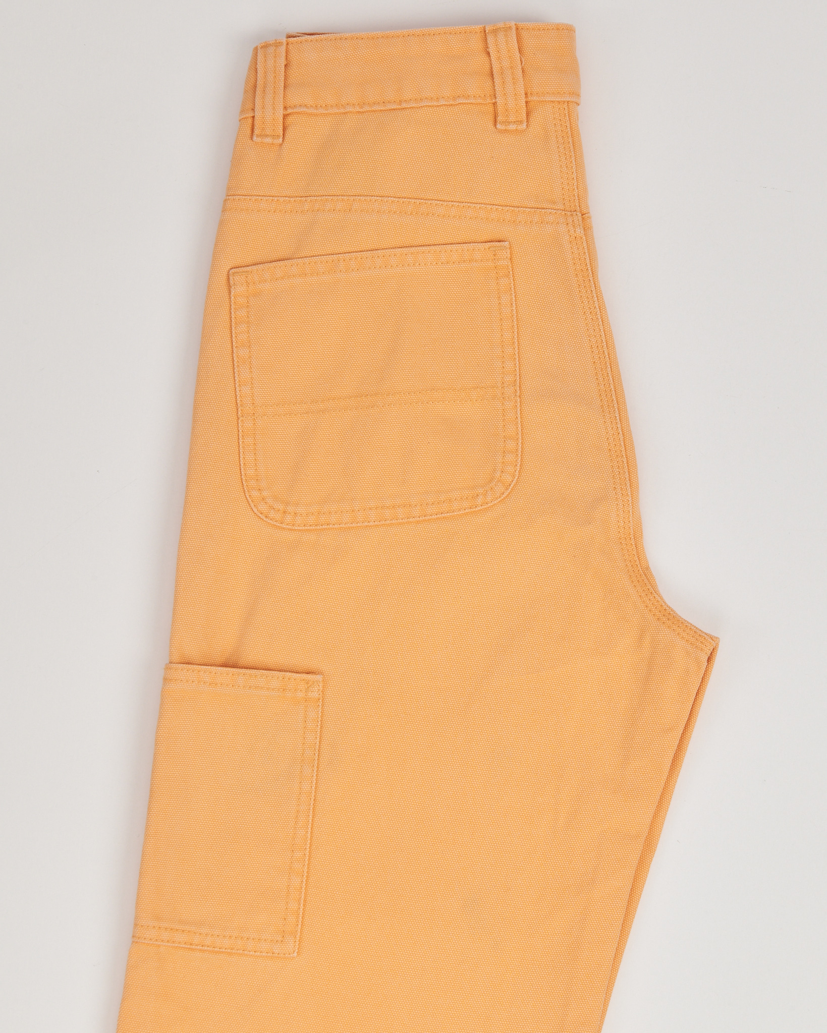 Брюки в рабочем стиле из плотного хлопкового материала в теплом оранжевом цвете. Высокая посадка, прямой свободный крой. Глубокие боковые карманы скошенного типа, дополнительный боковой карман слева.