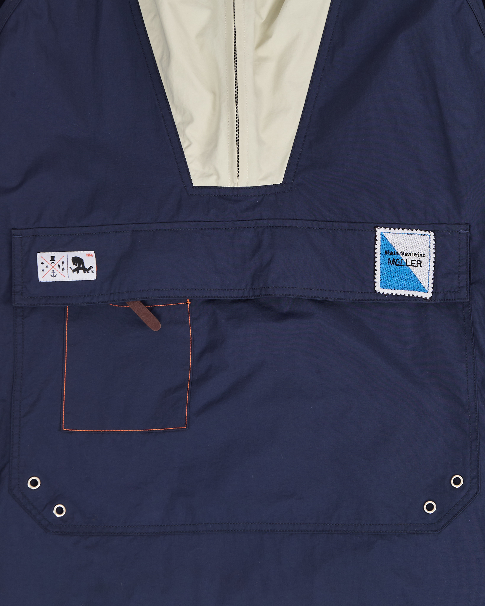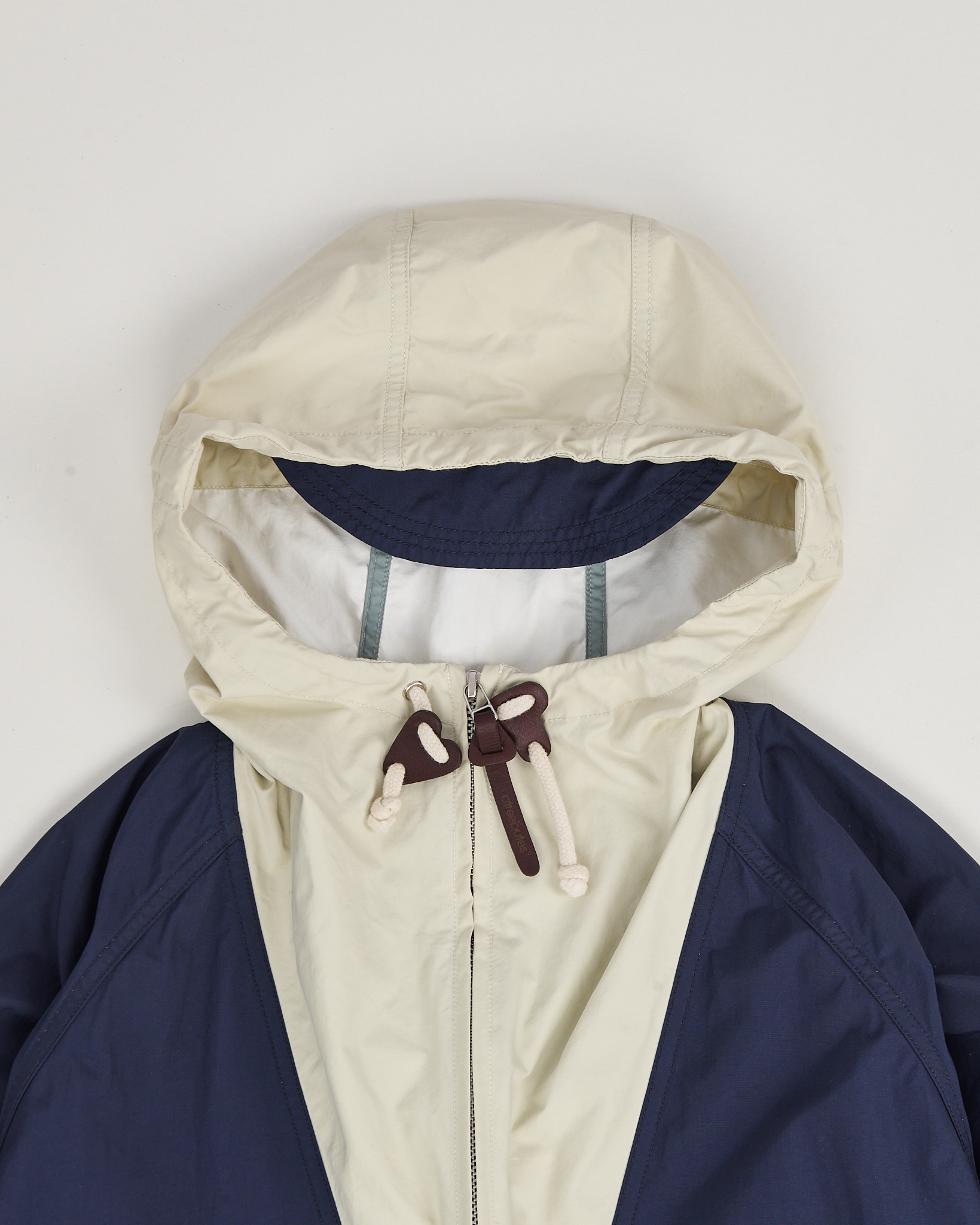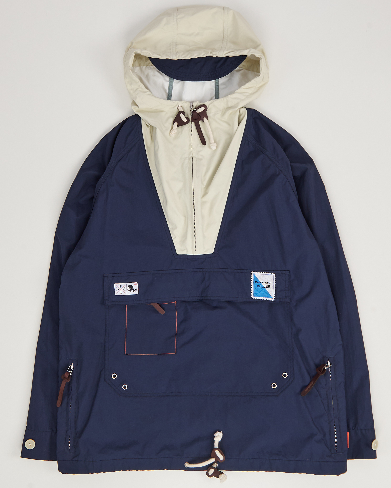Анорак Atreebutes в синем цвете с контрастной светлой вставкой. Материал плотный и гладкий на ощупь, ткань защищает от ветра и держит форму. Посадка свободная, рукава реглан. Большой карман спереди, нашивки и контрастные детали, удобный капюшон с резинкой.