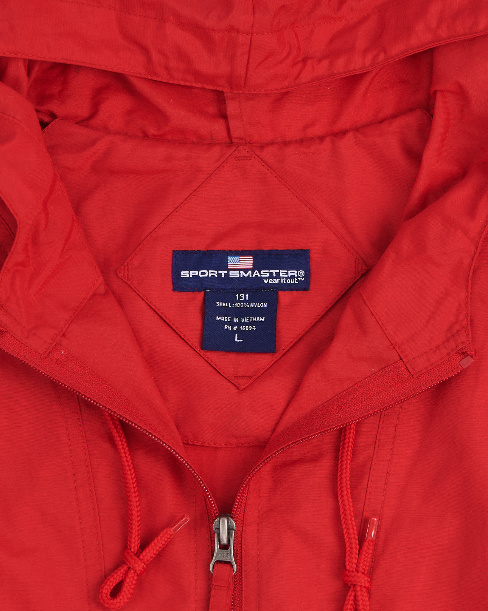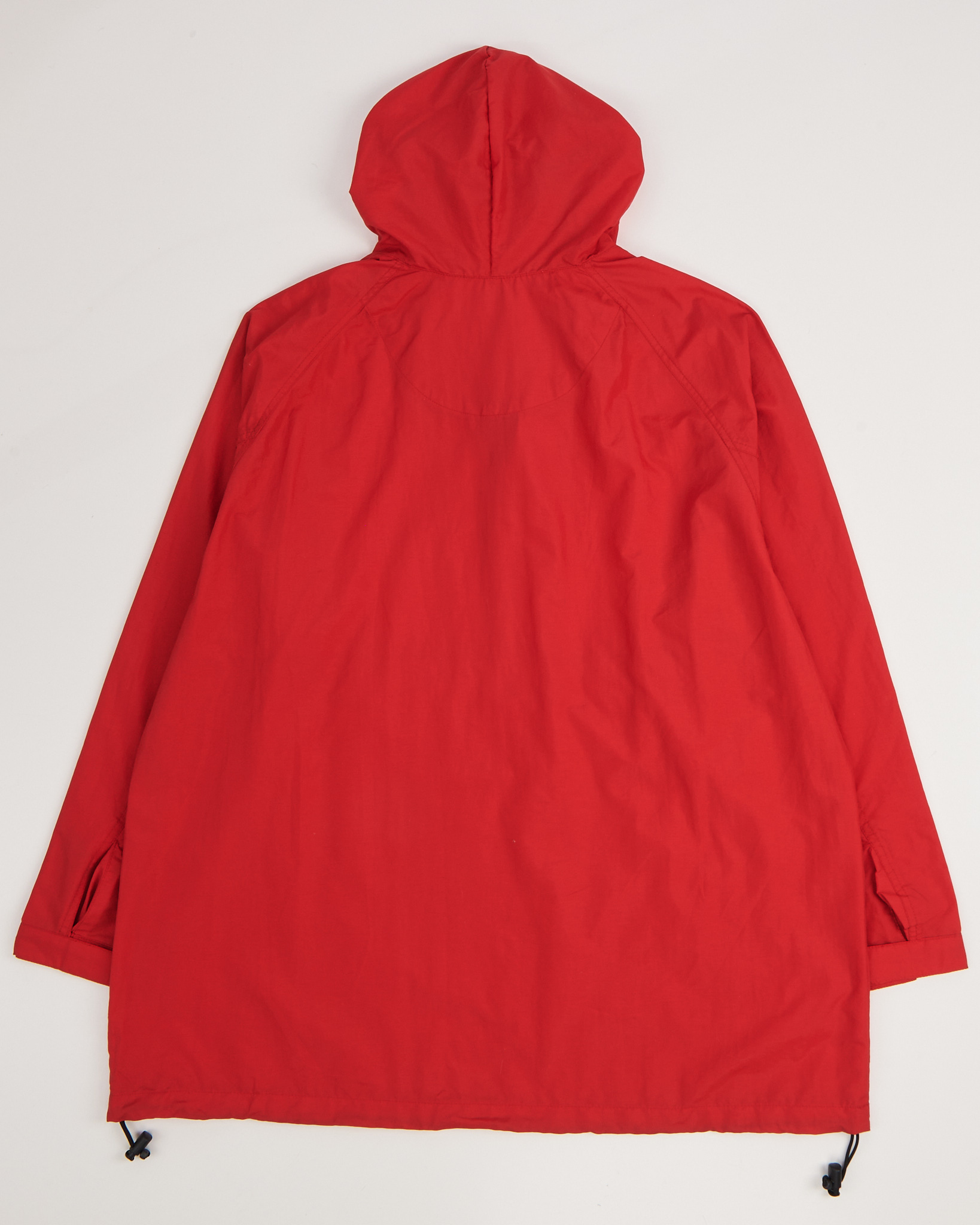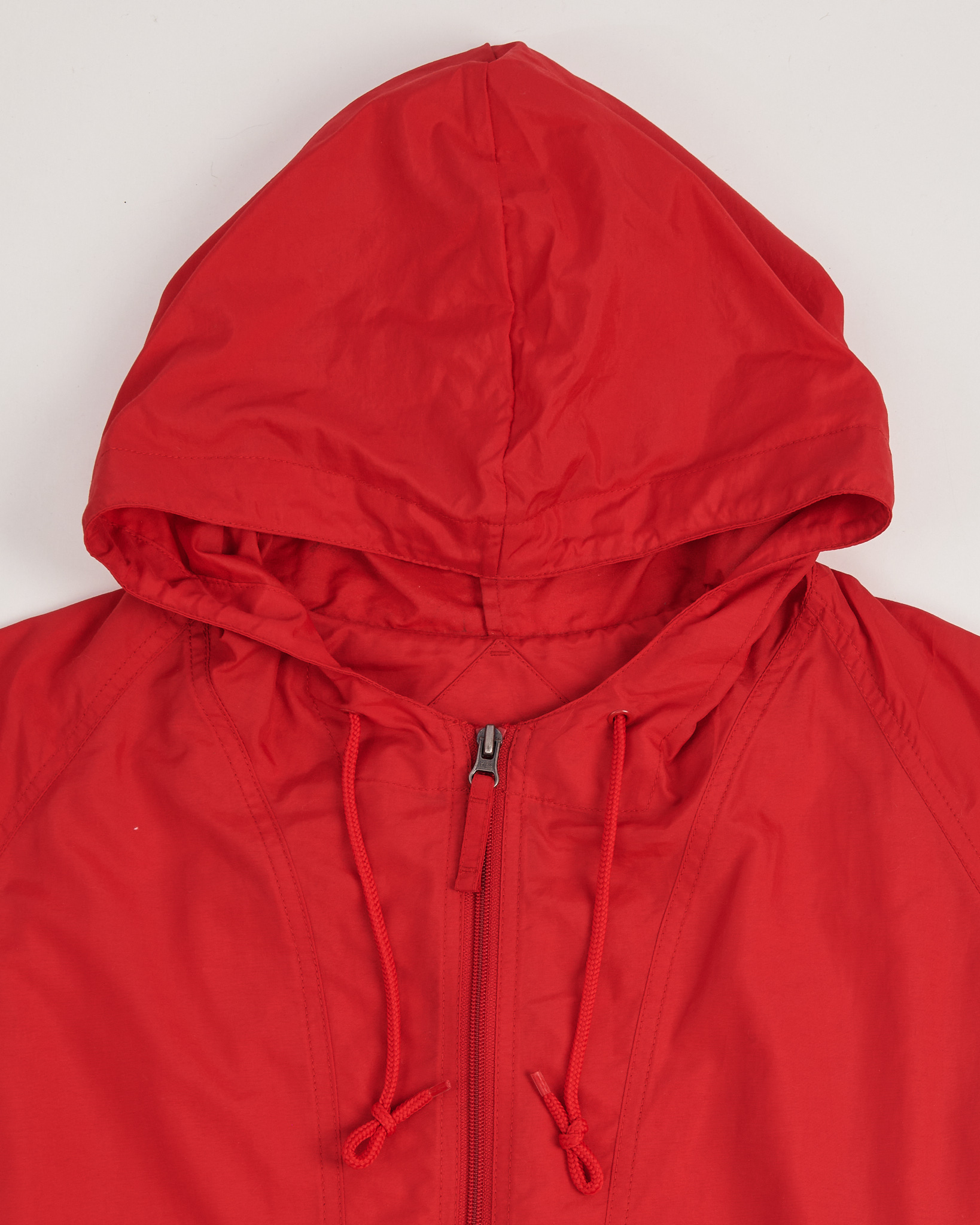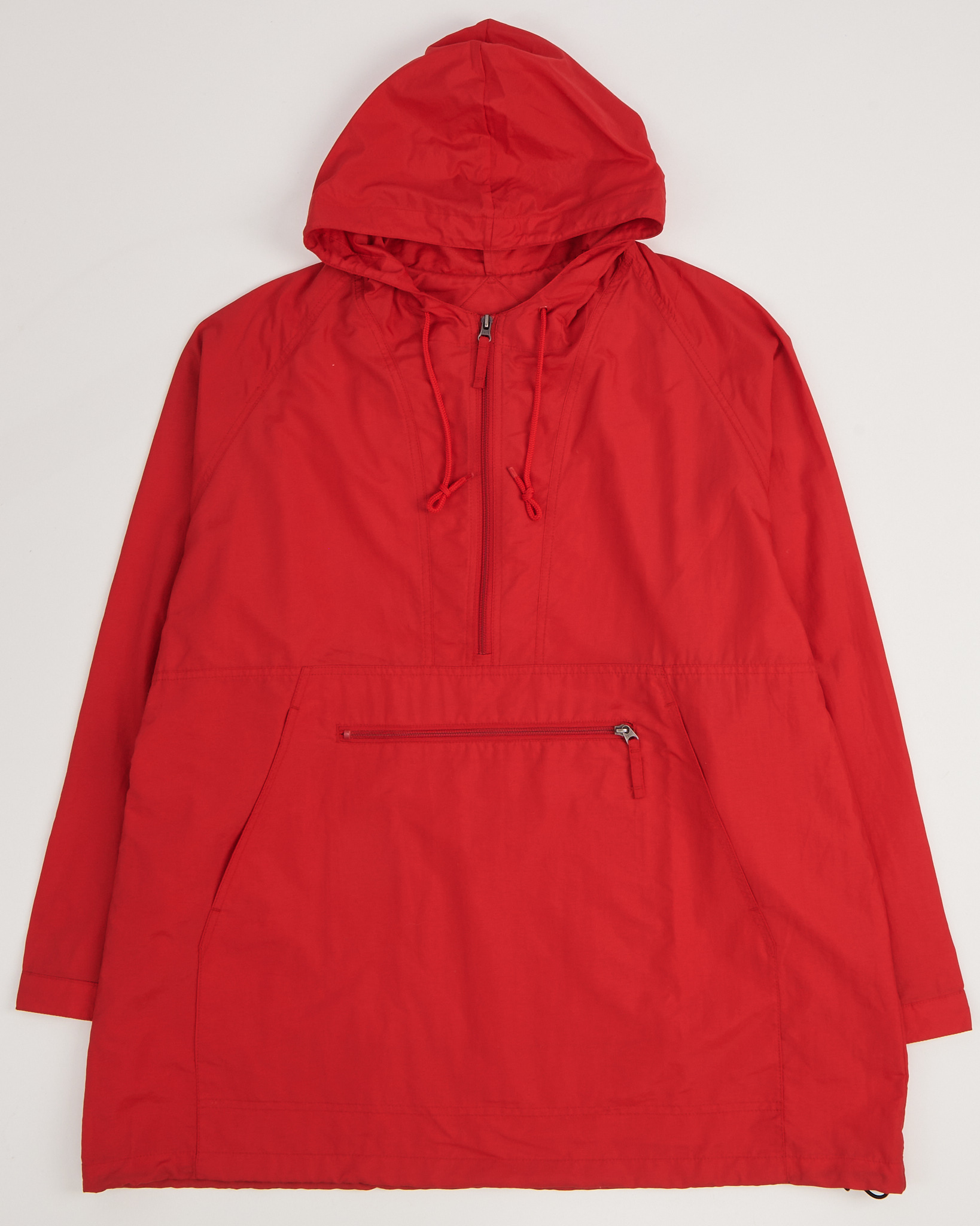 Анорак с капюшоном красного цвета, ткань лёгкая и плотная. Свободный силуэт с рукавом реглан, посадка расслабленная. Капюшон с утяжками и короткая молния на груди добавляют функциональность. Вместительный карман с горизонтальной молнией.