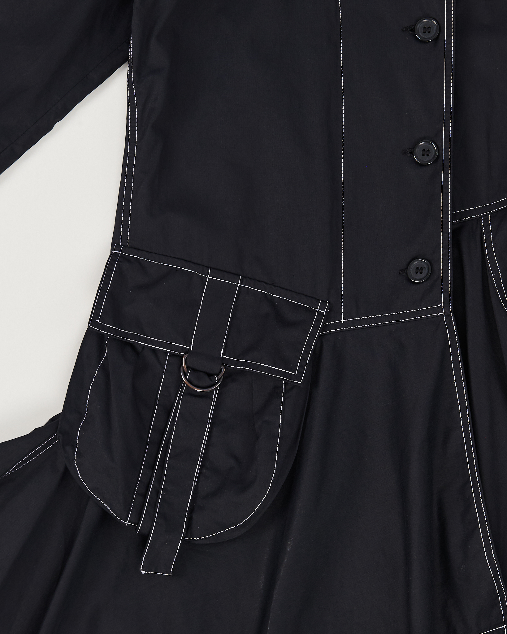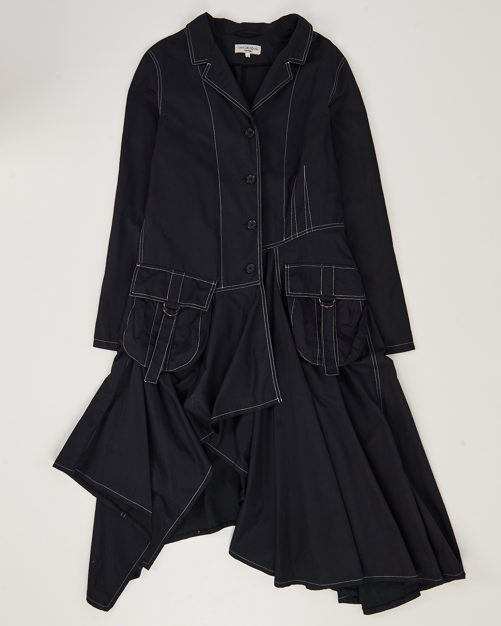 Плащ асимметричного кроя с контрастной прострочкой. Приталенный силуэт. Классический отложной воротник. Застежка на пуговицы. Два накладных кармана с декоративными ремешками