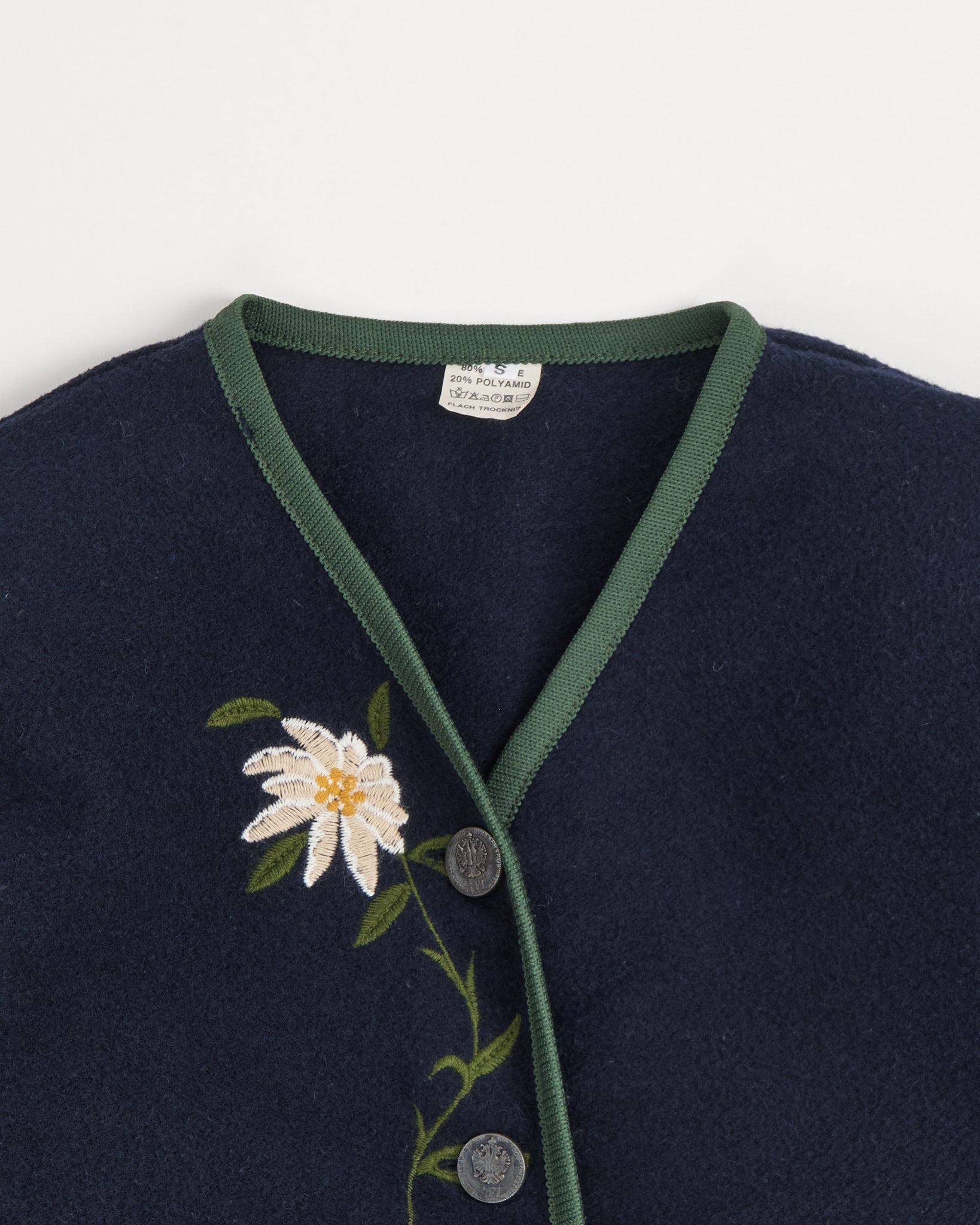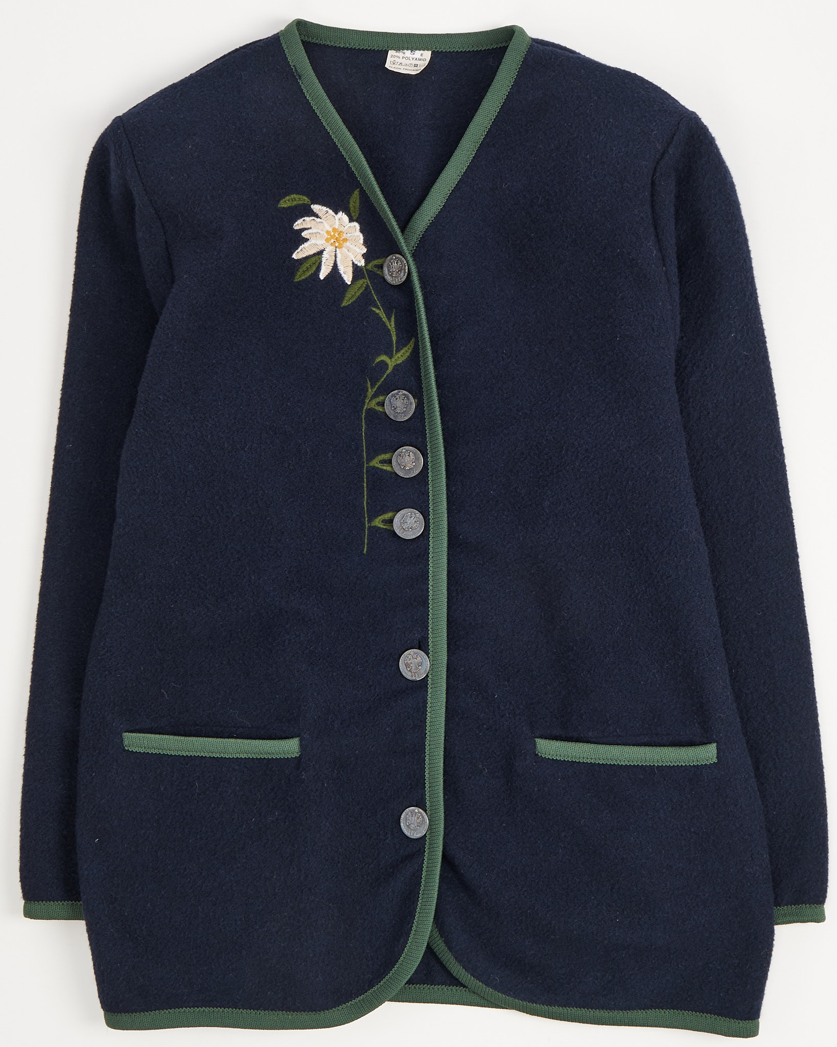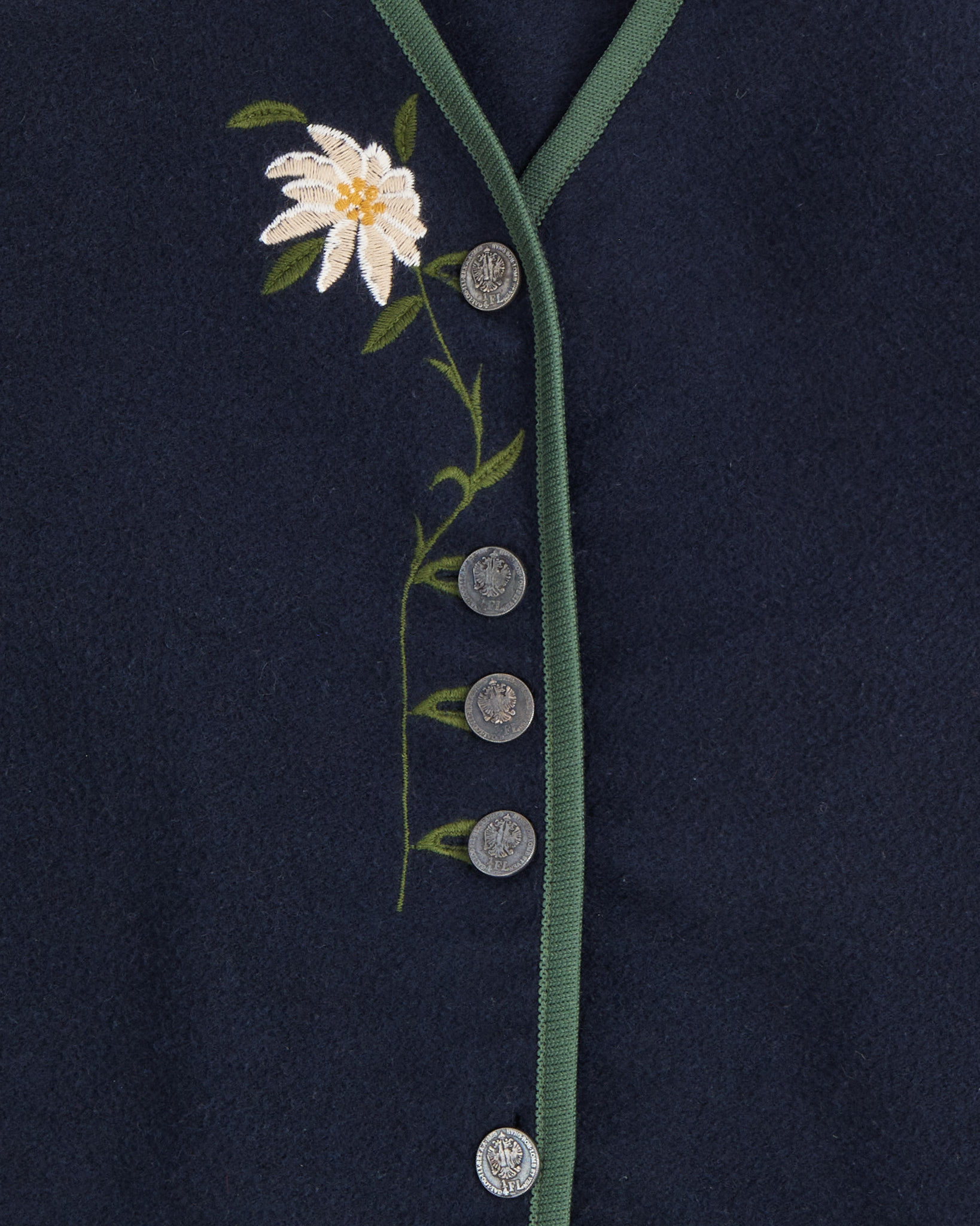 Винтажный жакет в стиле традиционной австрийской одежды. Выполнен в насыщенном темно-синем цвете с отделкой контрастным зеленым кантом. Вышивка в виде цветка эдельвейса на груди и декоративные металлические пуговицы с гербами, напоминающие старинные монеты