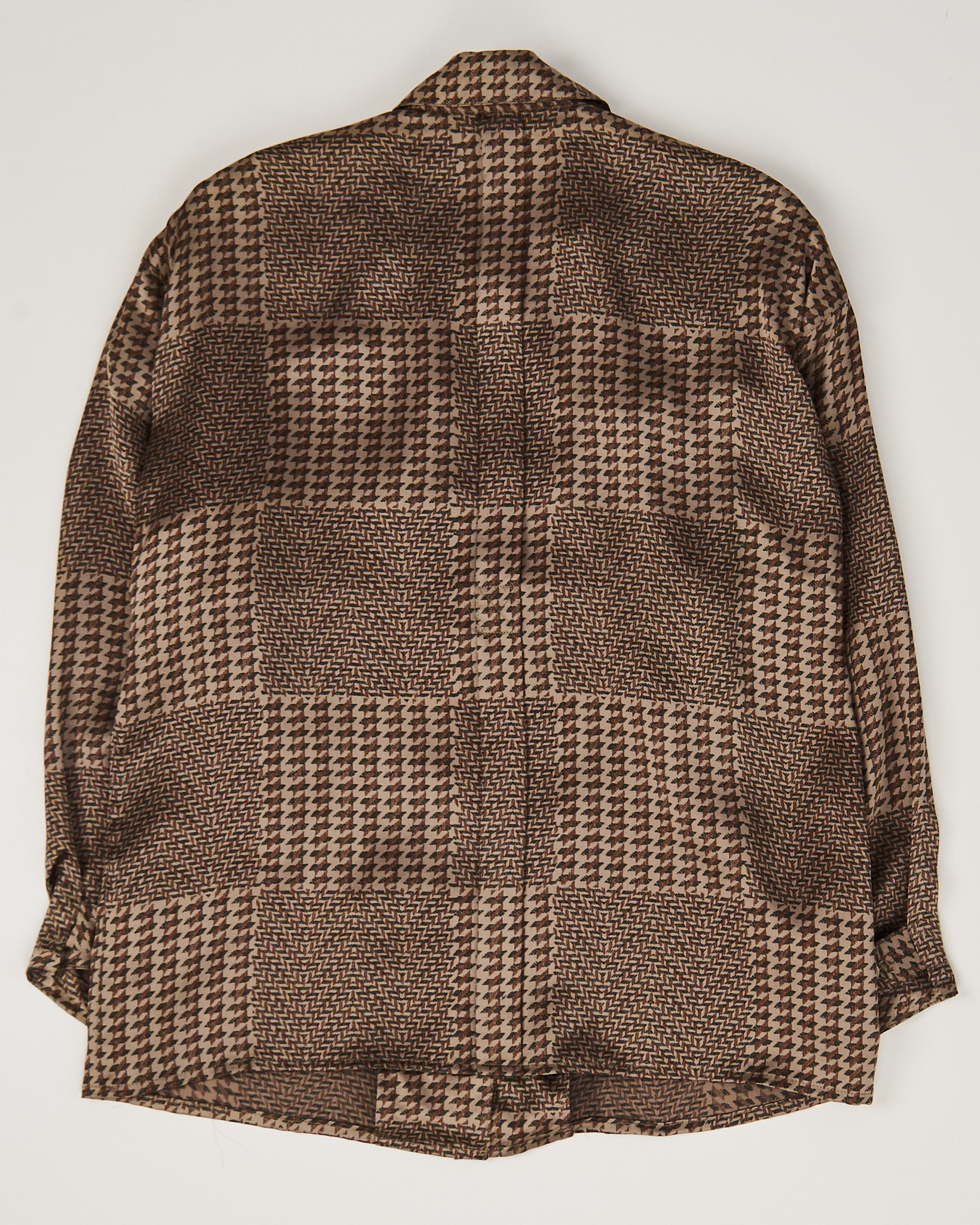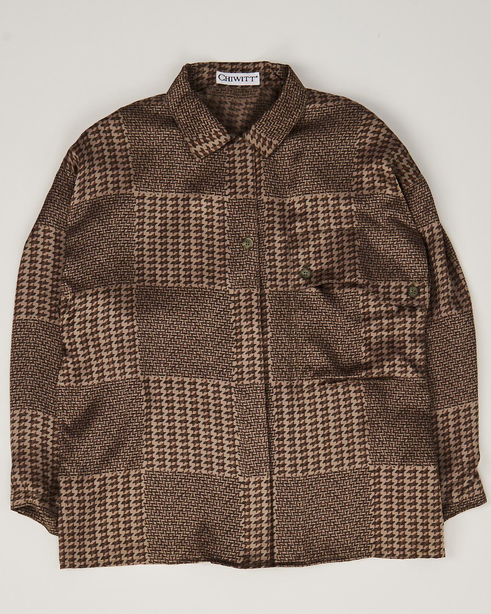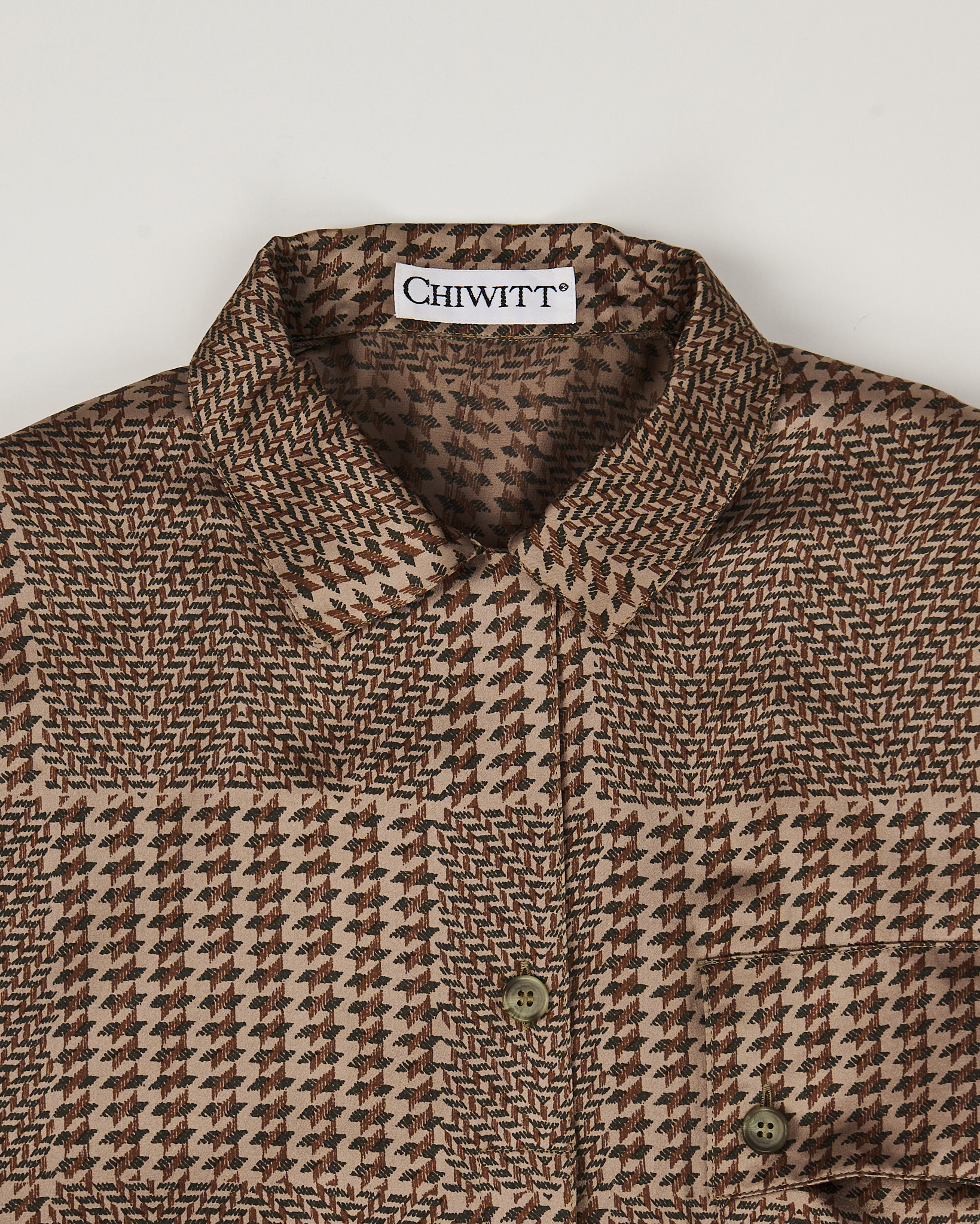 Блуза из лёгкого гладкого шелка Chiwitt. Материал тонкий, приятный на ощупь. Прямой крой, свободная посадка, удобные подплечники. Геометричный узор, нагрудный карман и аккуратные пуговицы.