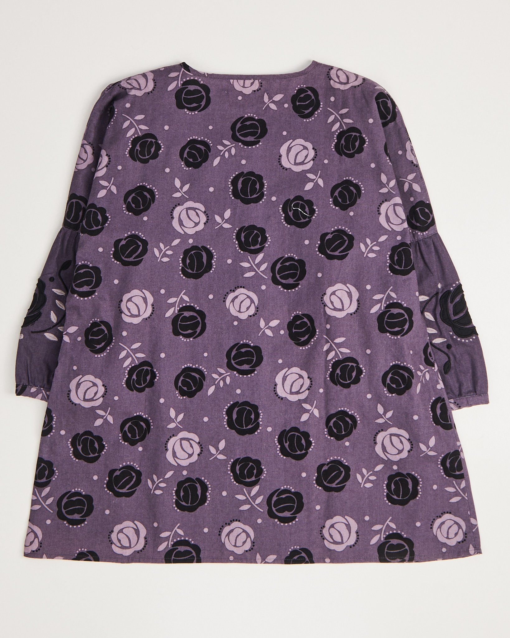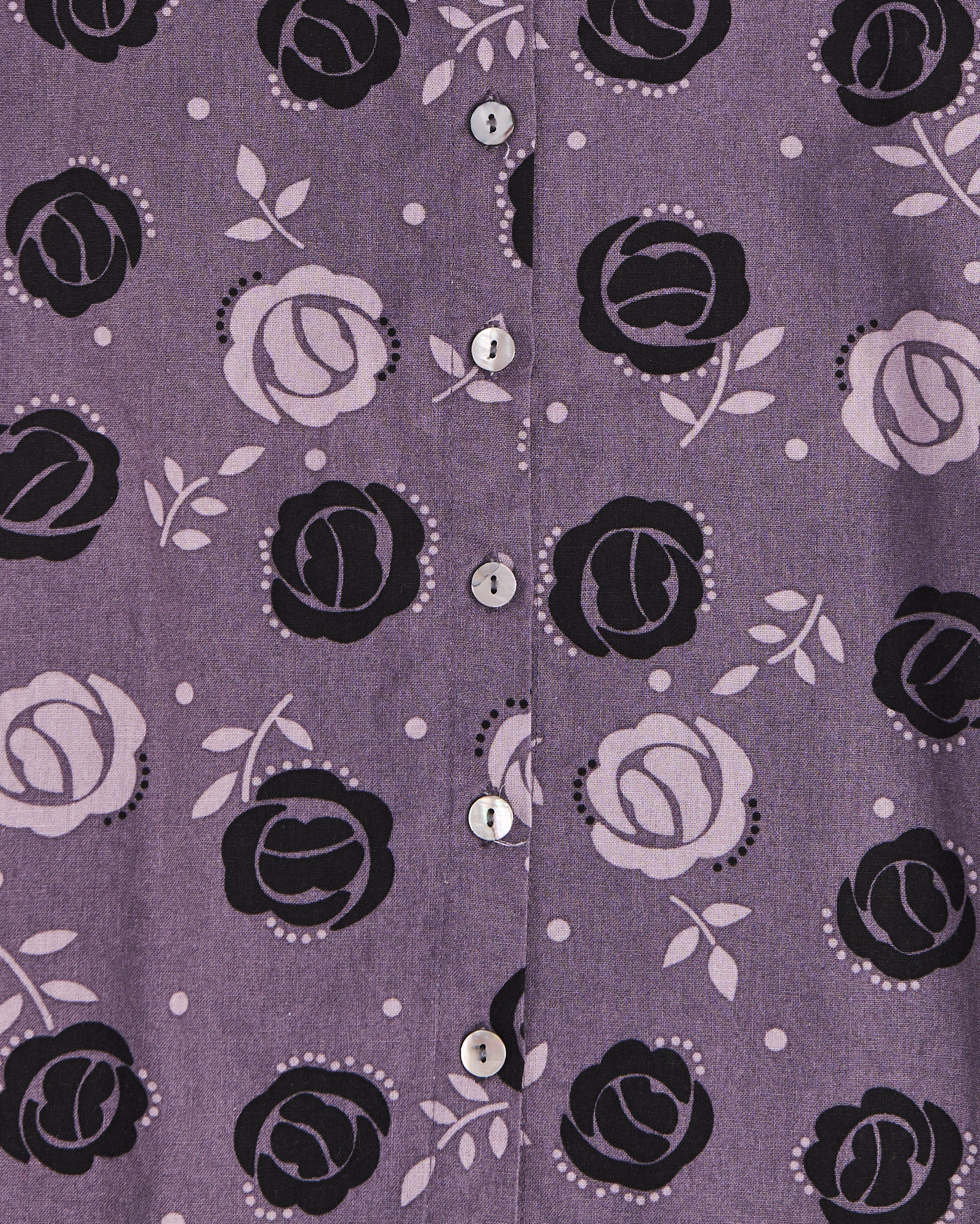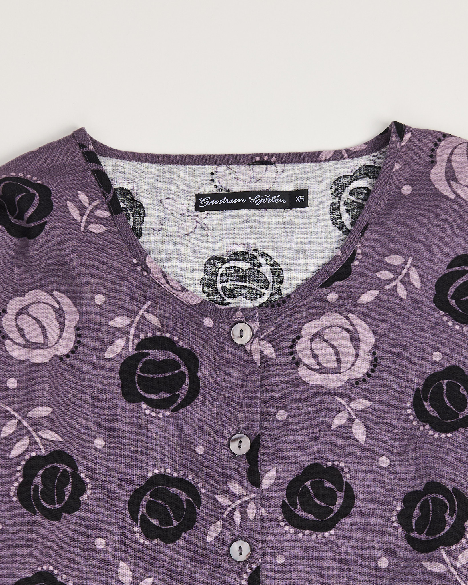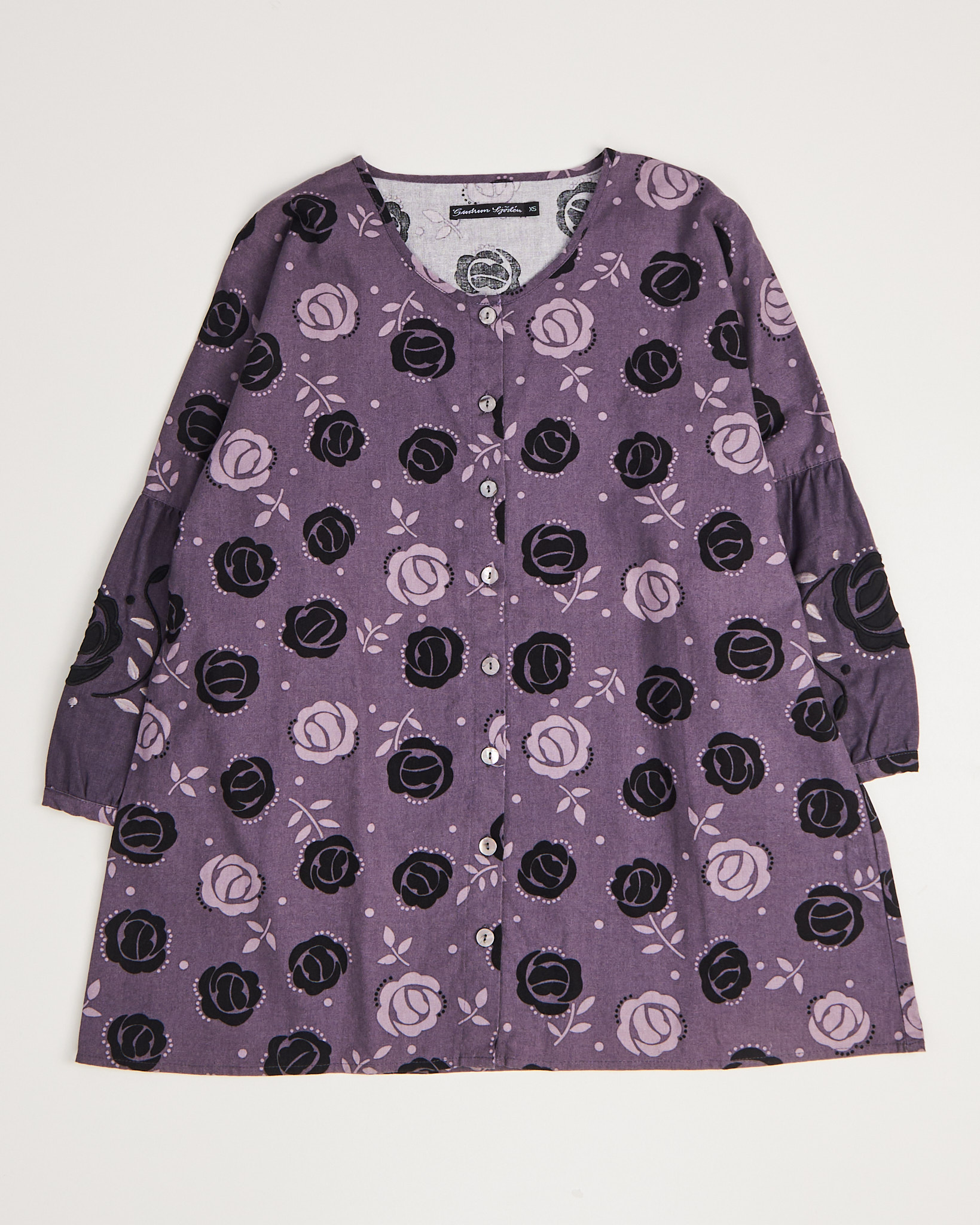 Блуза от шведского бренда Gudrun Sjoden известного работой с натуральными материалами и авторскими принтами, лилово - фиолетового цвета с контрастным цветочным принтом. Свободная посадка. Силуэт расширяется к низу. Круглый вырез с небольшим разрезом и рядом пуговиц. Рукава с легким объемом и мягкой сборкой в зоне локтя.