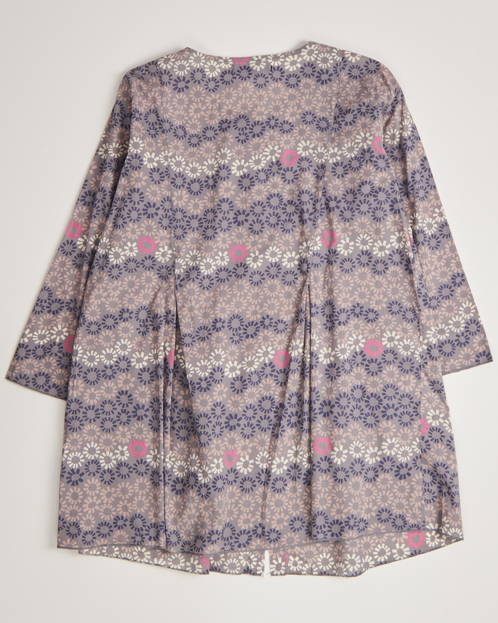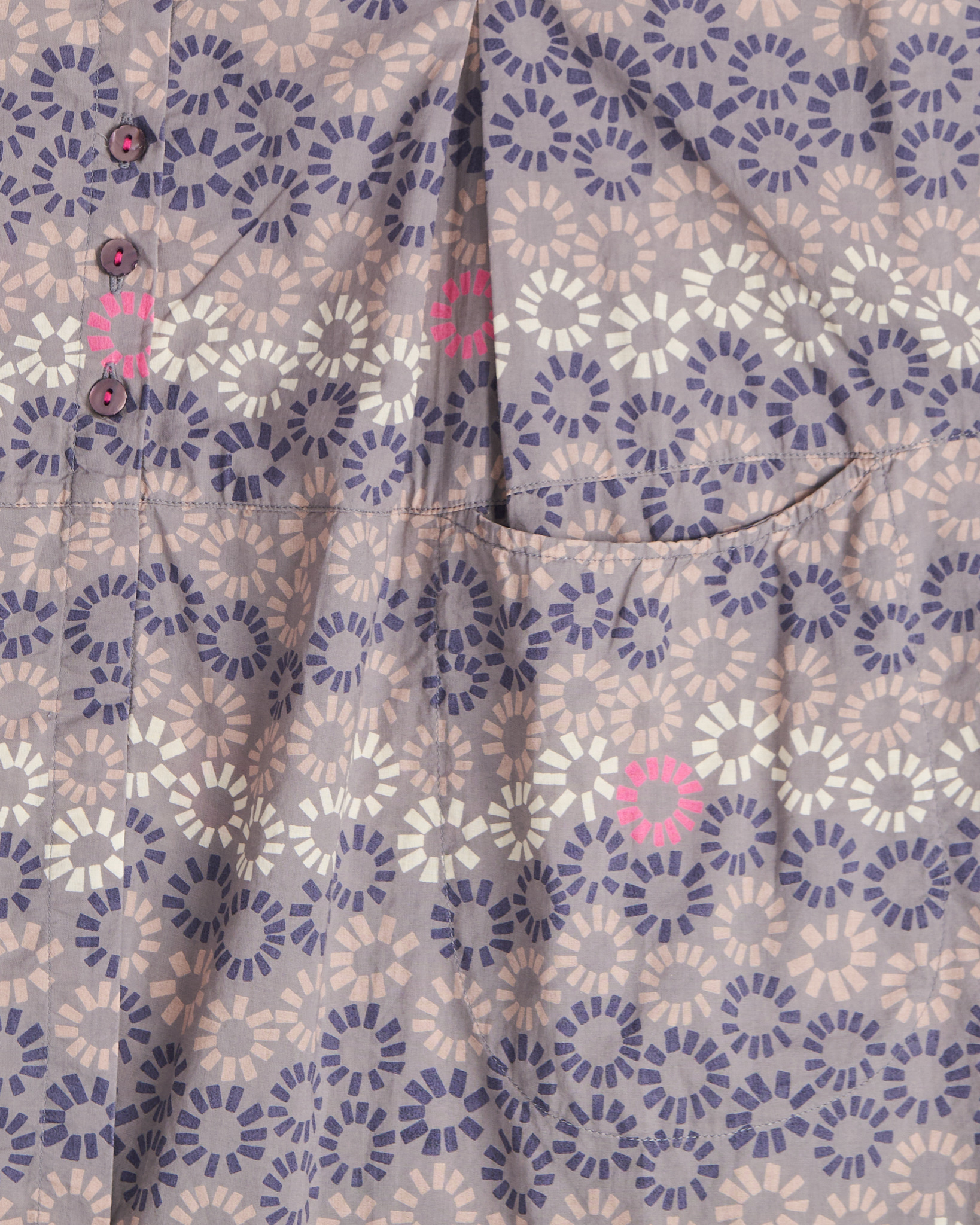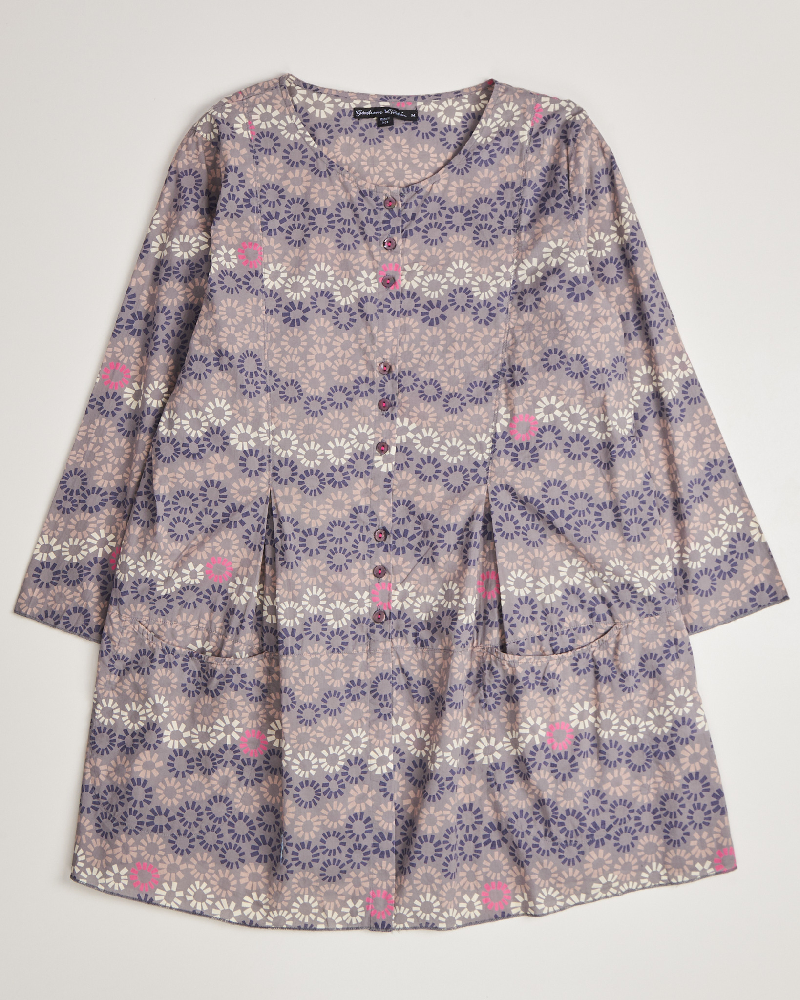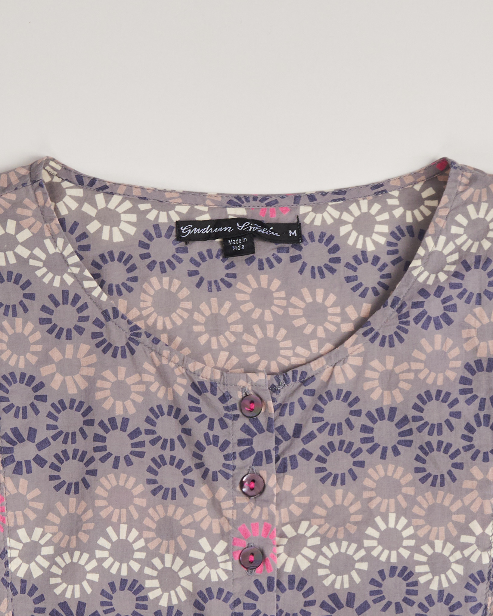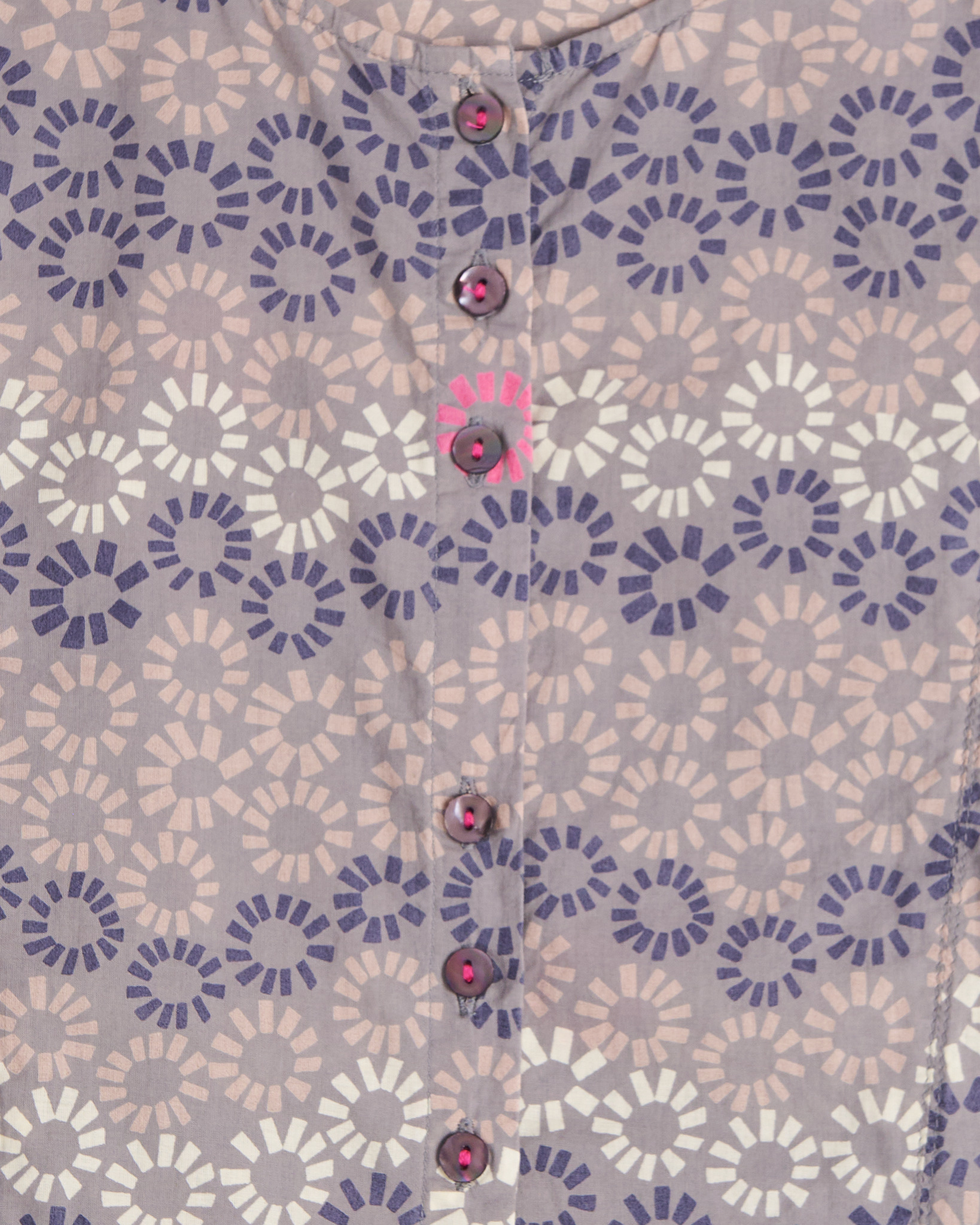 Блуза Gudrun Sjoden серого цвета с геометрическим повторяющимся рисунком с яркими акцентами. Свободная посадка. Длина прикрывает бедра. Круглый вырез с короткой планкой на пуговицах с легким блеском.
