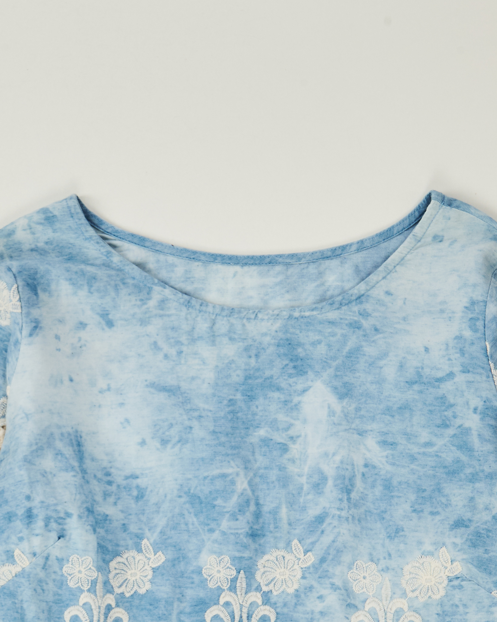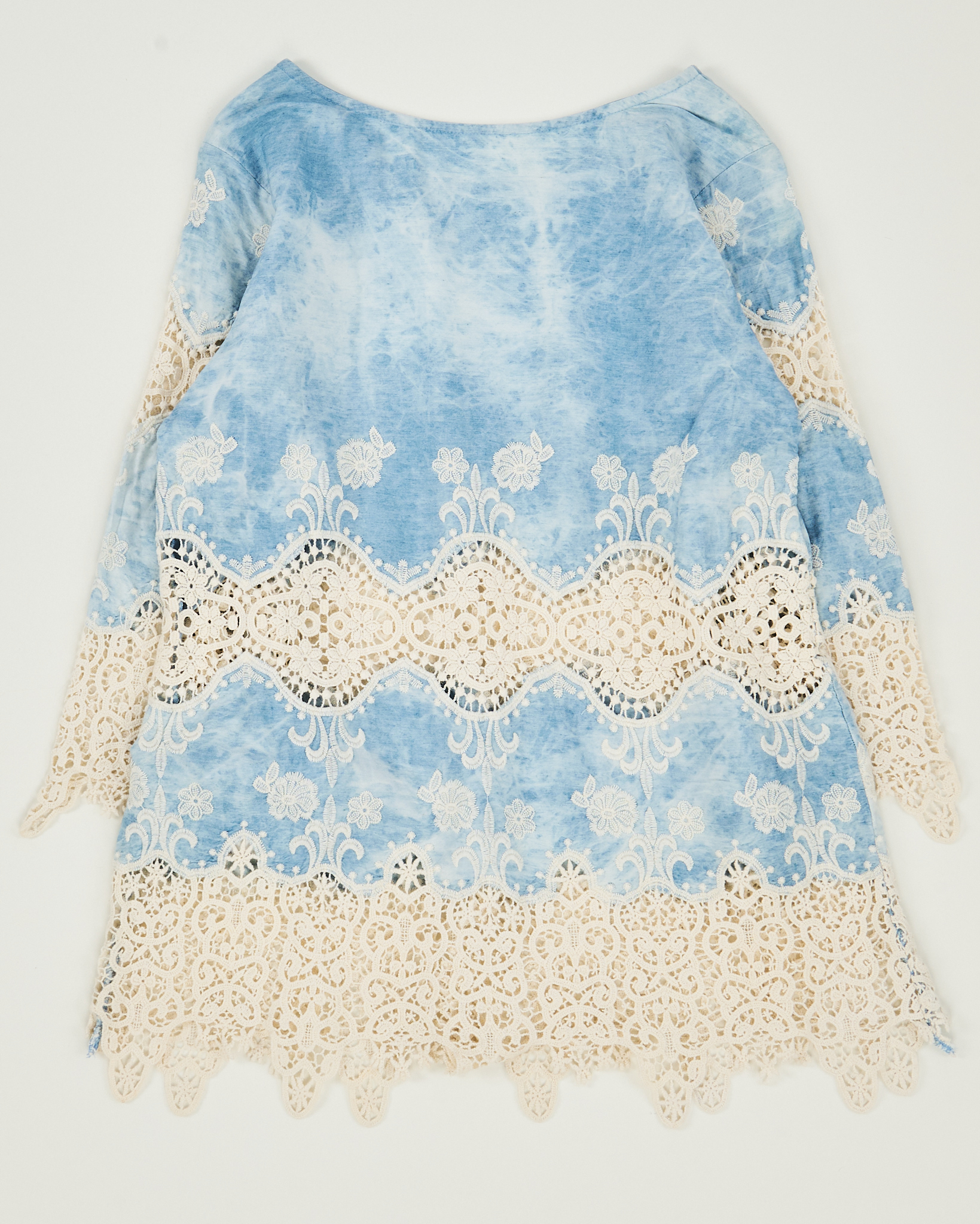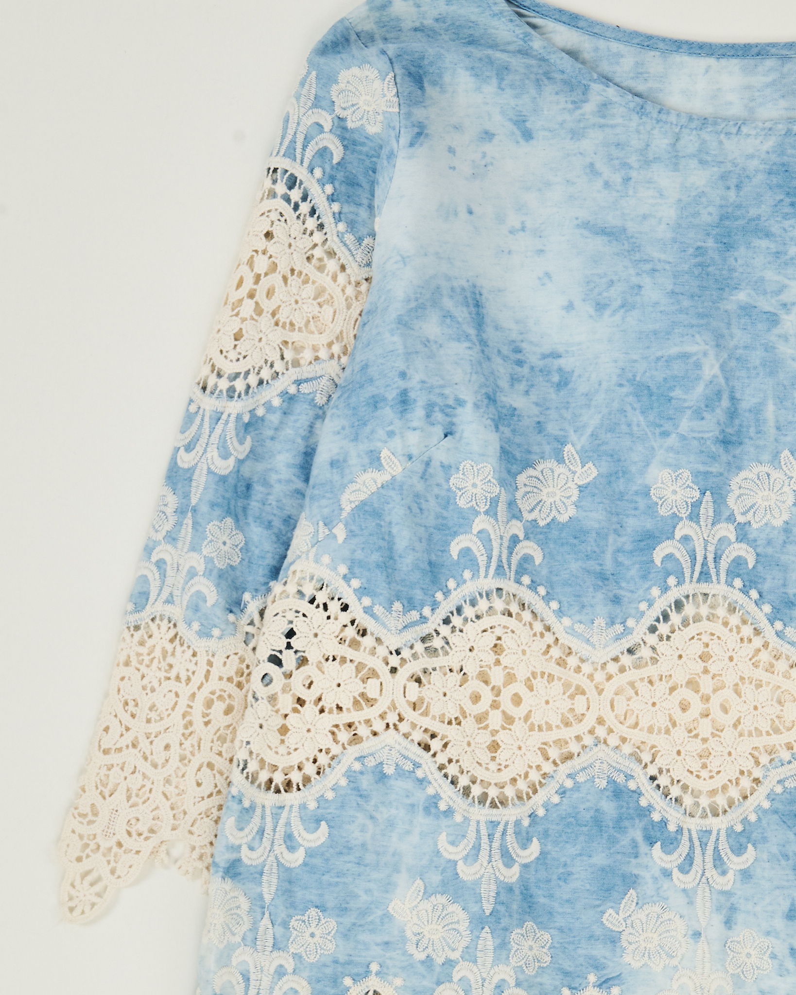 Блуза из хлопка голубого оттенка с контрастными кружевными вставками и вышивкой. Ткань мягкая, лёгкая. Посадка свободная, кружевные вставки придают вещи акцент.