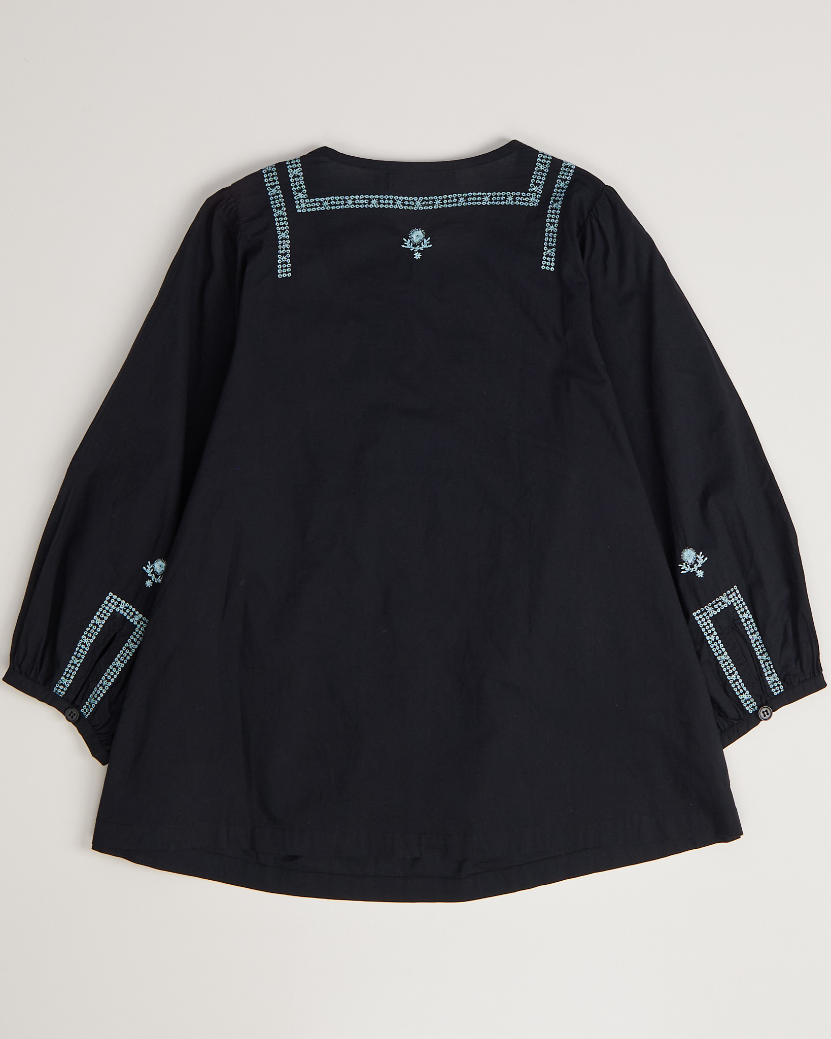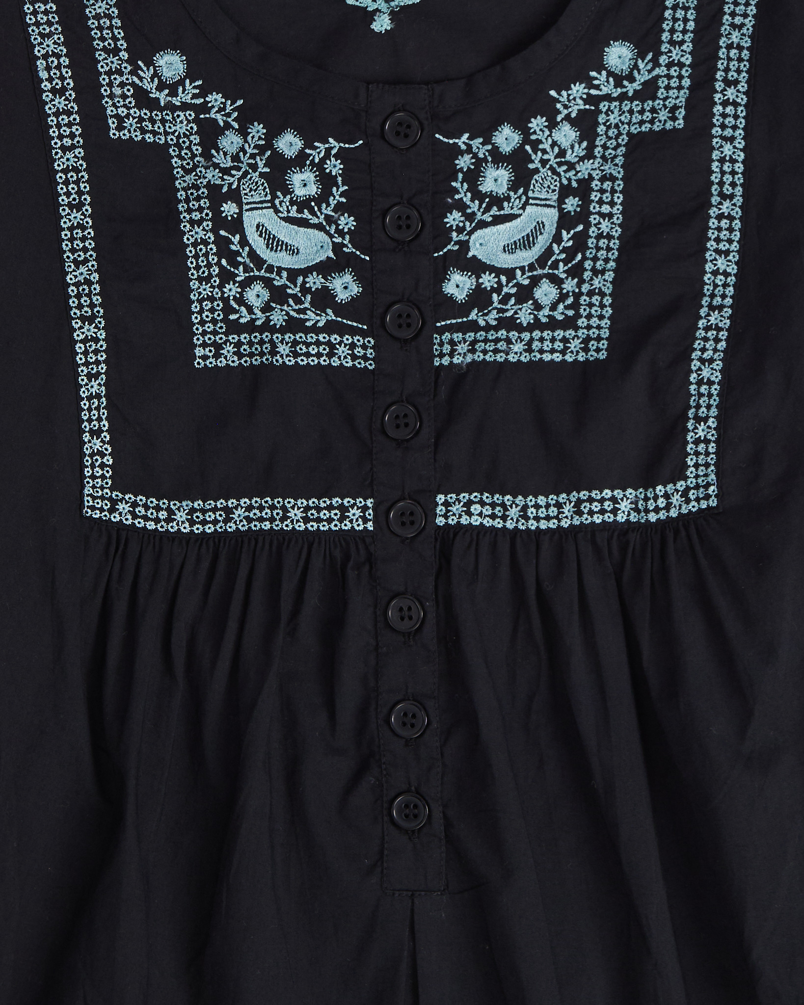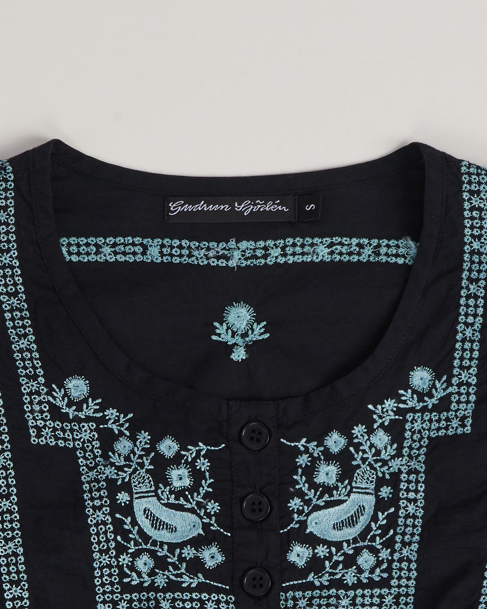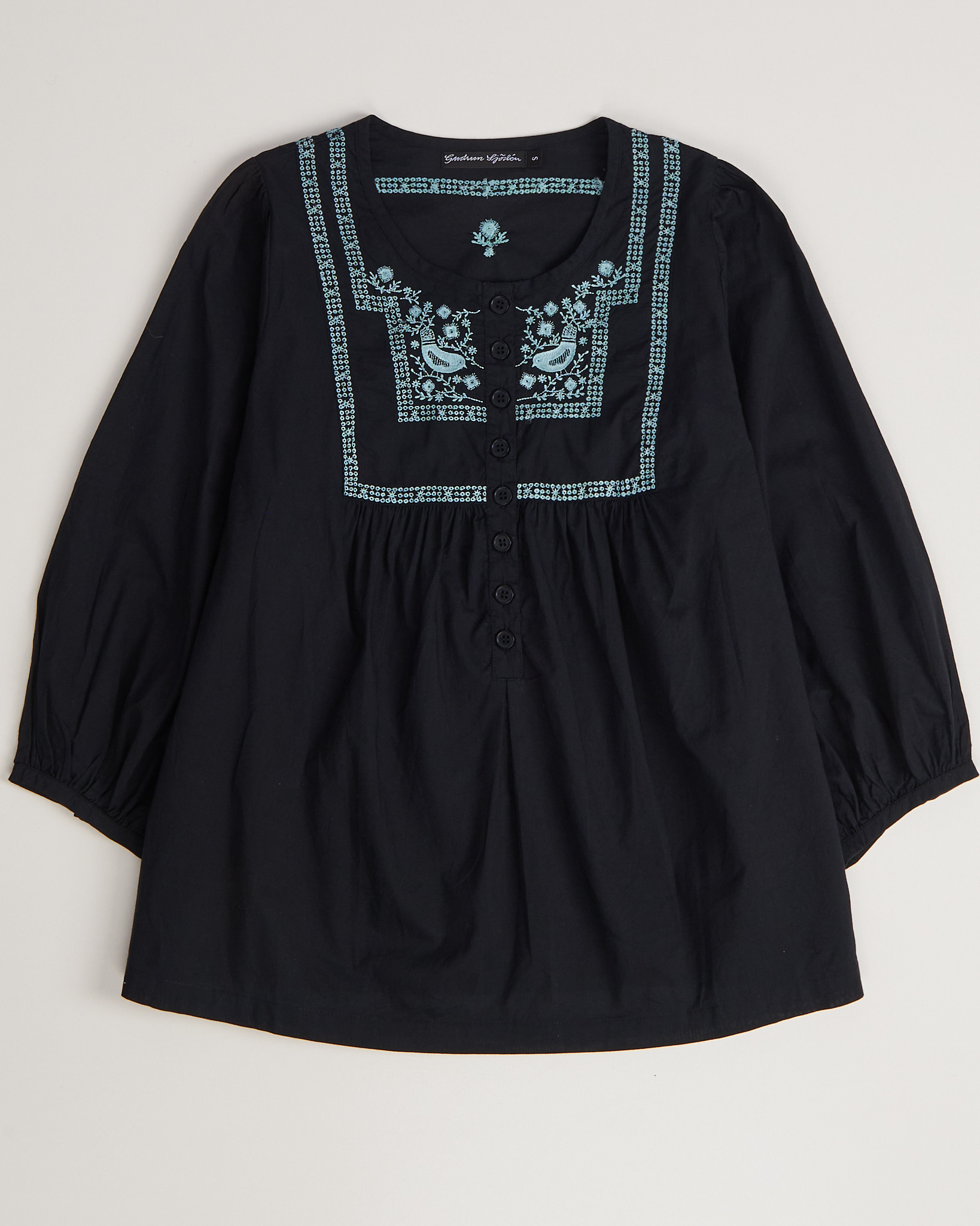 Блуза Gudrun Sjödén из хлопка в чёрном цвете с  вышивкой. Посадка свободная, рукава объёмные с мягкой сборкой. Материал лёгкий, приятный к телу. Застёжка на пуговицы по центру, круглый вырез, декоративная планка с орнаментом. Вышивка с растительными мотивами и птицами придает акцент.