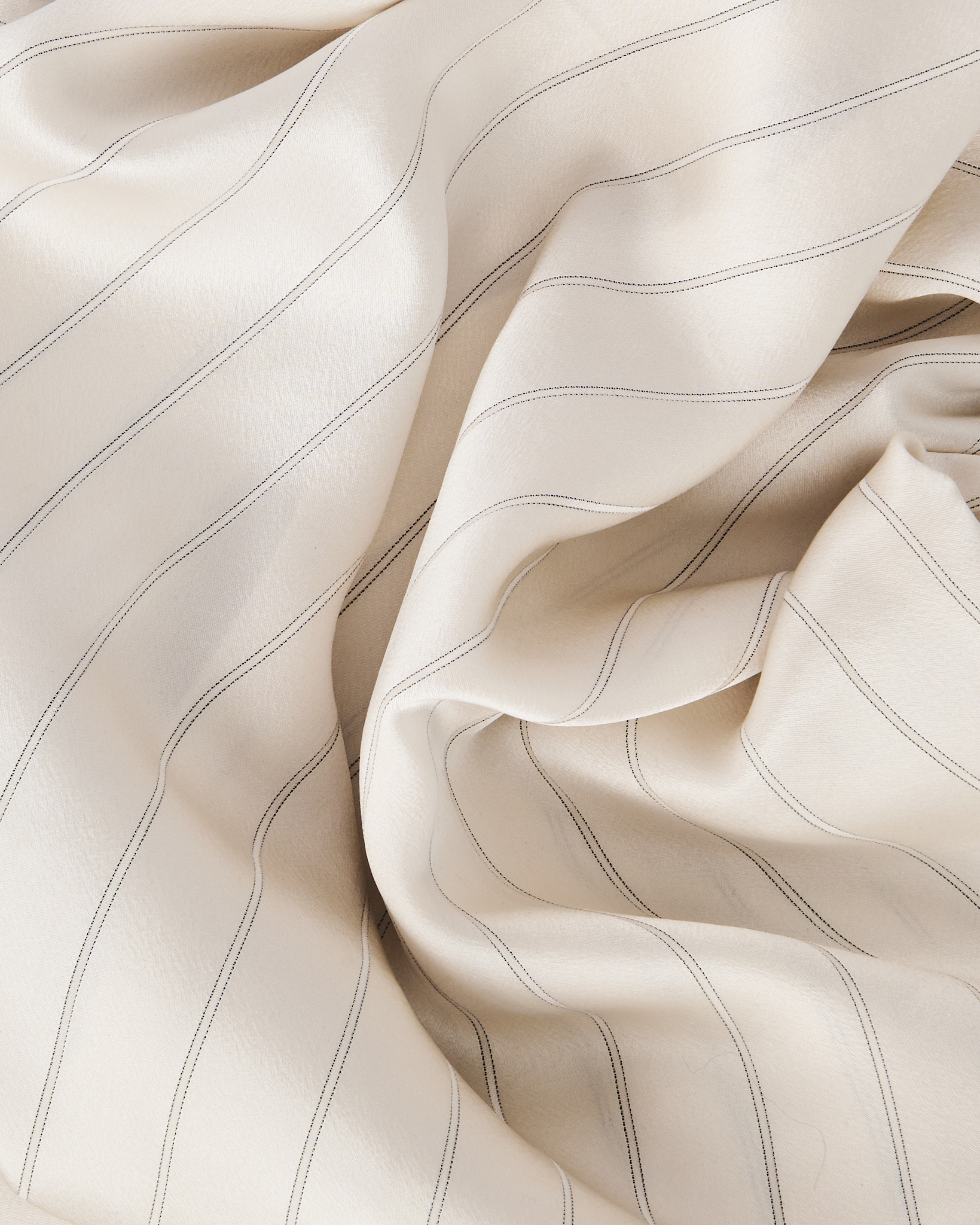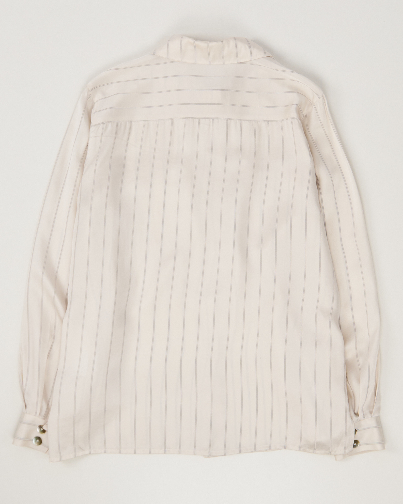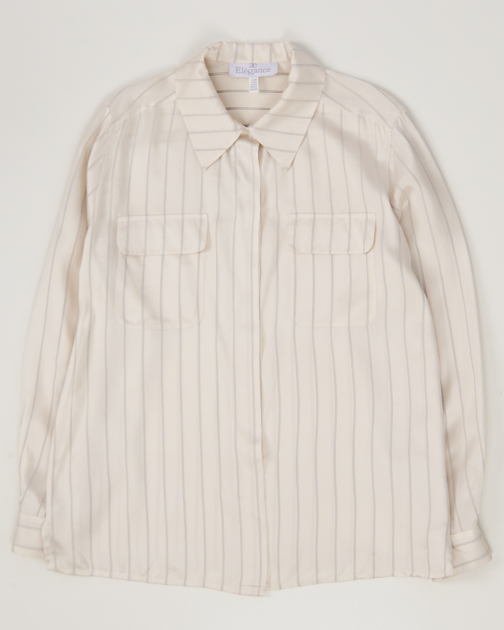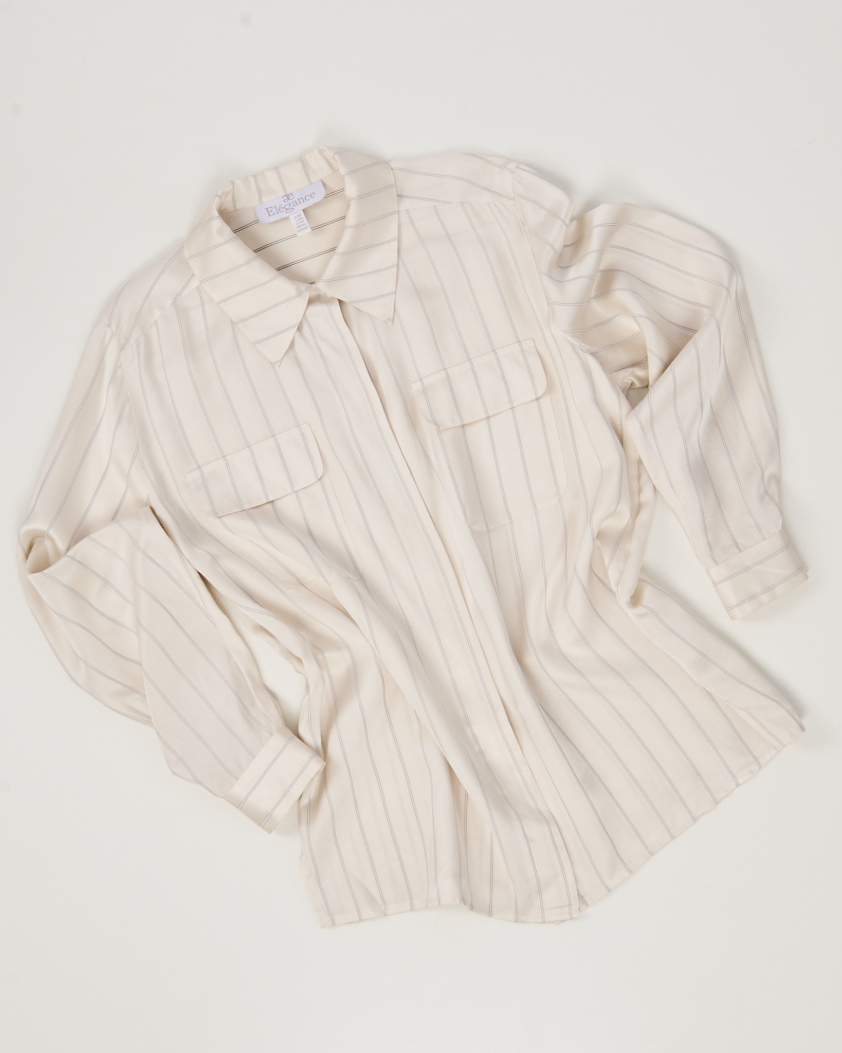 Рубашка из лёгкого натурального шелка  кремового оттенка с тонкой вертикальной полоской. Материал гладкий, посадка свободная, силуэт прямой. Два накладных кармана и скрытая планка.