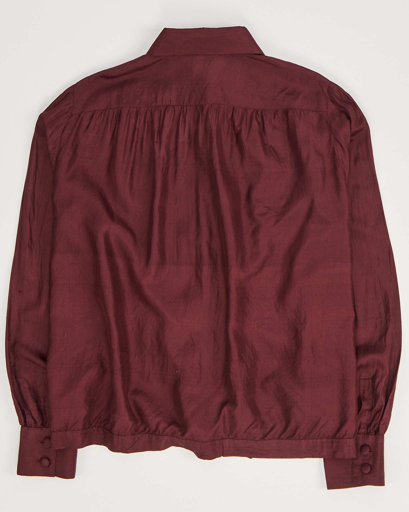 Блуза глубокого винного цвета из шелка. Нижний край дополнен завязкой. Тканевые пуговицы, рукава на манжете