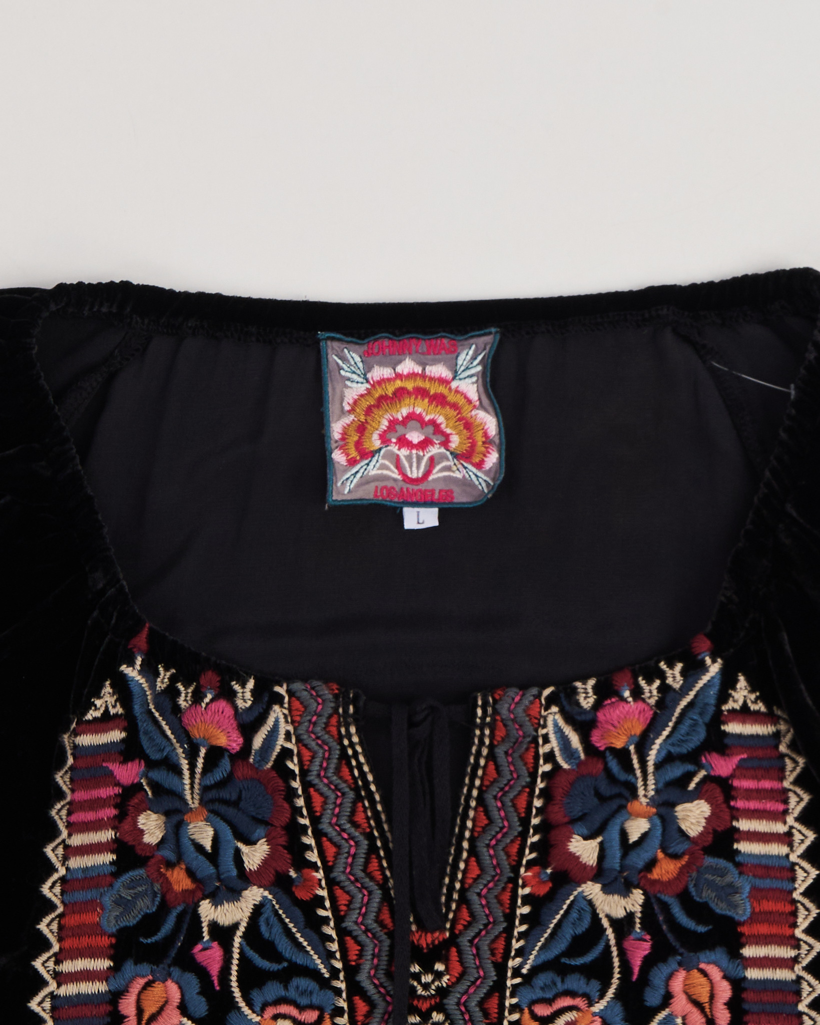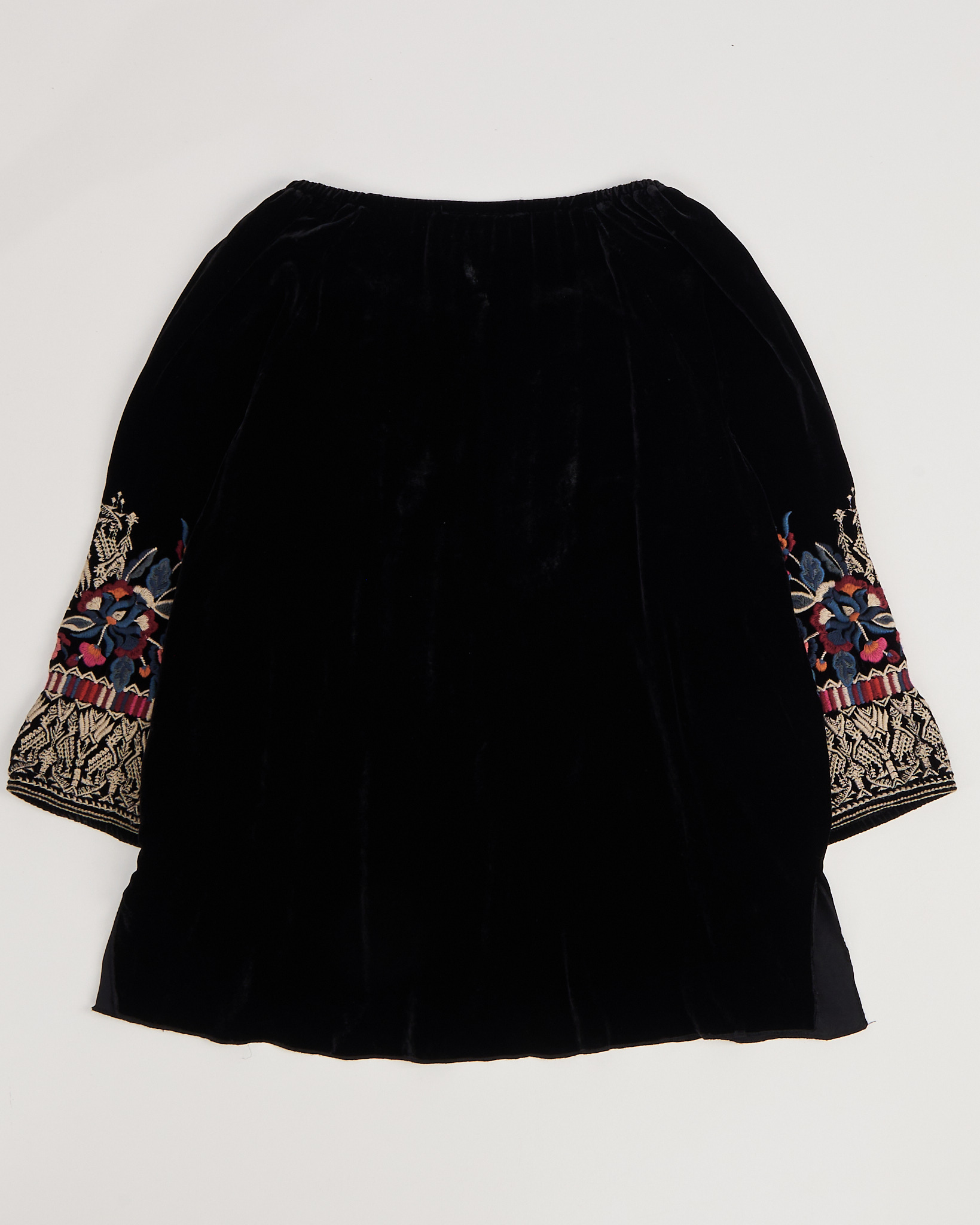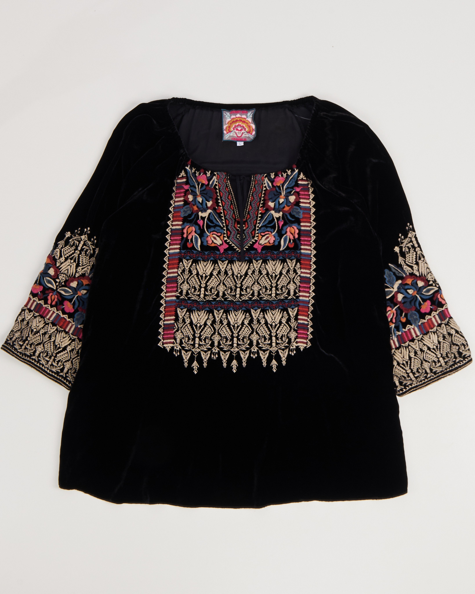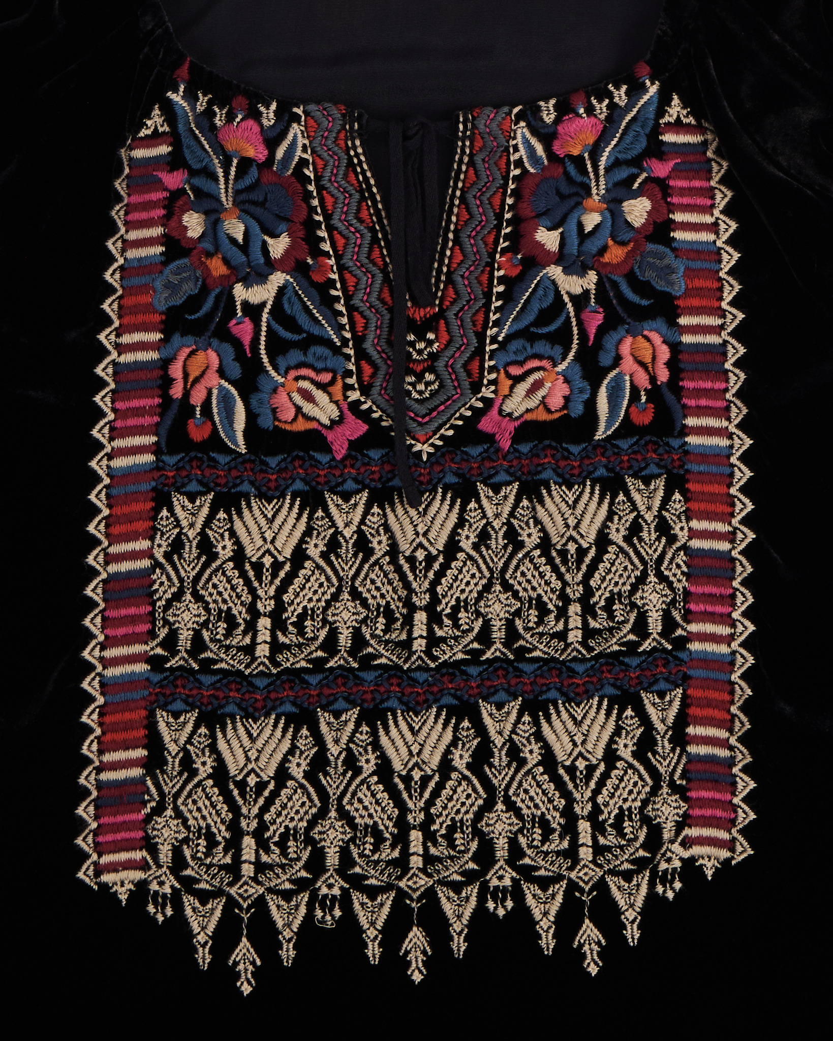 Блуза из вискозы и шелка с вышитым орнаментом. Прямой крой, свободная посадка. Воротник на кулиске, с завязкой на шнурок с кисточками, акцентные разрезы по бокам.