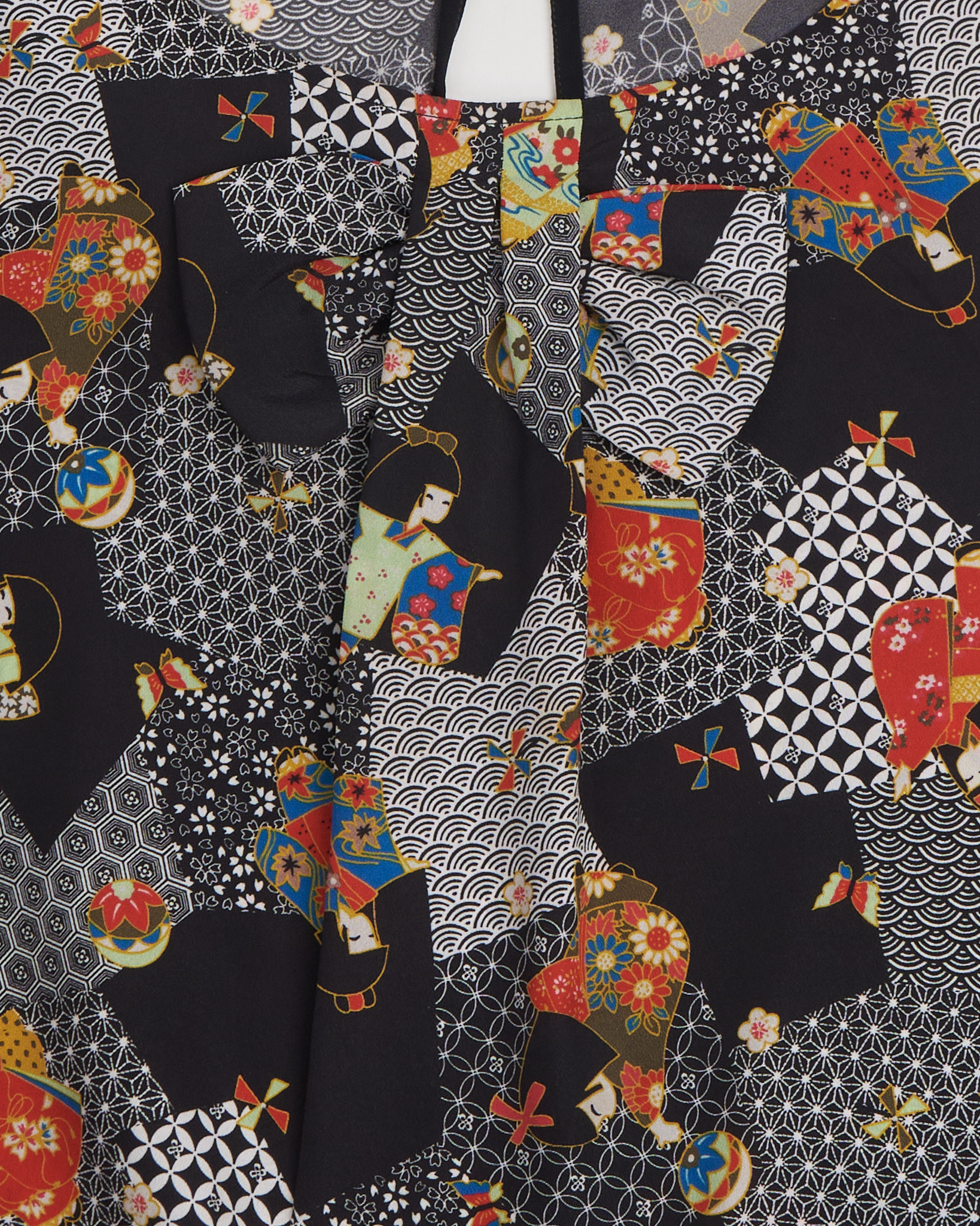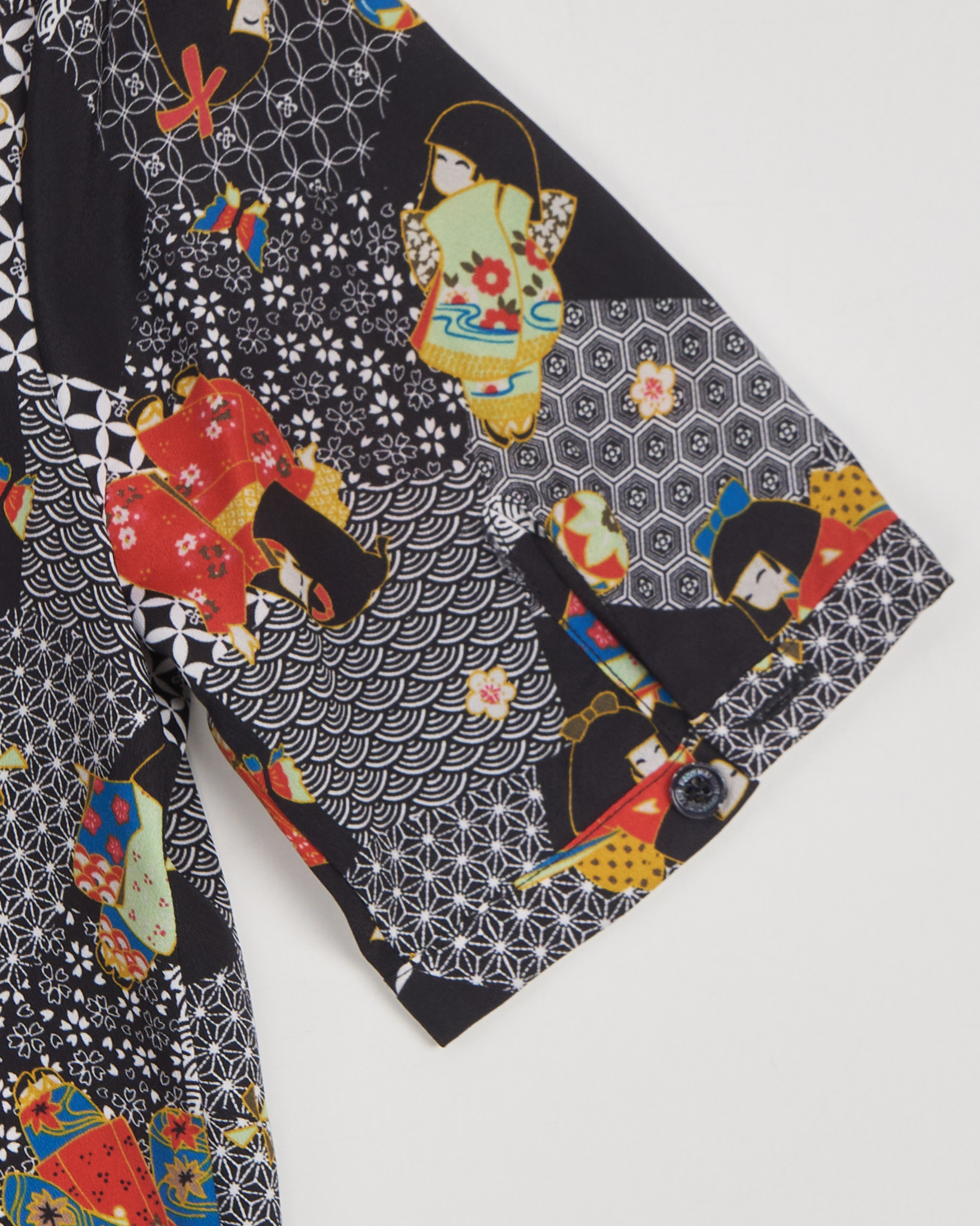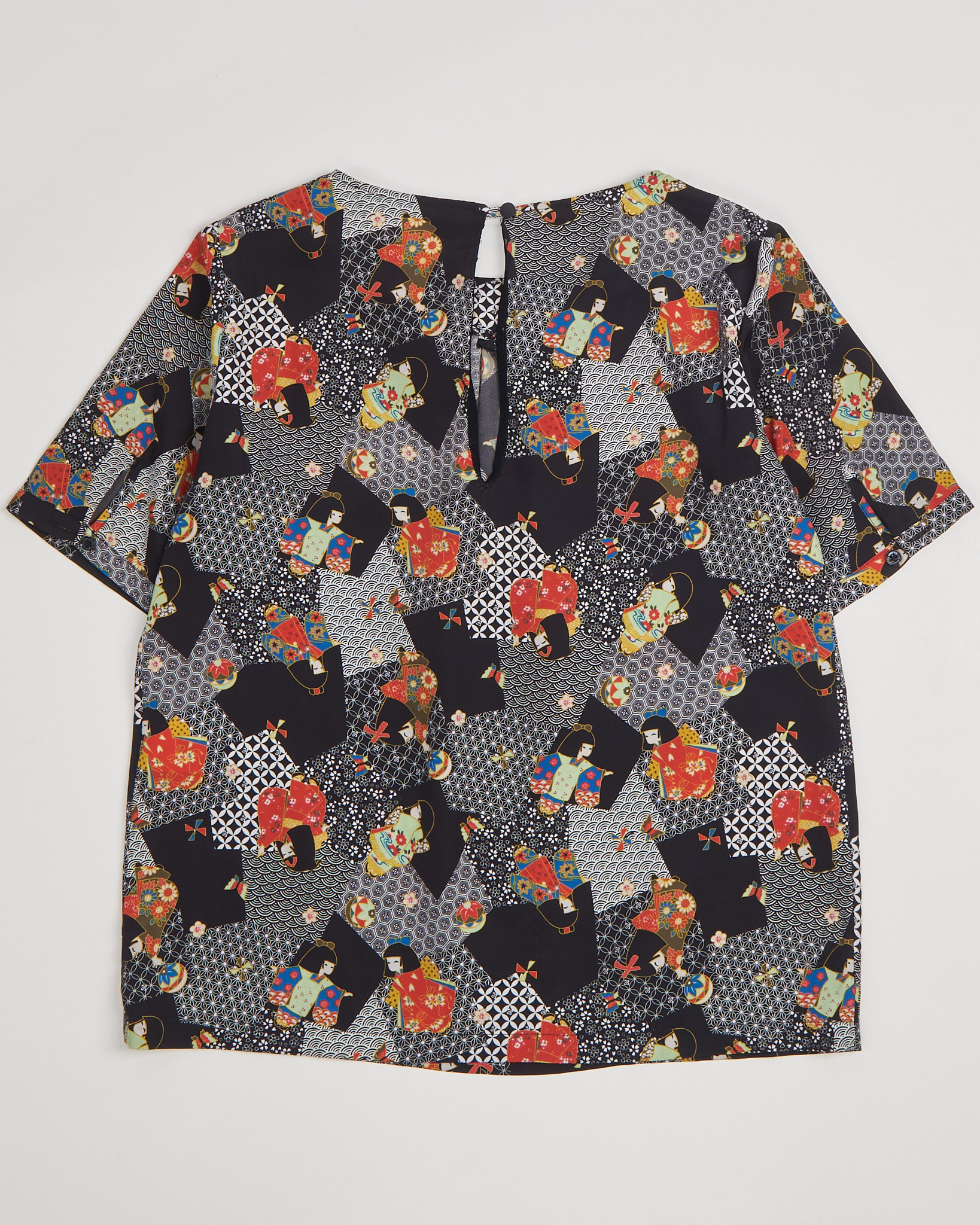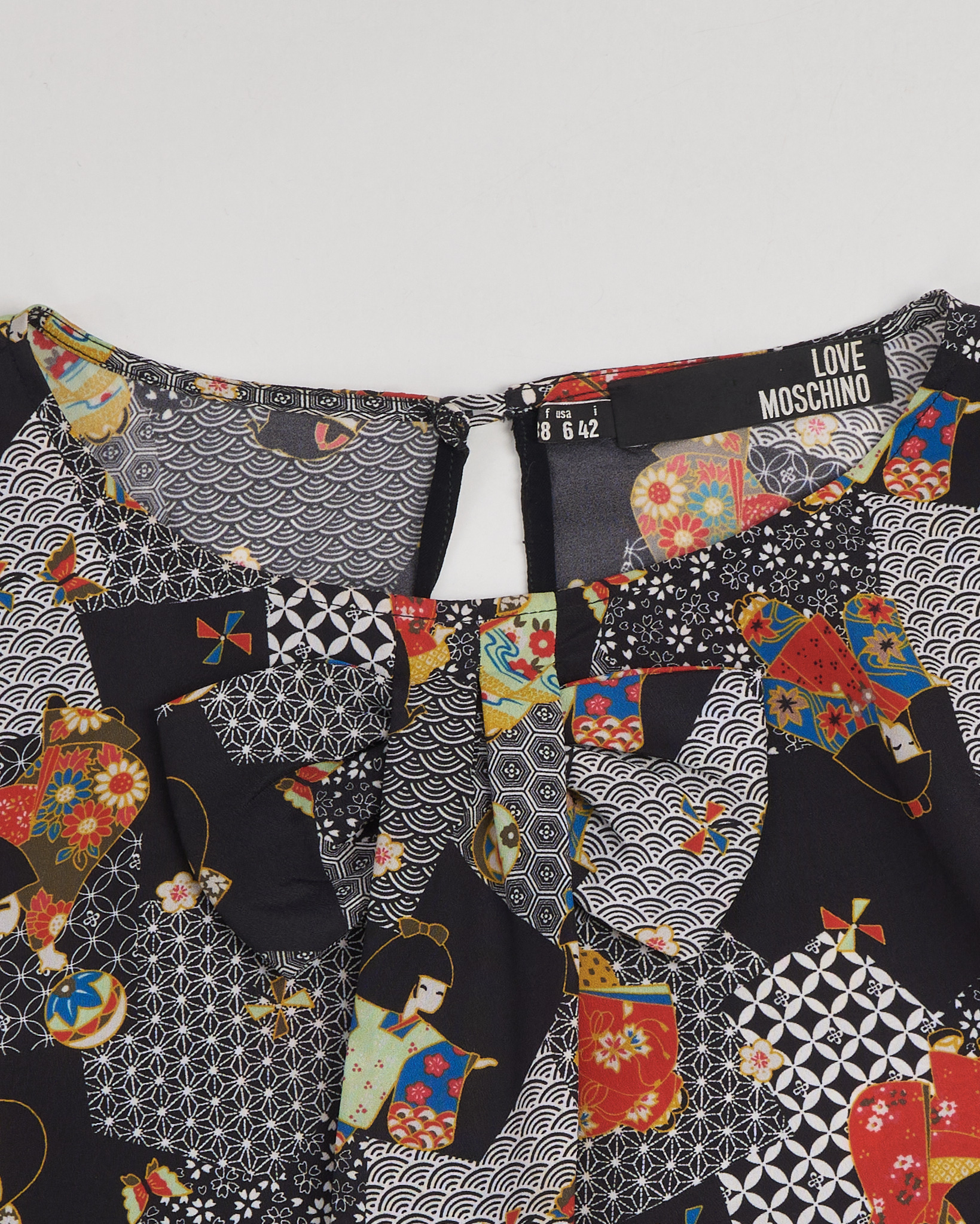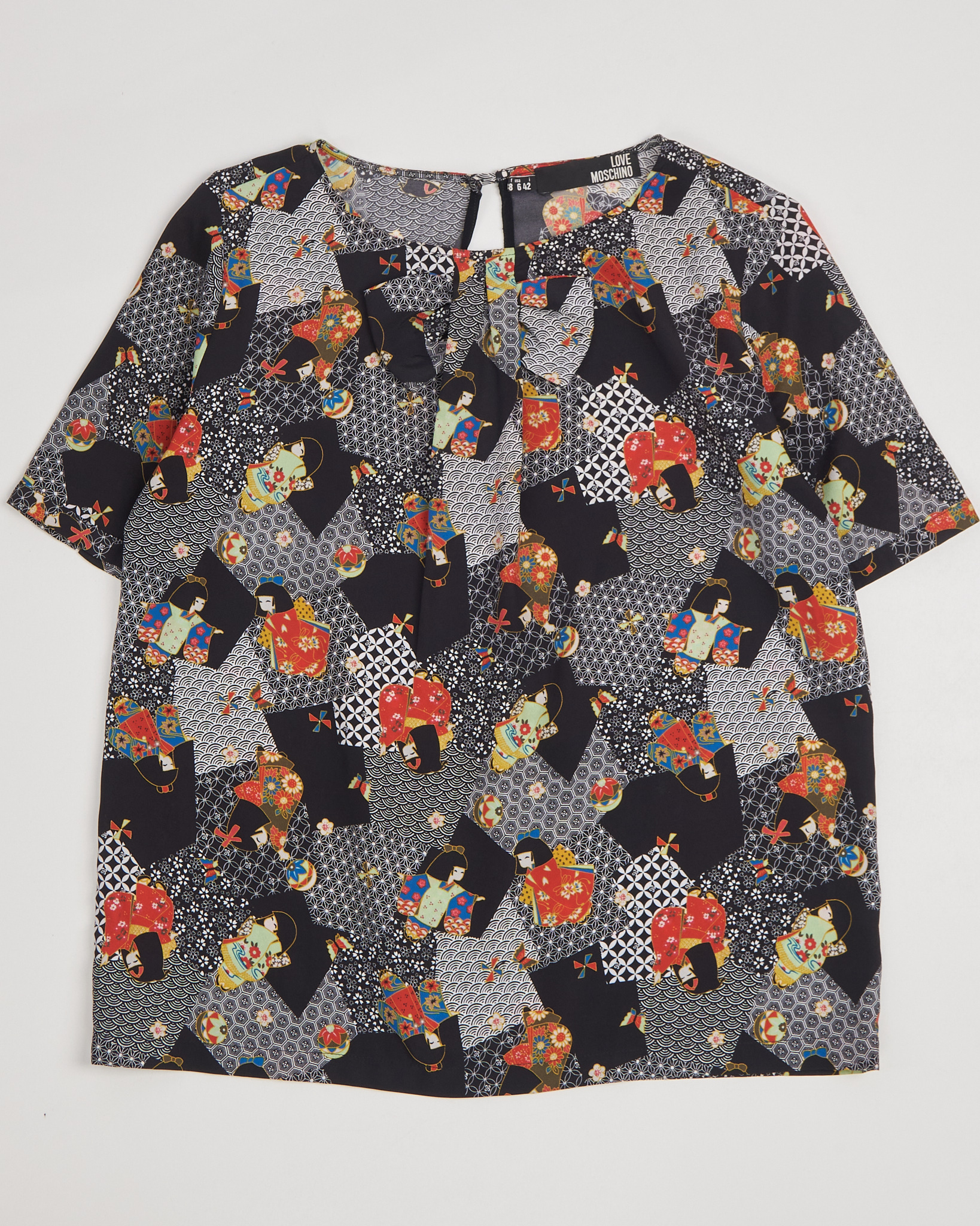 Блуза Love Moschino. Принт с японскими мотивами и контрастной геометрией. Свободной посадки, коротким рукавом и аккуратным вырезом с застёжкой сзади.