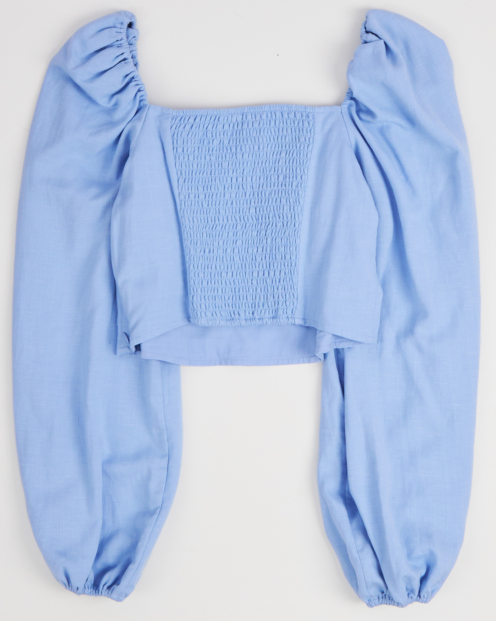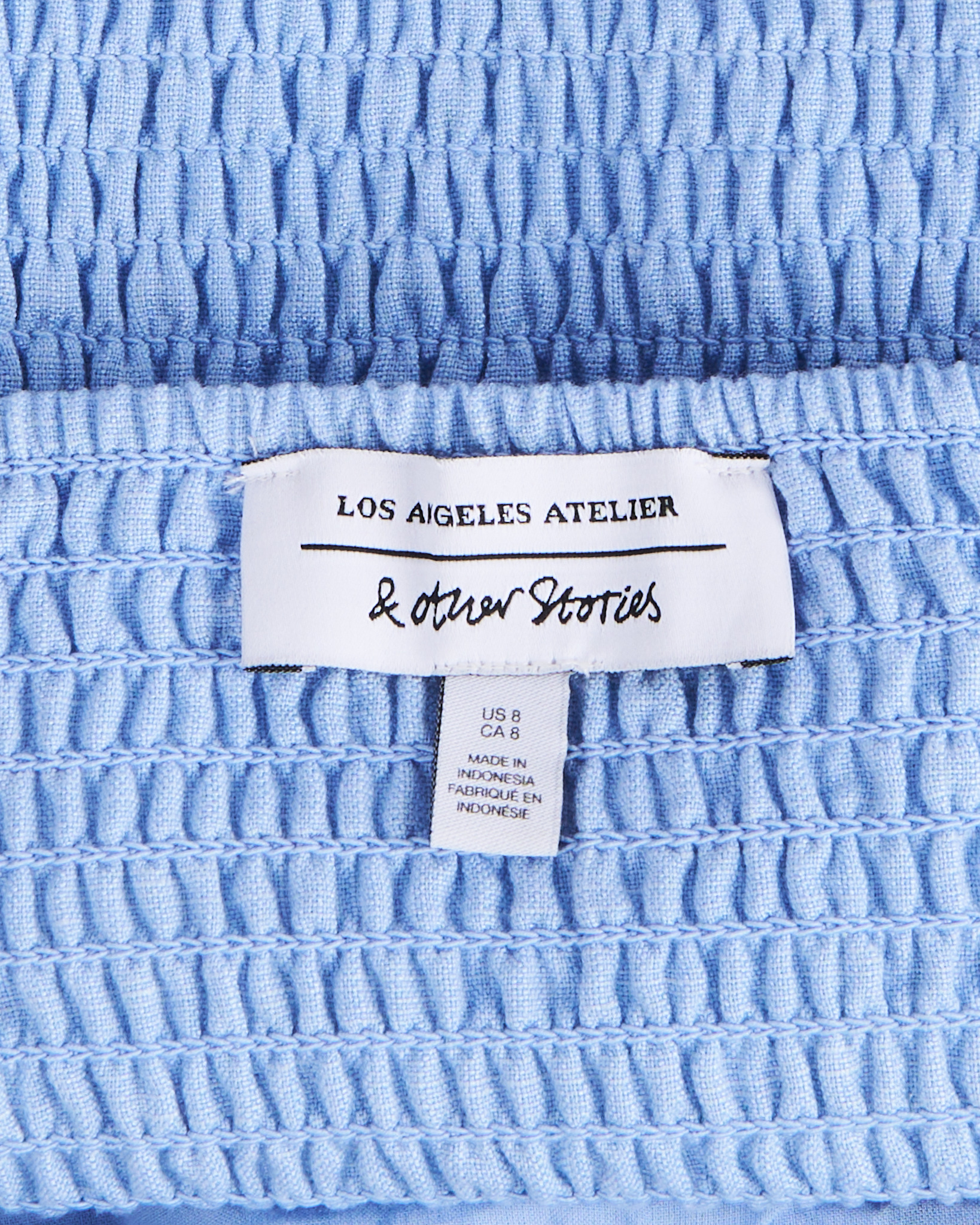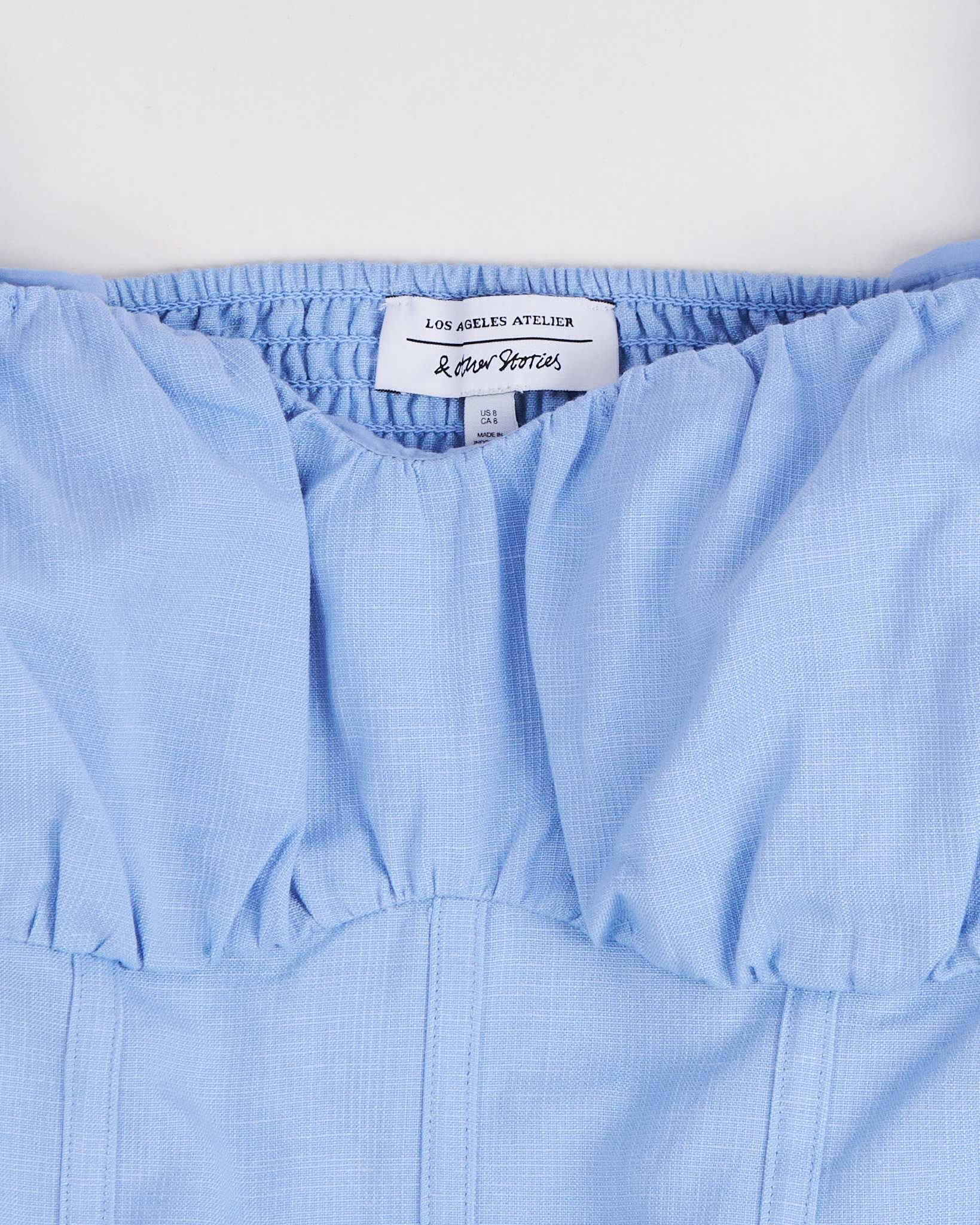 Топ & Other Stories из лёгкой вискозной ткани в светло-голубом оттенке. Посадка укороченная, лиф держит форму, спинка на эластичной сборке. Объёмные рукава с резинкой создают выразительный силуэт и акцент на плечах. Форма корсетного типа с рельефными швами.