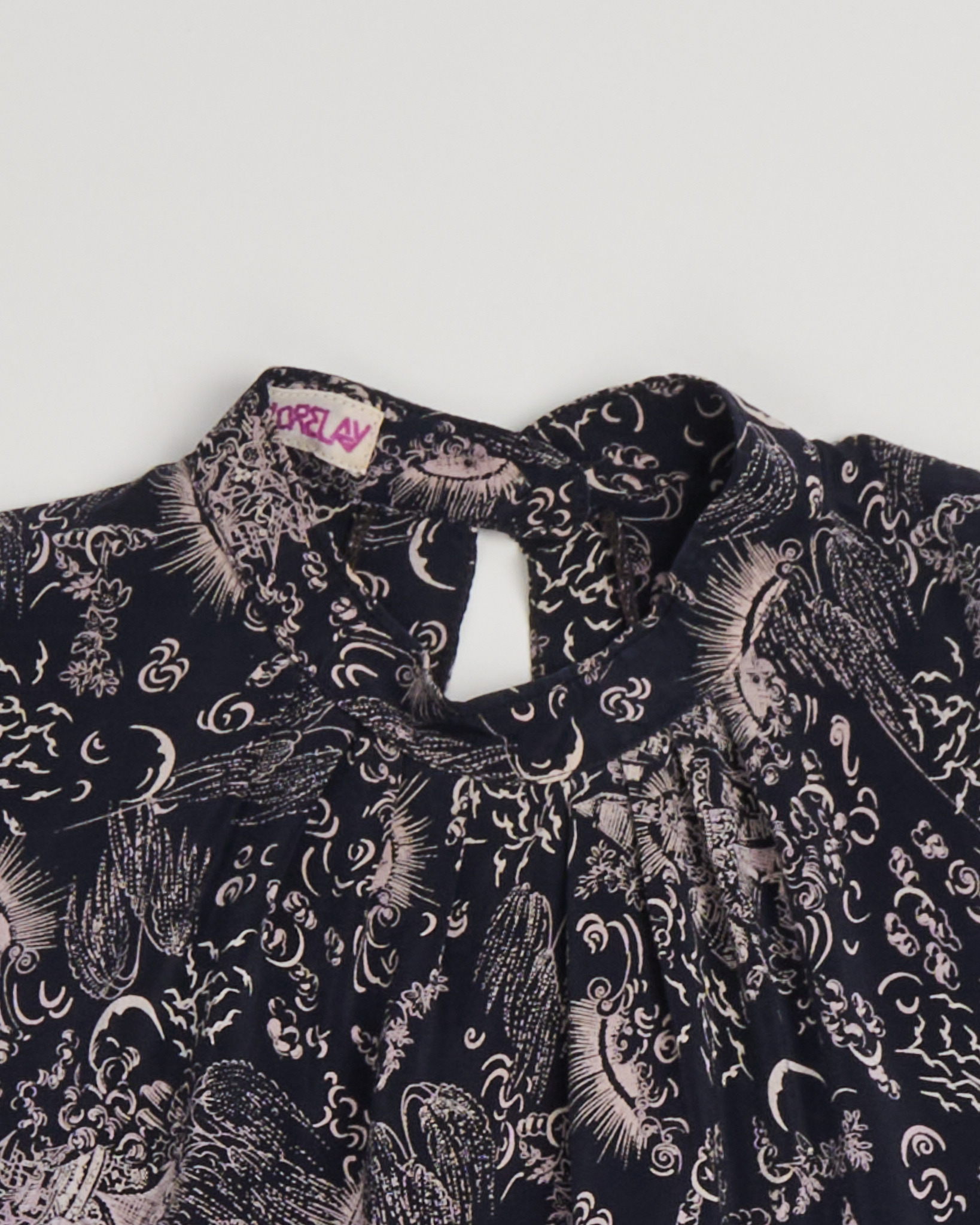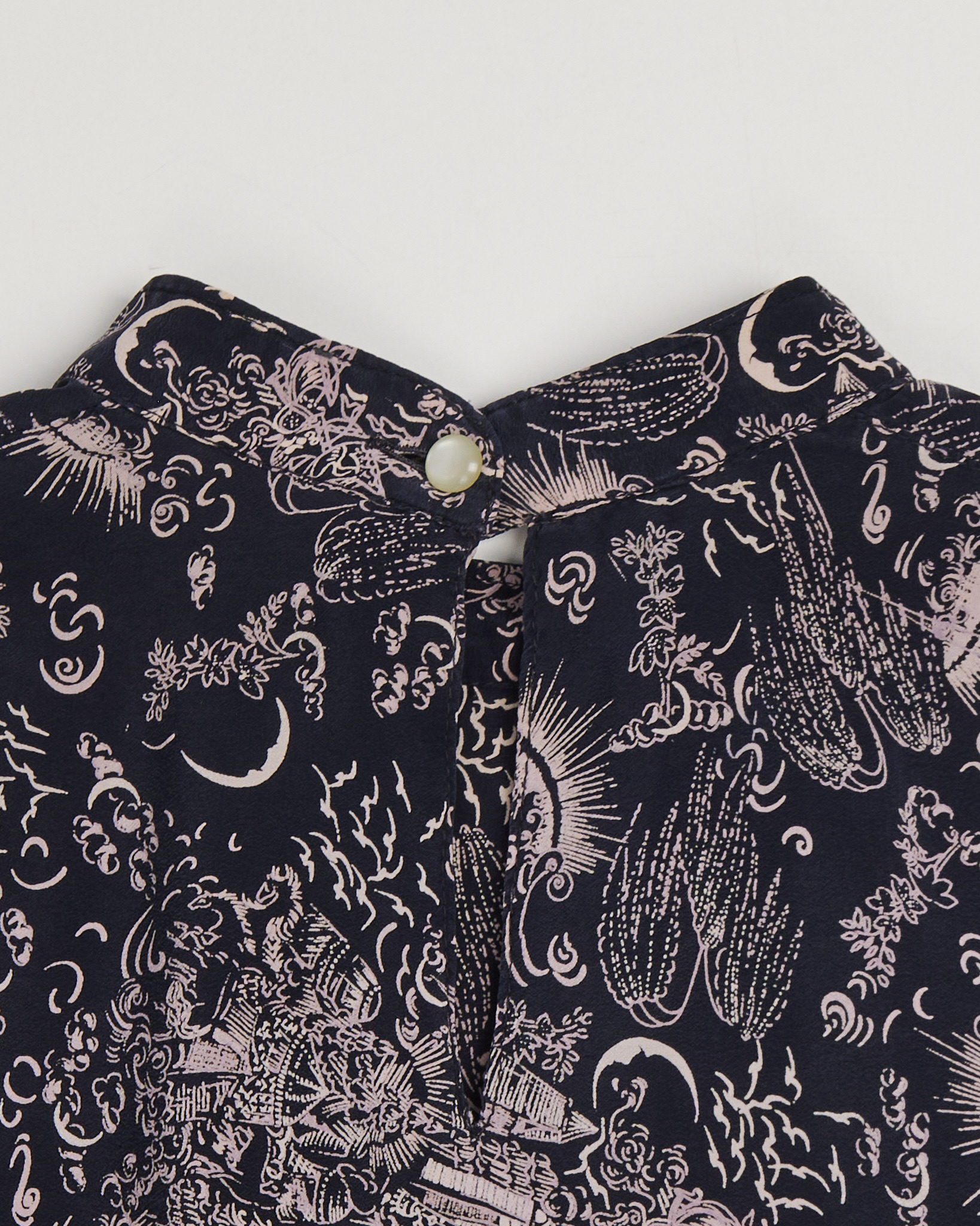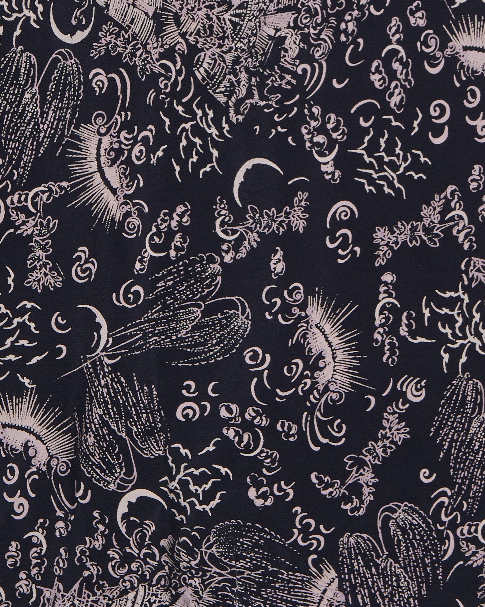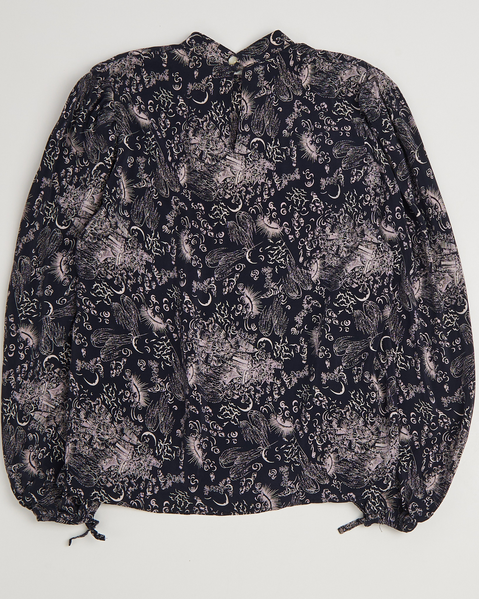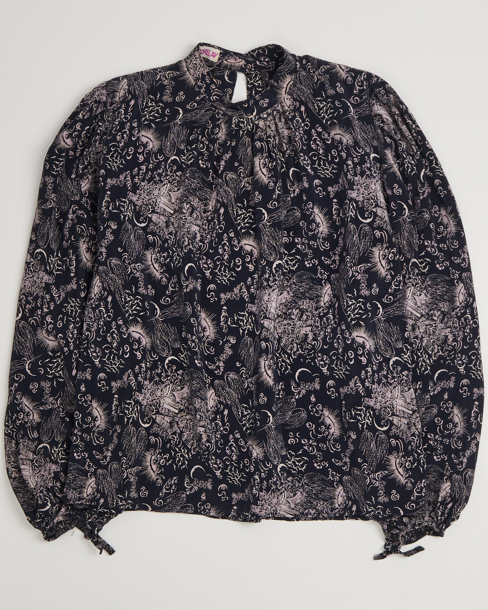 Блузка из  легкого струящегося шелка от Lorelay. Свободный, слегка оверсайз крой, длинные рукава с завязками на манжетах. Завораживающий космический орнамент с изображениями солнц, лун, звёзд и абстрактных облаков, напоминает гравюры старинных астрономов.