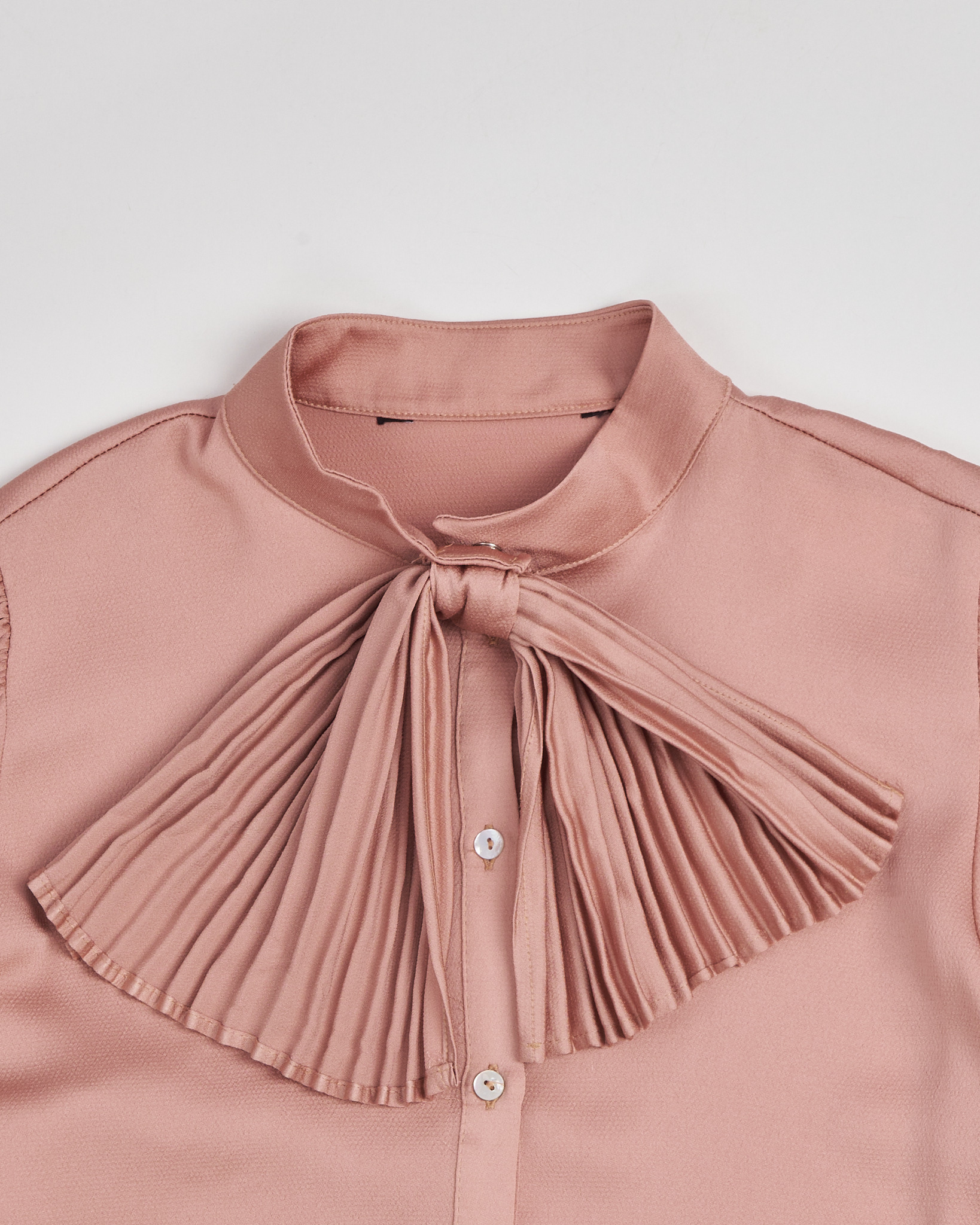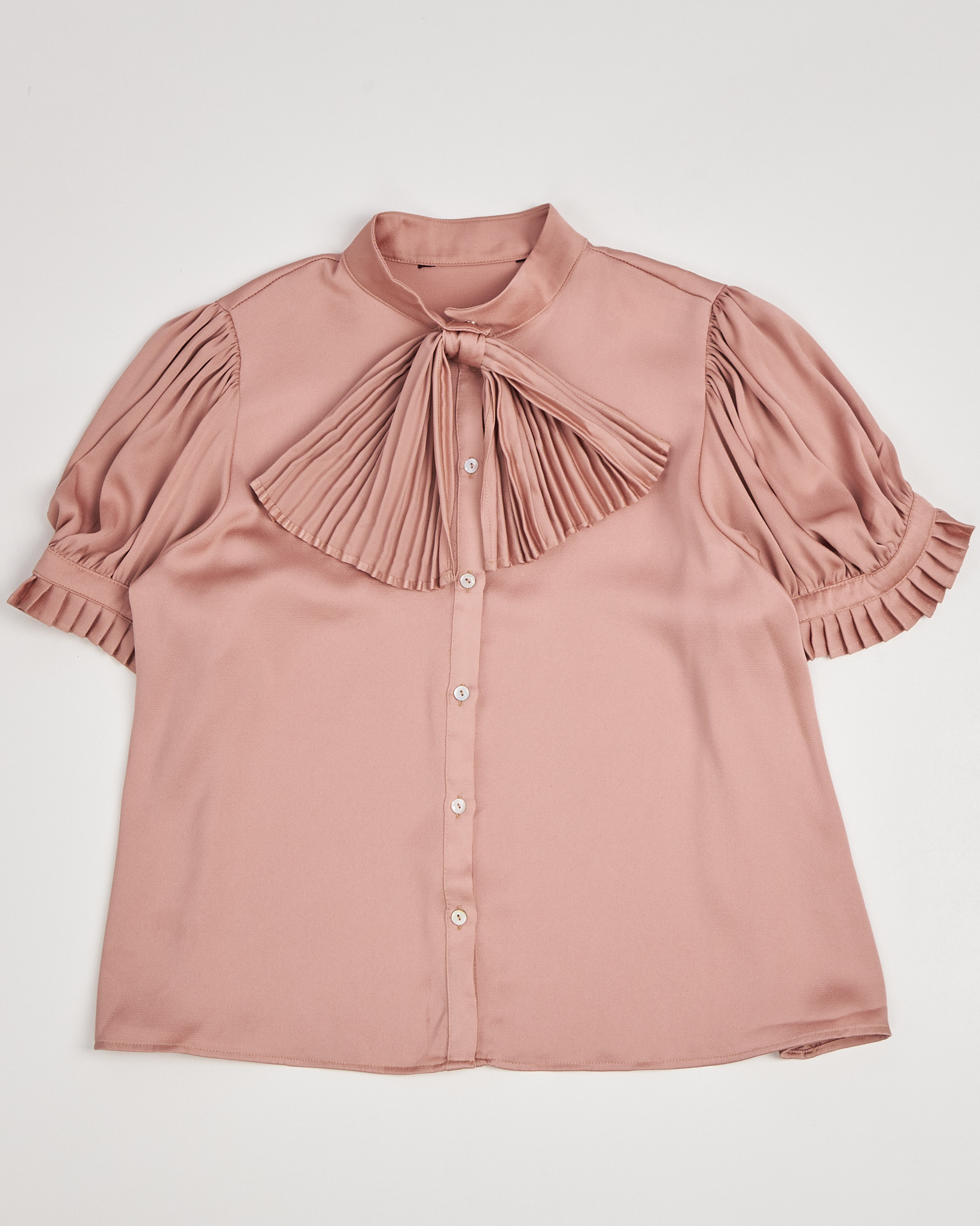 Блуза из лёгкой струящейся ткани в пудровом оттенке. Посадка свободная, рукава добавляют объём в плечах. Материал гладкий, шелковистый, приятный к телу, с деликатным матовым блеском. Плиссированный бант и сборки на рукавах добавляют акцент.