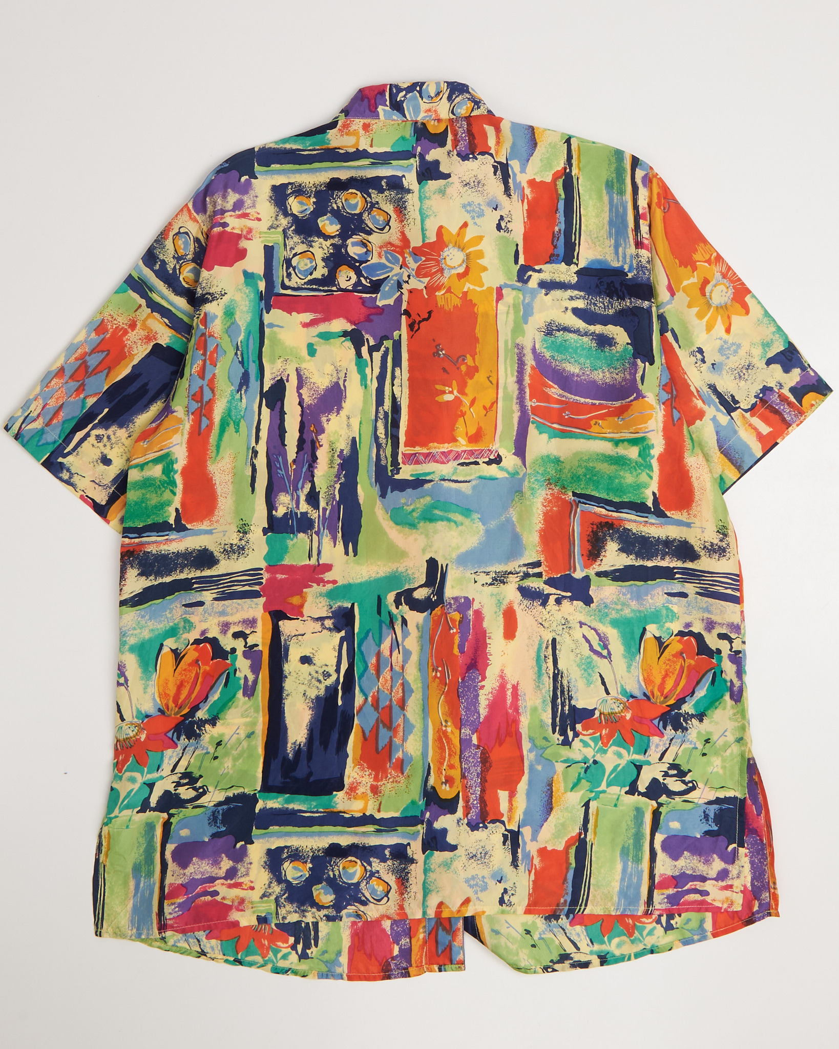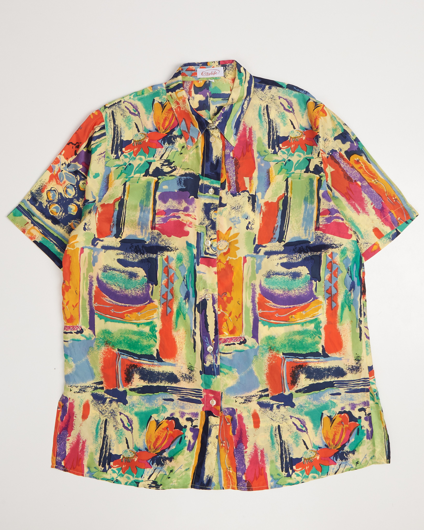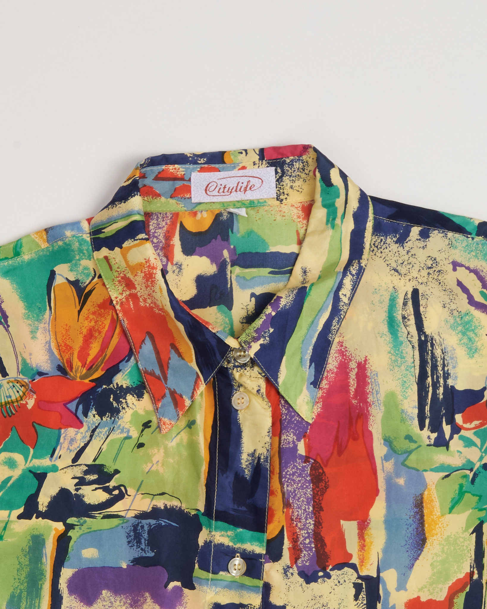 Блуза шелковая Citylife светло - желтого с ярким абстрактным принтом. Прямой силуэт. Классический воротник. Застежка на пуговицы по всей длине. Короткий рукав с аккуратным подгибом.