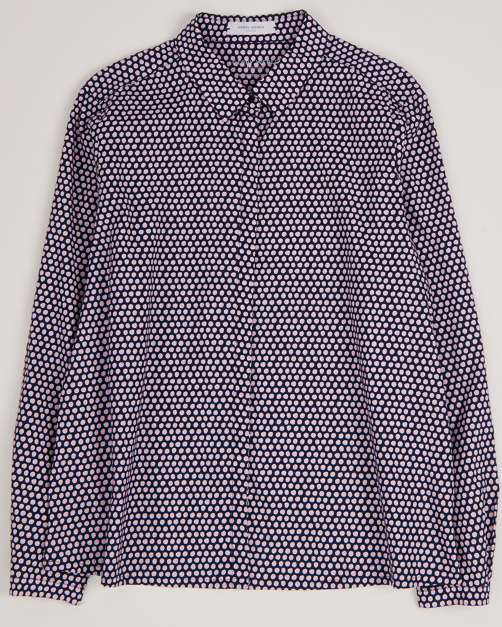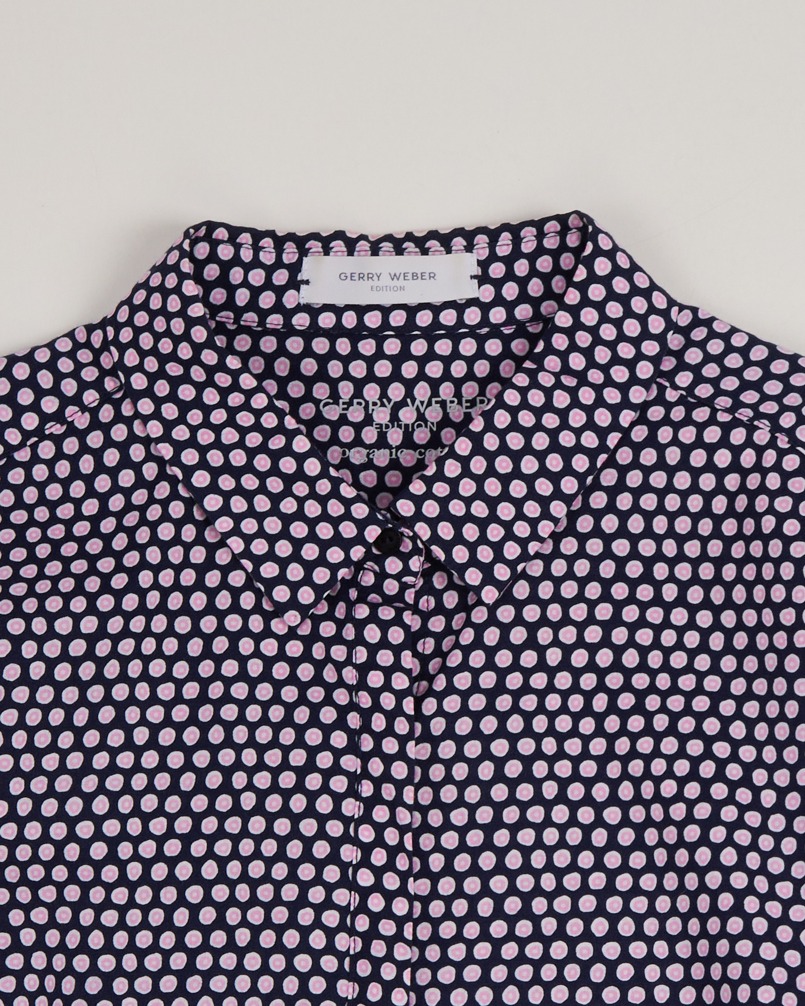 Классическая блуза от Gerry Weber сшита из тонкого органического хлопка. Свободный прямой крой, застежка на потайные пуговицы, манжеты на рукавах, небольшие разрезы по бокам. Яркий оригинальный принт в виде горошка придает модели особый шарм. Идеальный выбор для повседневного стиля.