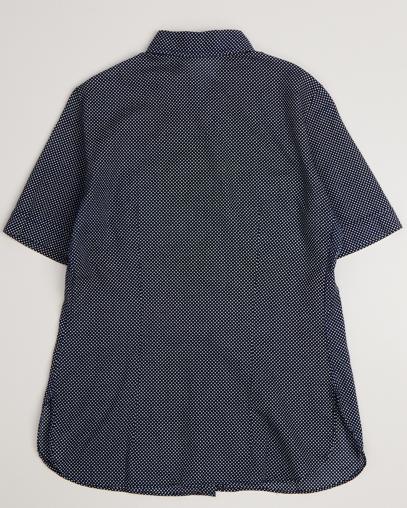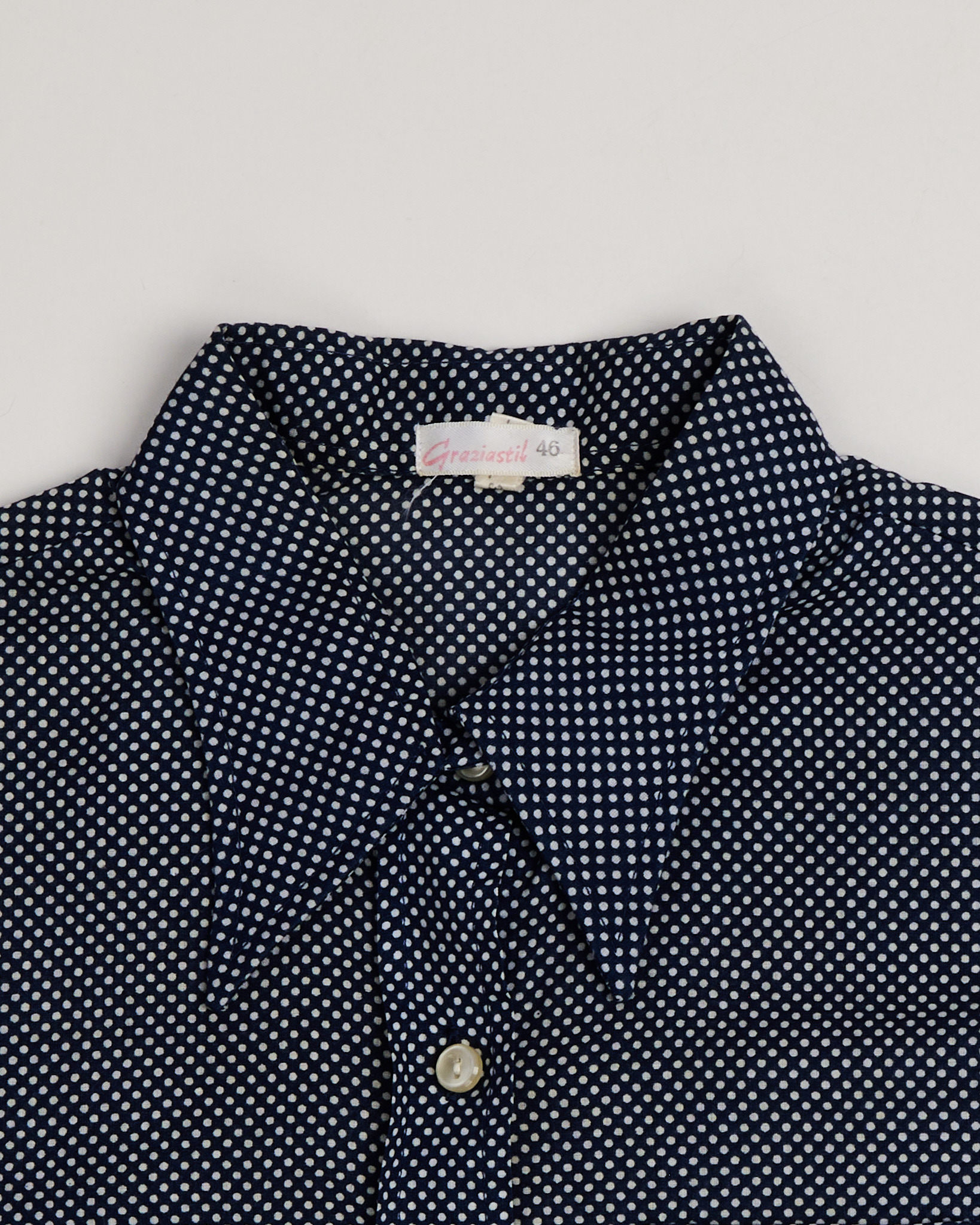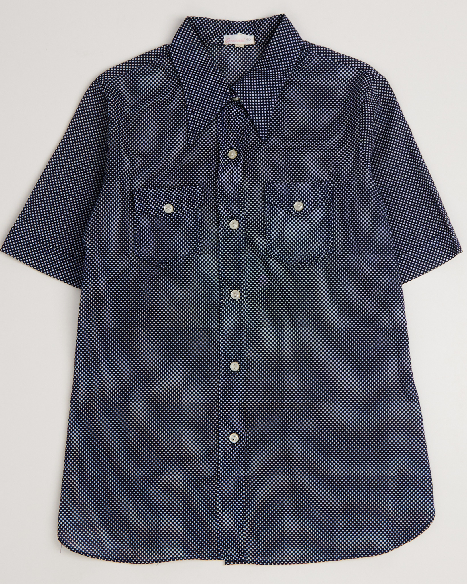 Блуза в мелкий горошек из тонкого хлопка. Прямой, свободный крой, короткие рукава, два накладных кармана с клапанами на груди. Застежка на бежевые перламутровые пуговицы.