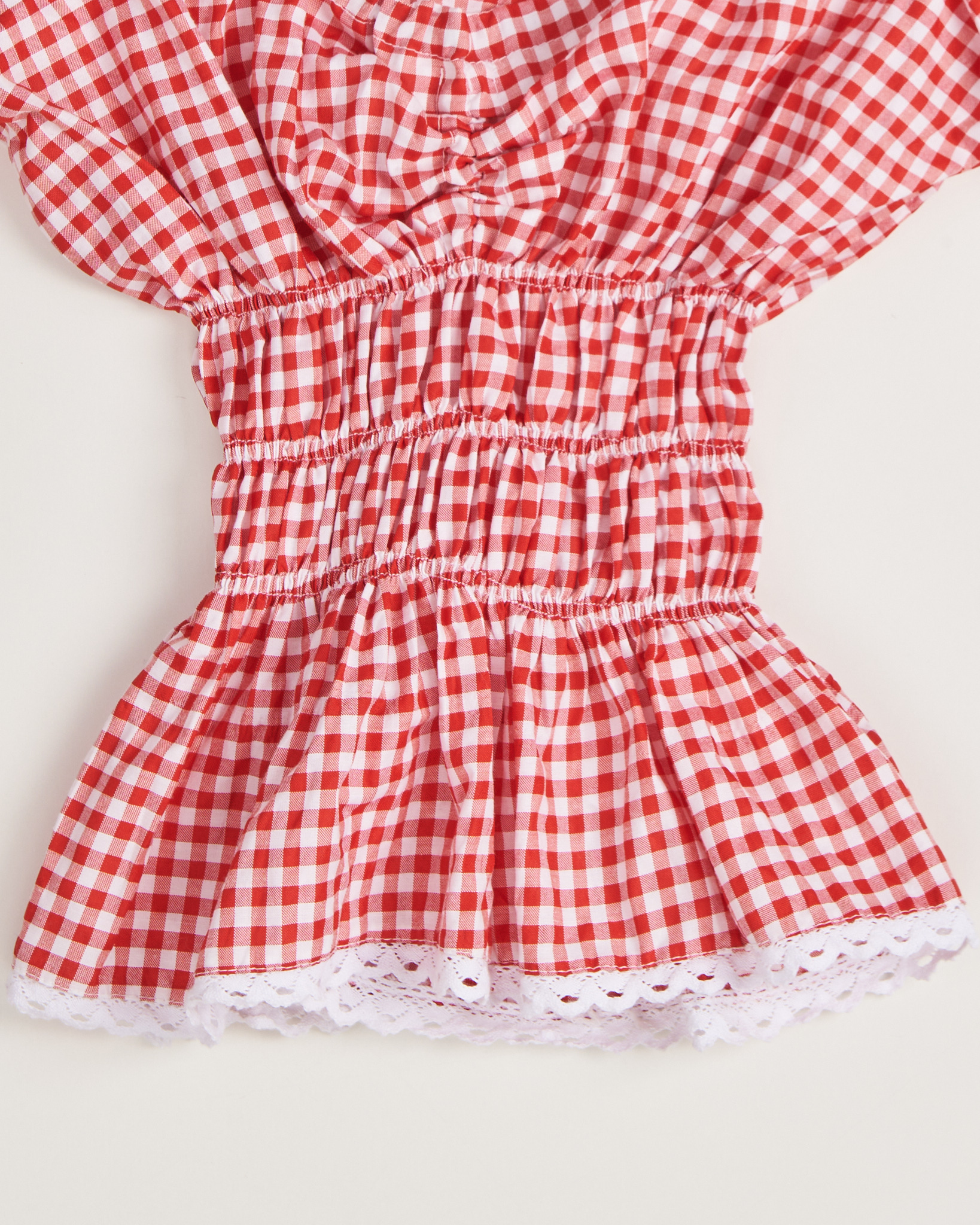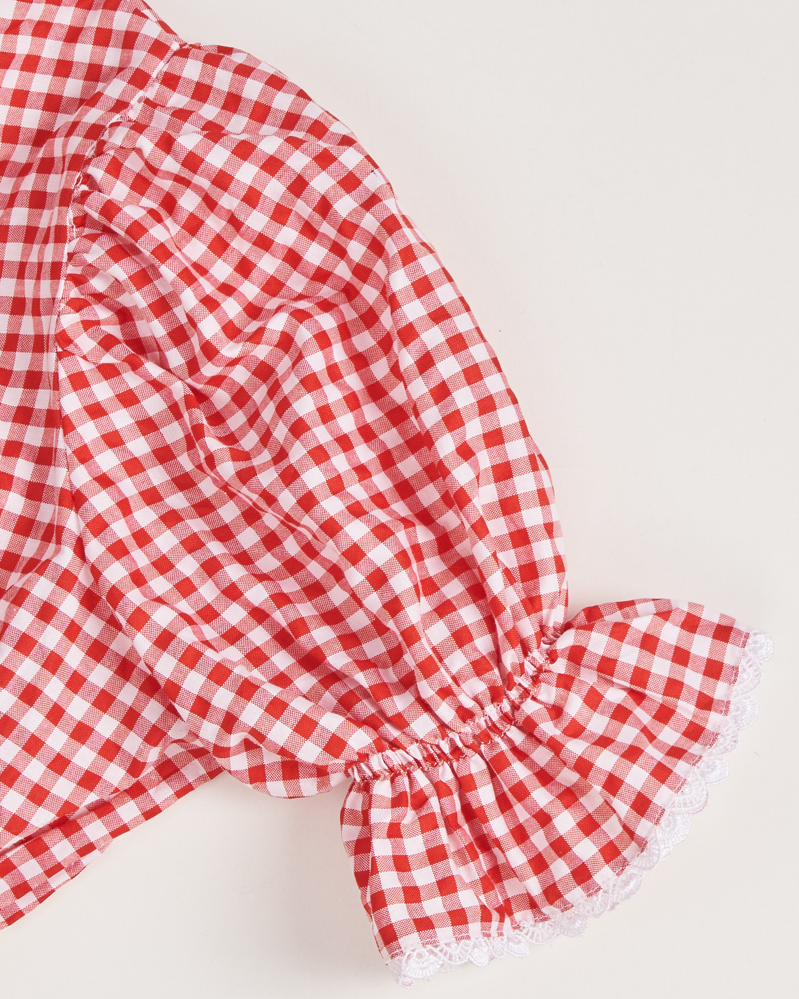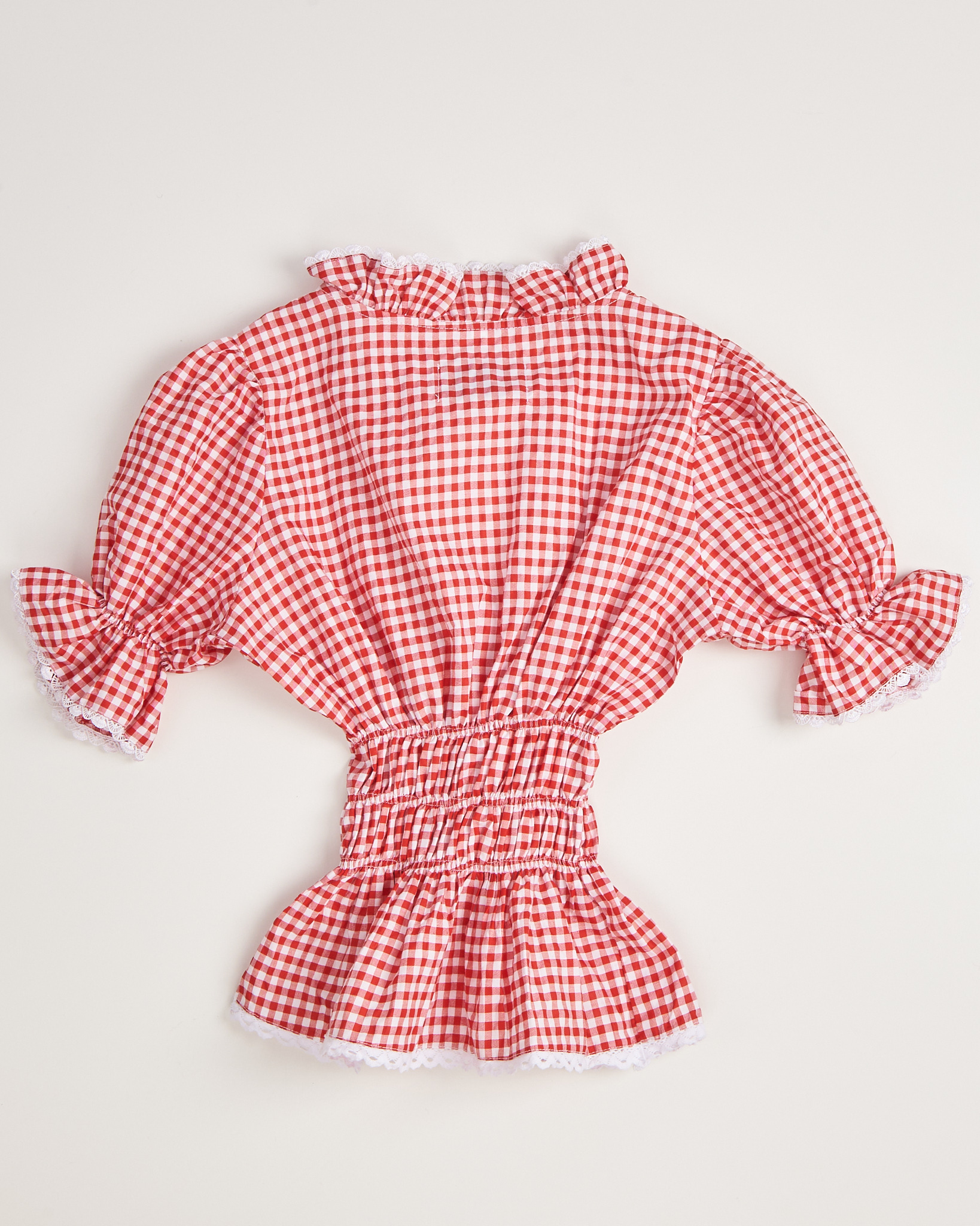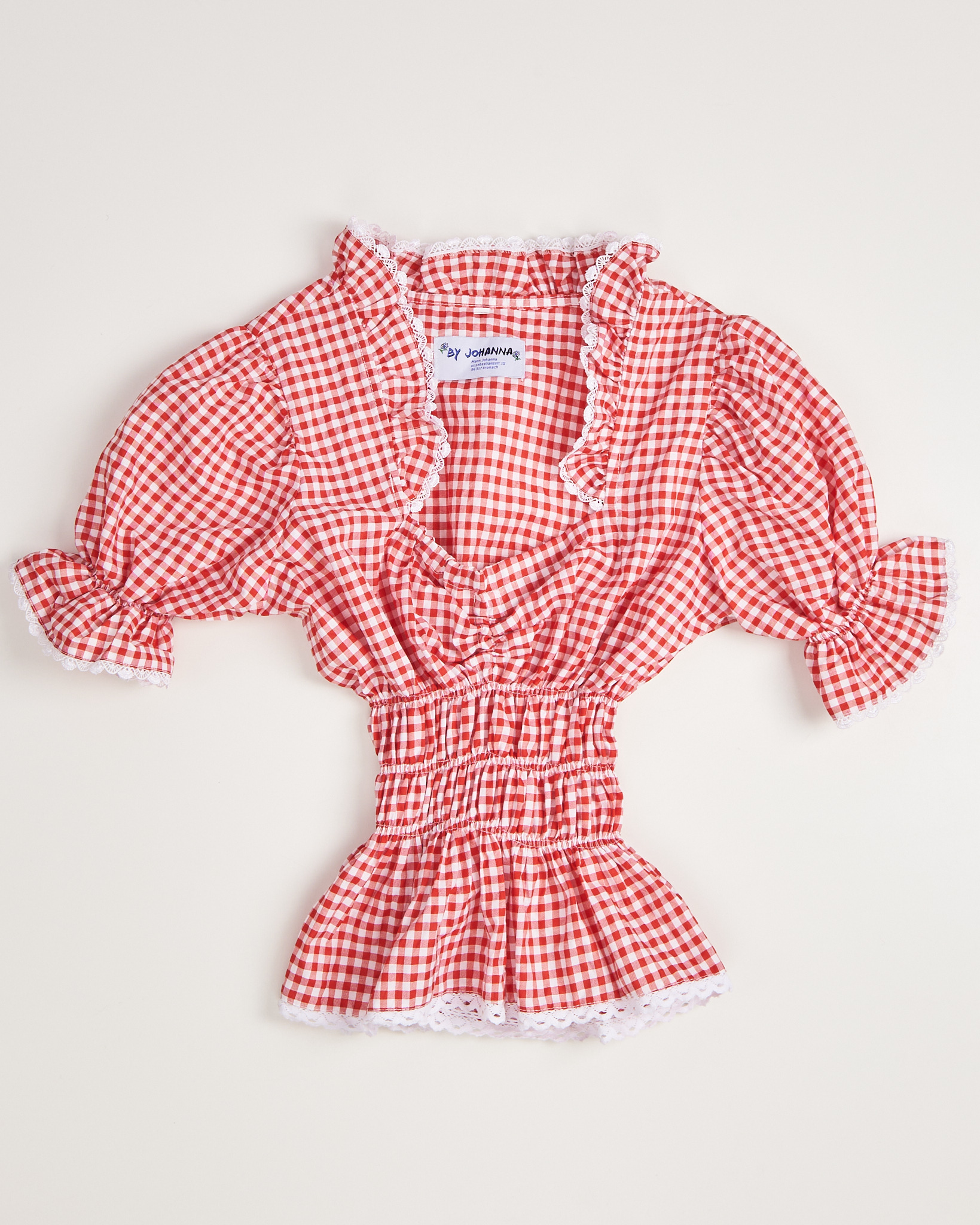 Блуза в красно-белых тонах от By Johanna. Укороченный крой, сборчатый пояс-резинка, объёмные рукава-буфы с манжетами, расклёшенный низ с оборкой. Кружевная отделка по краю воротника, манжет и подола. Деревенский шик с элементами ретро.