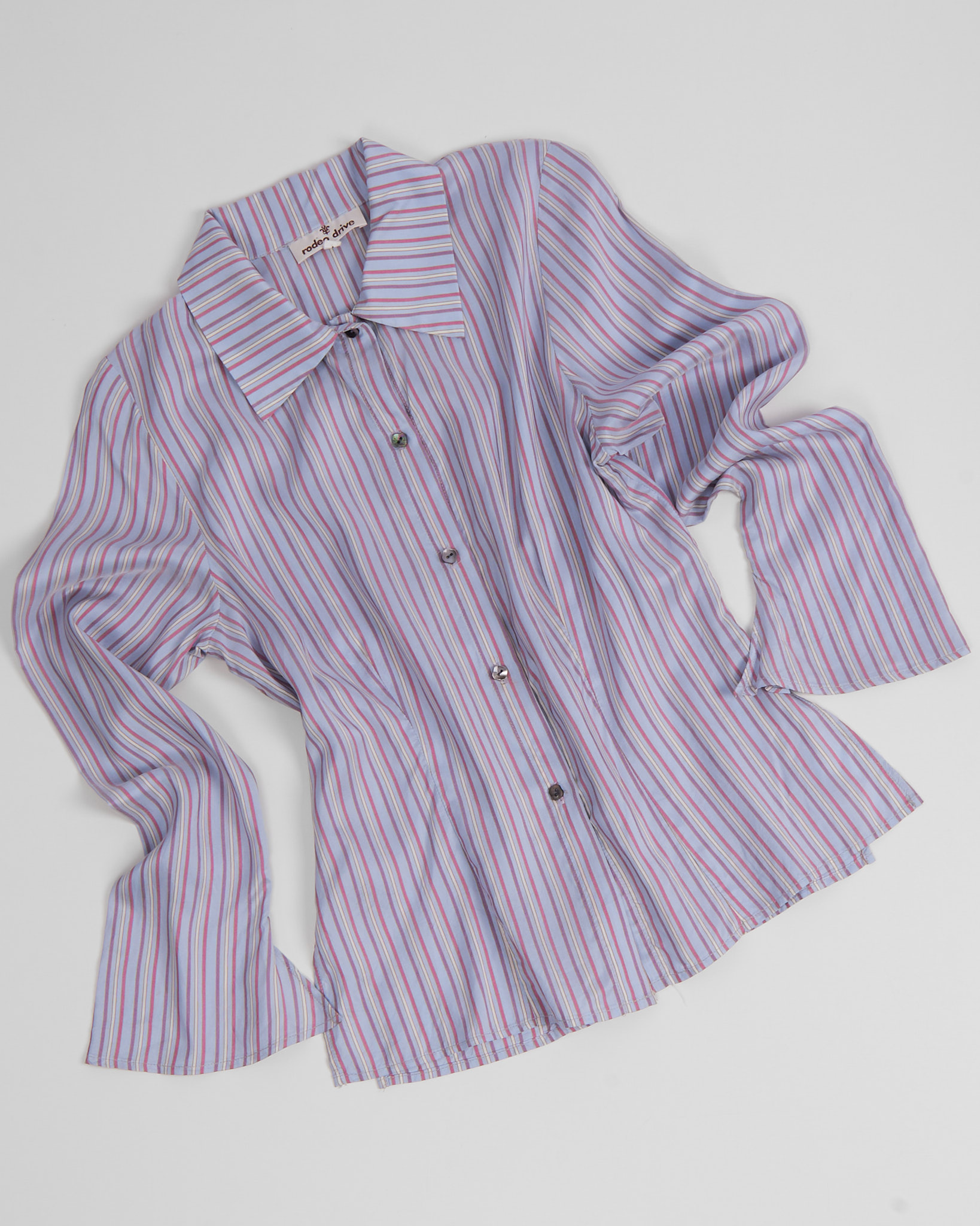 Блуза в полоску из 100% шёлка от американского бренда Rodeo drive. Приталенный силуэт, акцентные вытачки, расклешённые рукава.