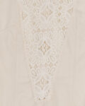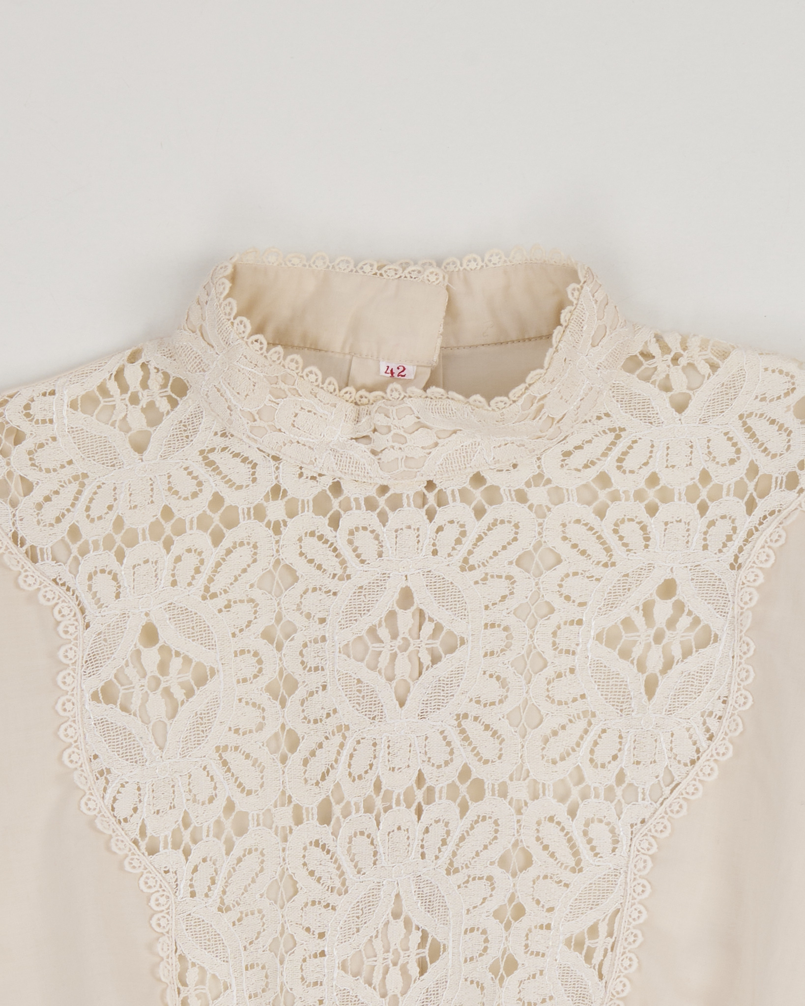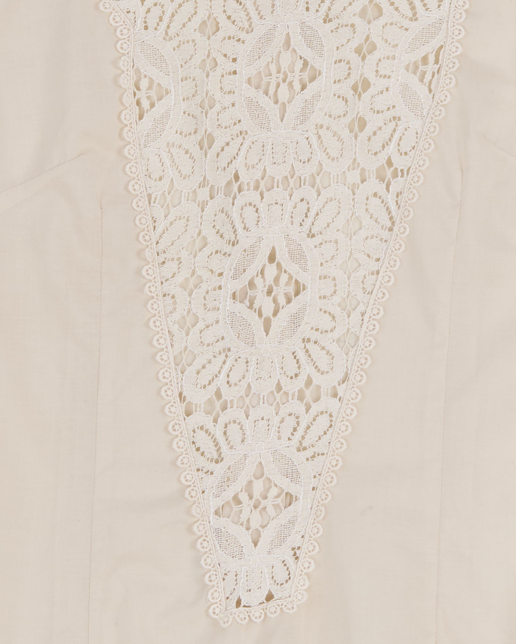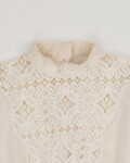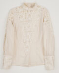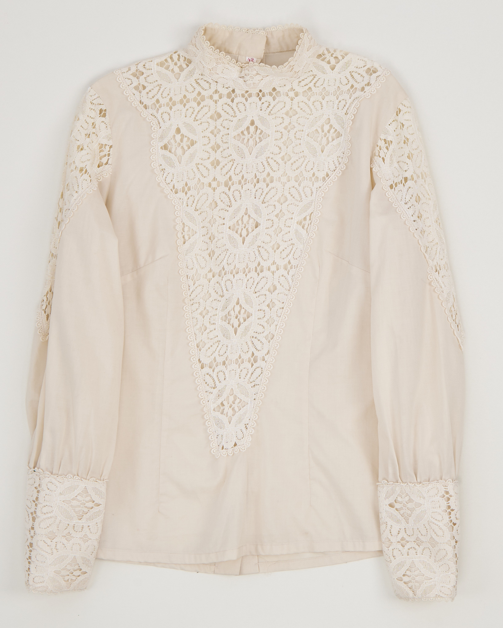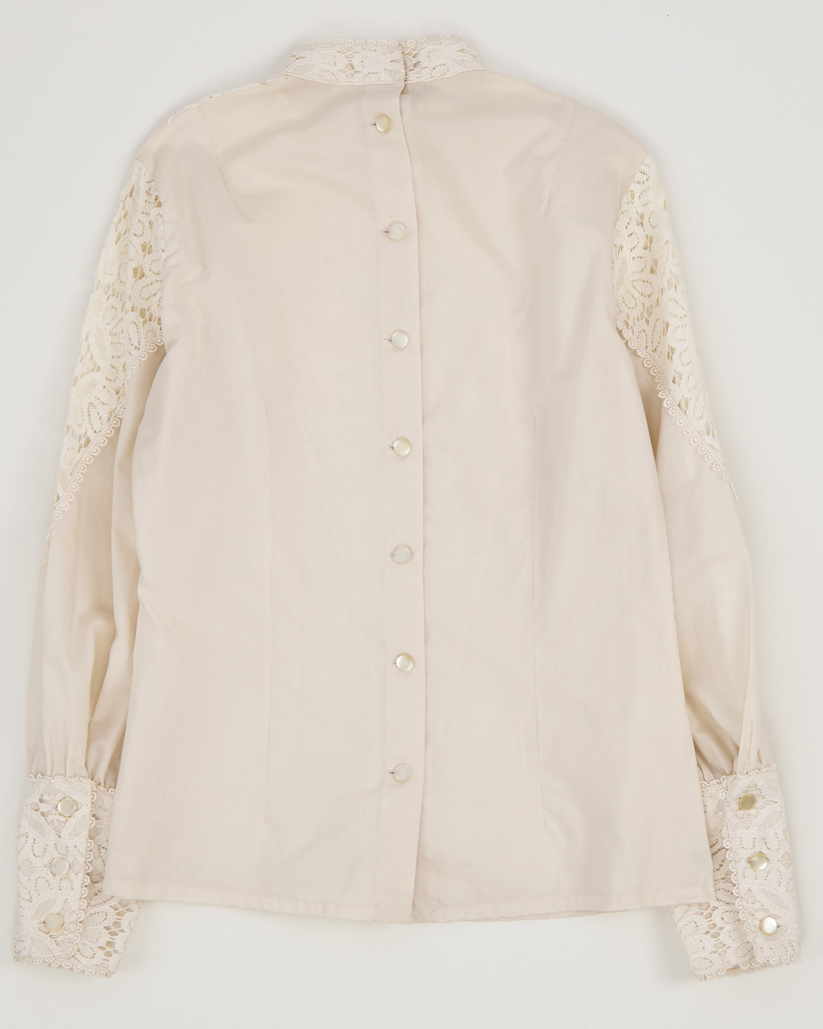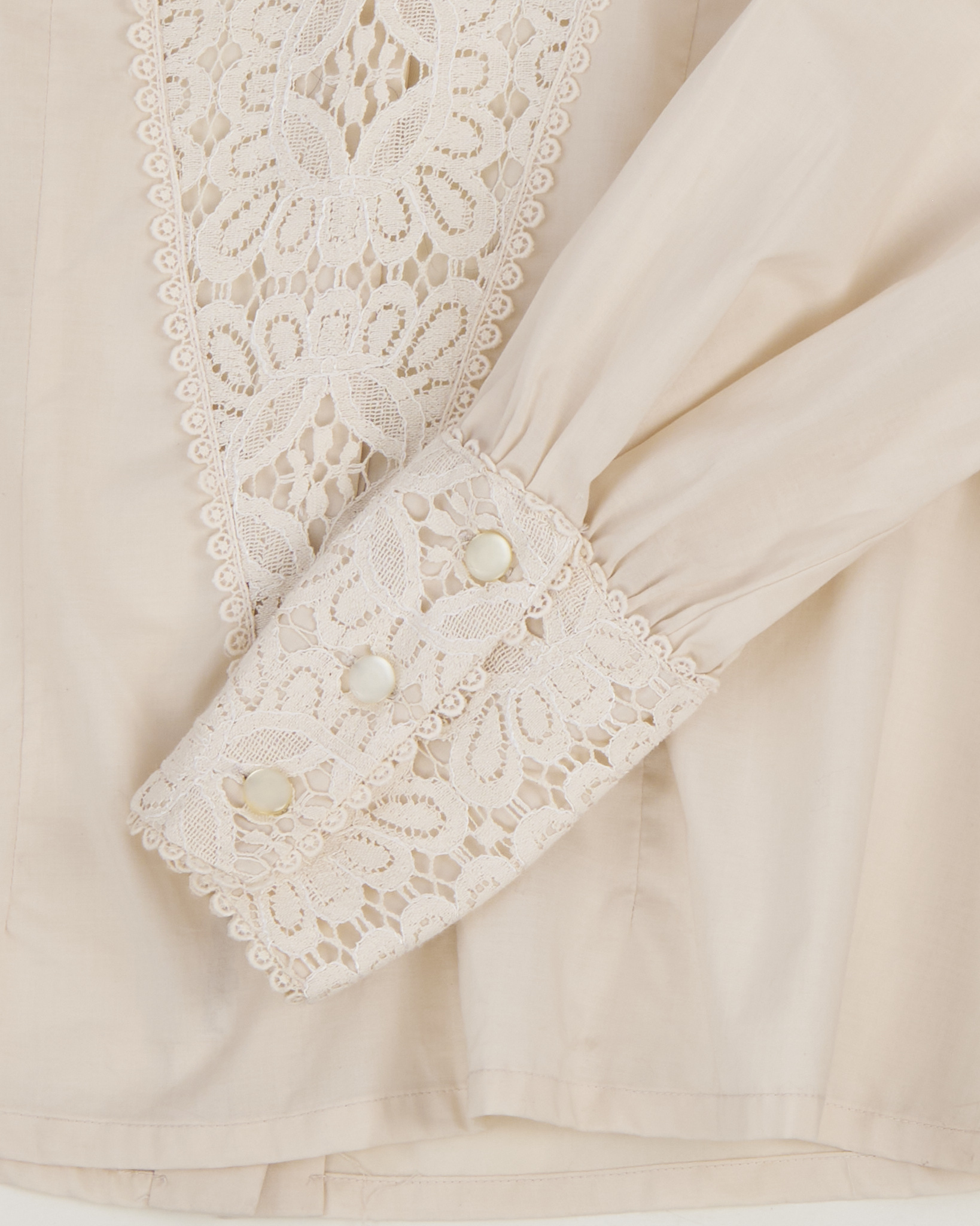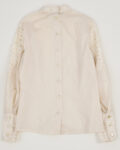 Блуза выполнена из тонкого хлопка кремового оттенка. Украшена кружевом. Застежка на пуговицы по всей длине со спины. Объемные рукава, собранные на манжеты