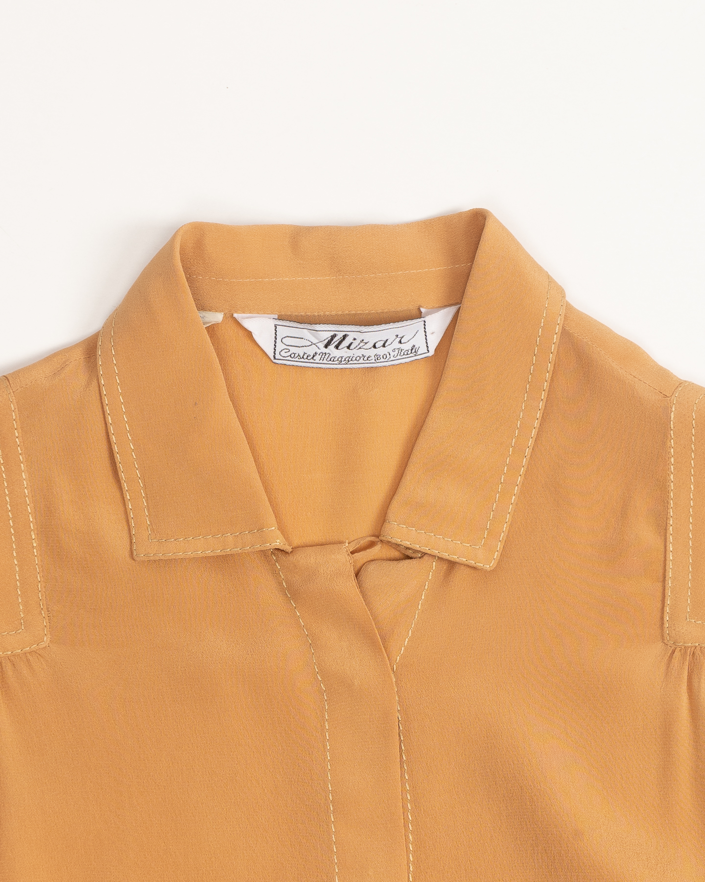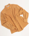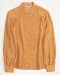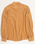 Блузка выполнена предположительно из вискозы.Посадка свободная, формирует аккуратный силуэт за счёт лёгких сборок на плечах и широких манжет.Ровные строчки, продуманная конструкция воротника и плотная такнь, хорошо держит форму.