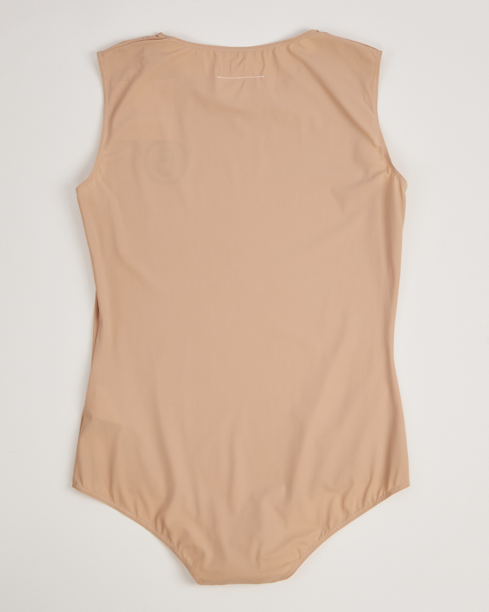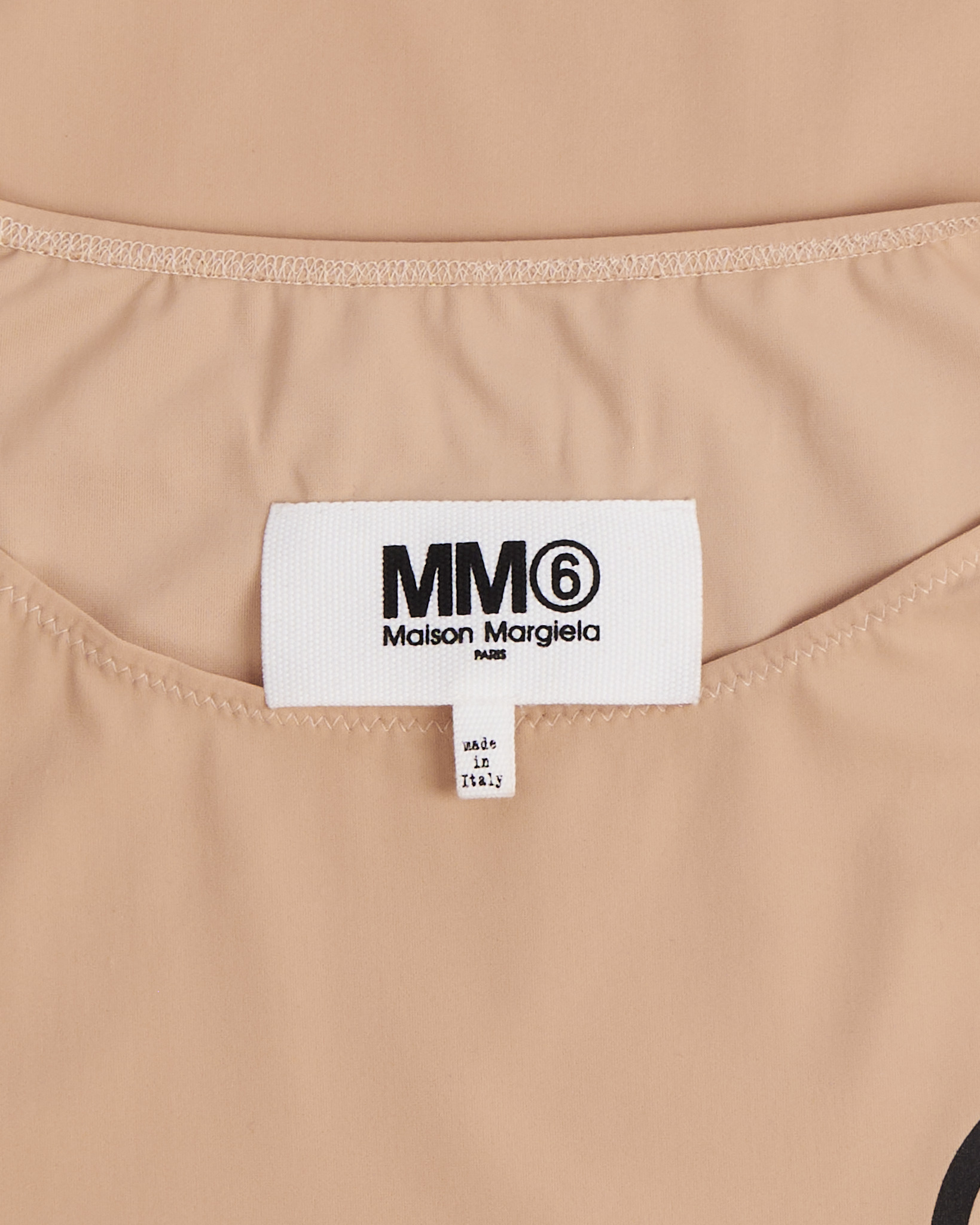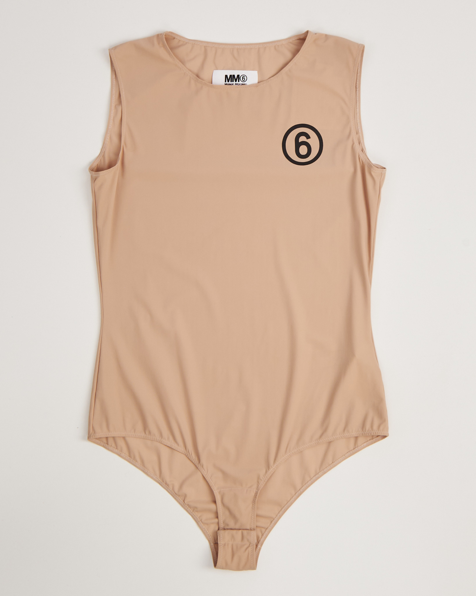 Боди от культового бренда Maison Margiela из легкой ткани. Классический бежевый цвет, акцентный принт на груди, удобная застежка по низу.