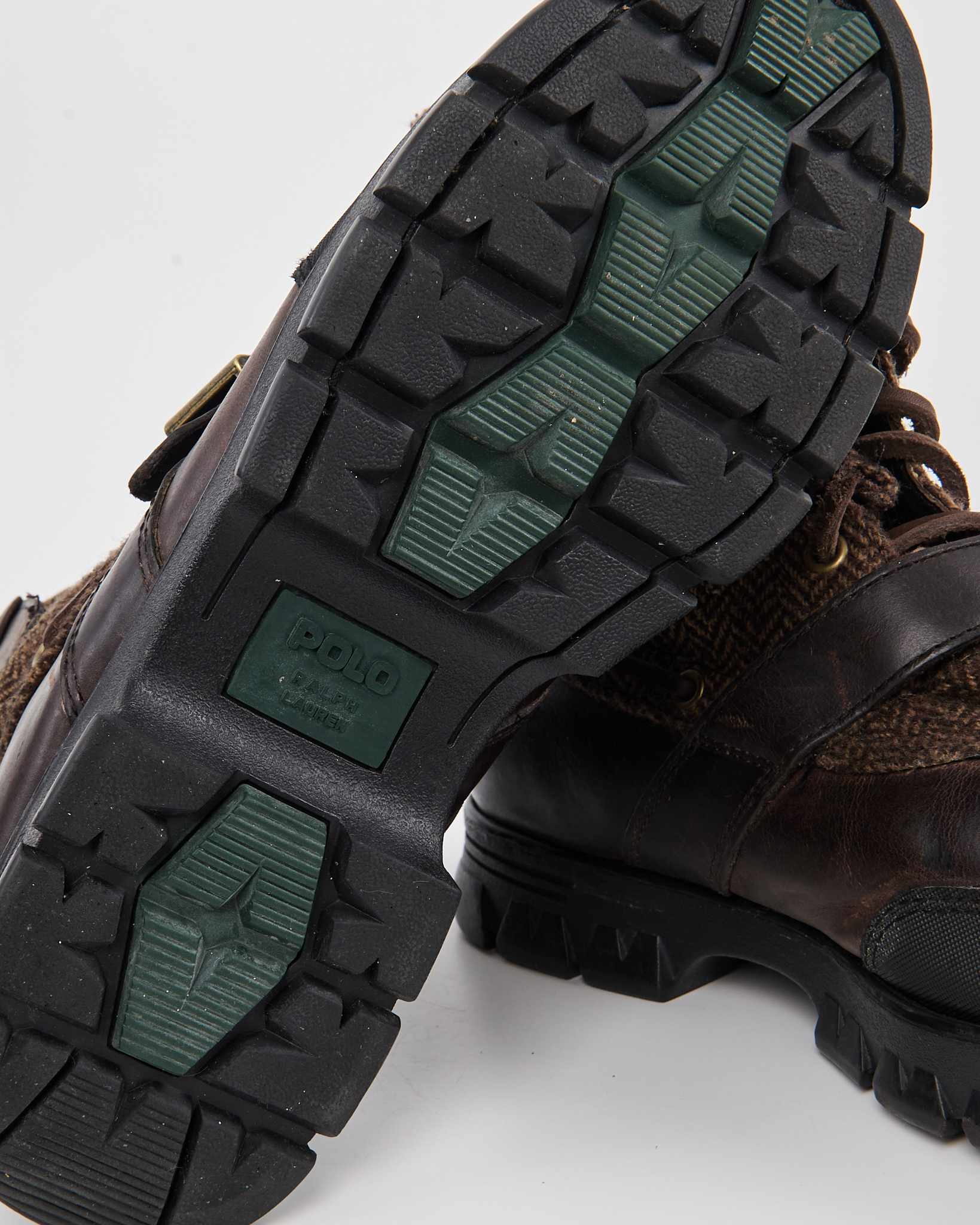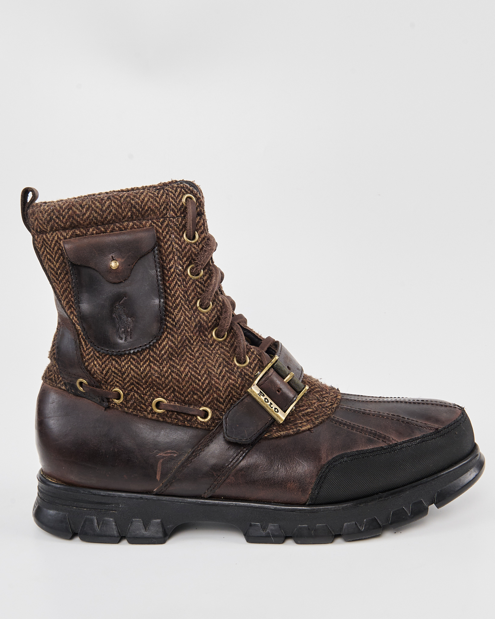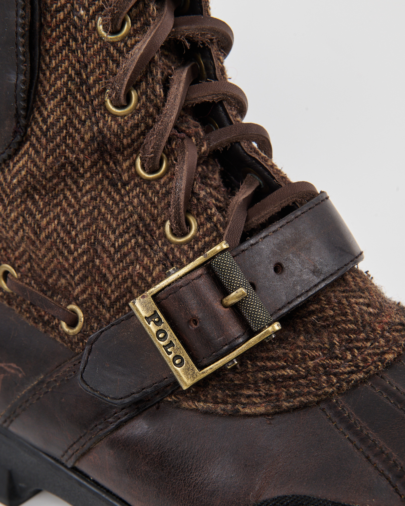 Polo Ralph Lauren кожаные ботинки с твидовой вставкой. Модель Polo Ralph Lauren с массивной протекторной подошвой и регулируемый ремень с фирменной пряжкой. Детали в виде накладного кармана и контрастной подошвы.