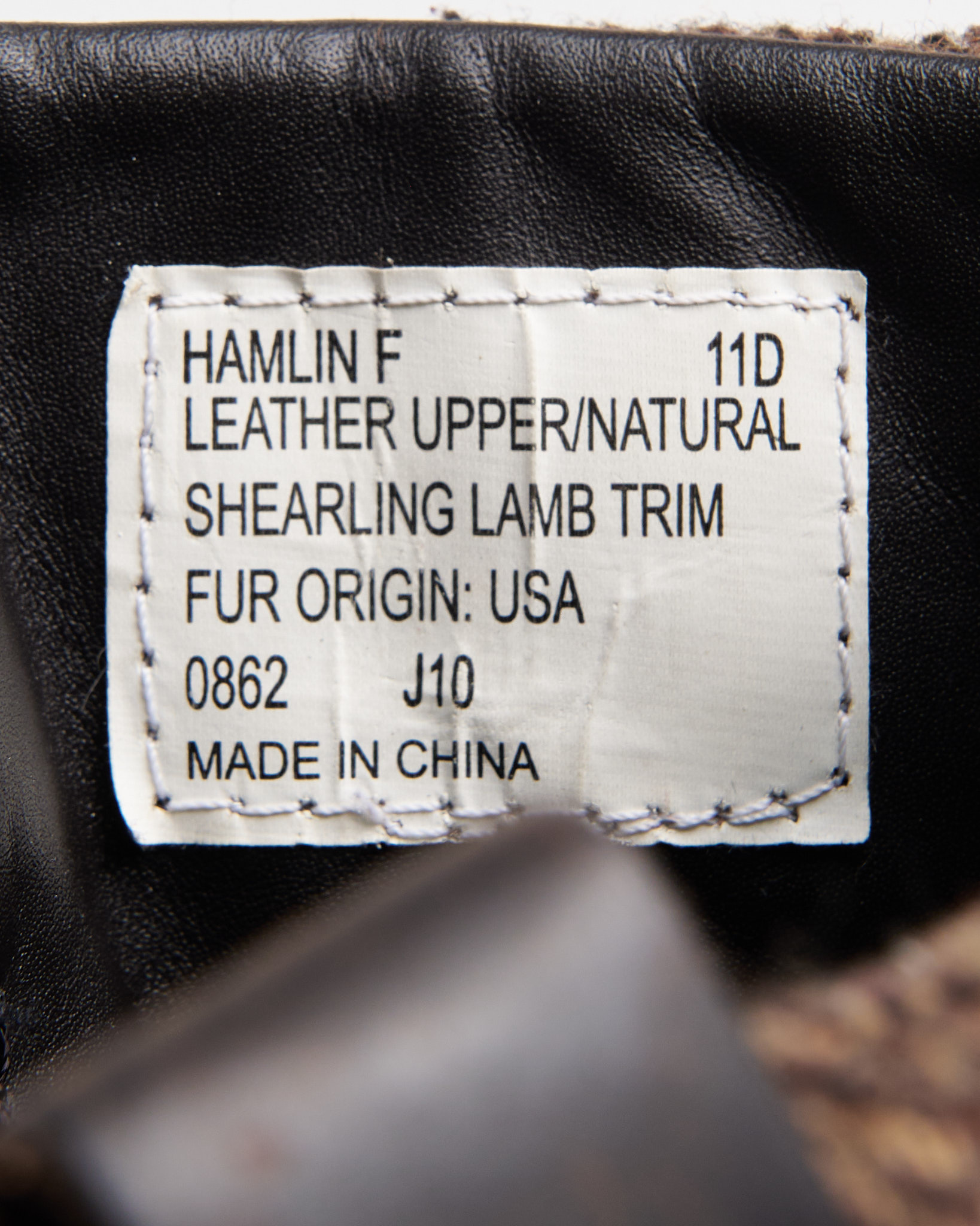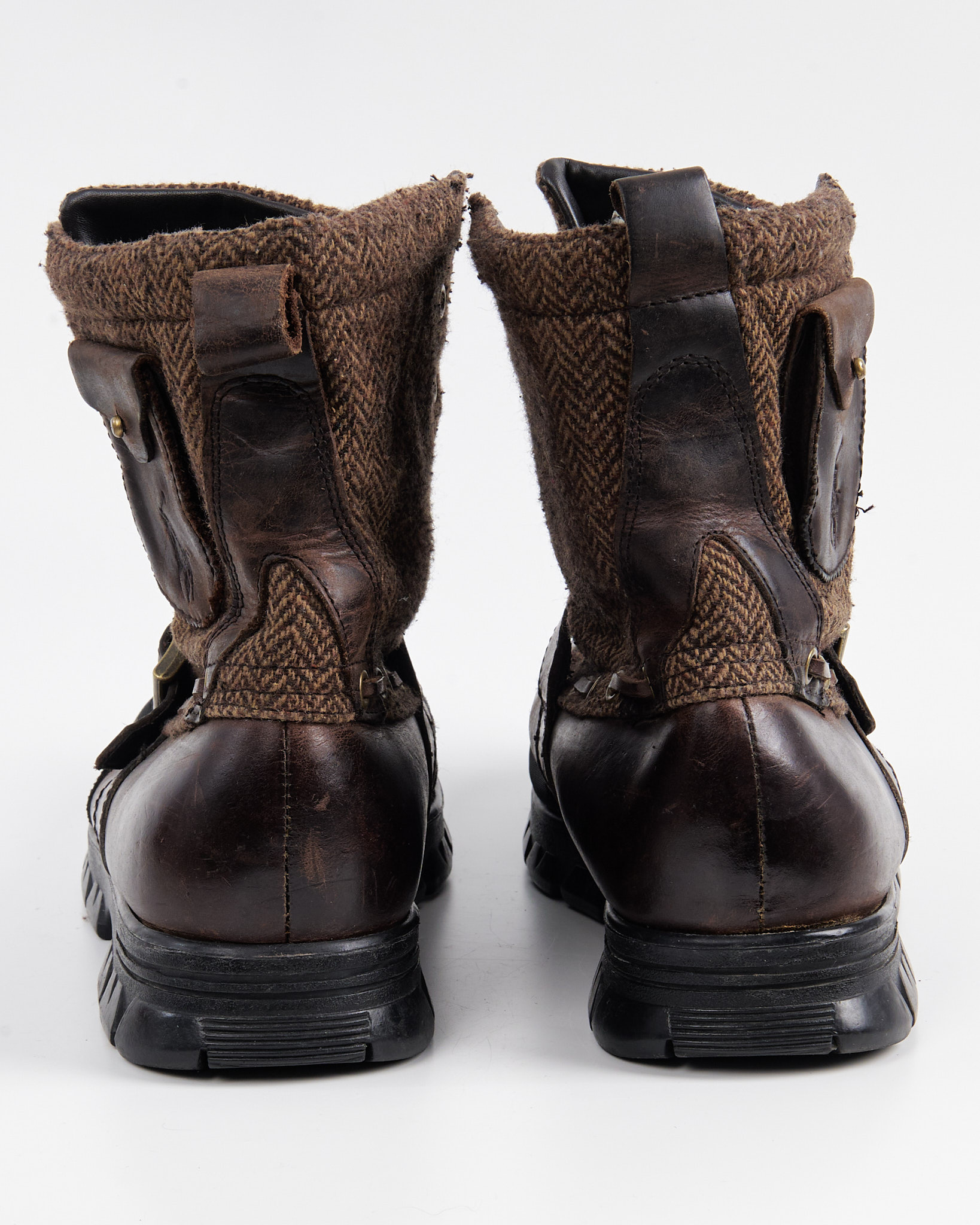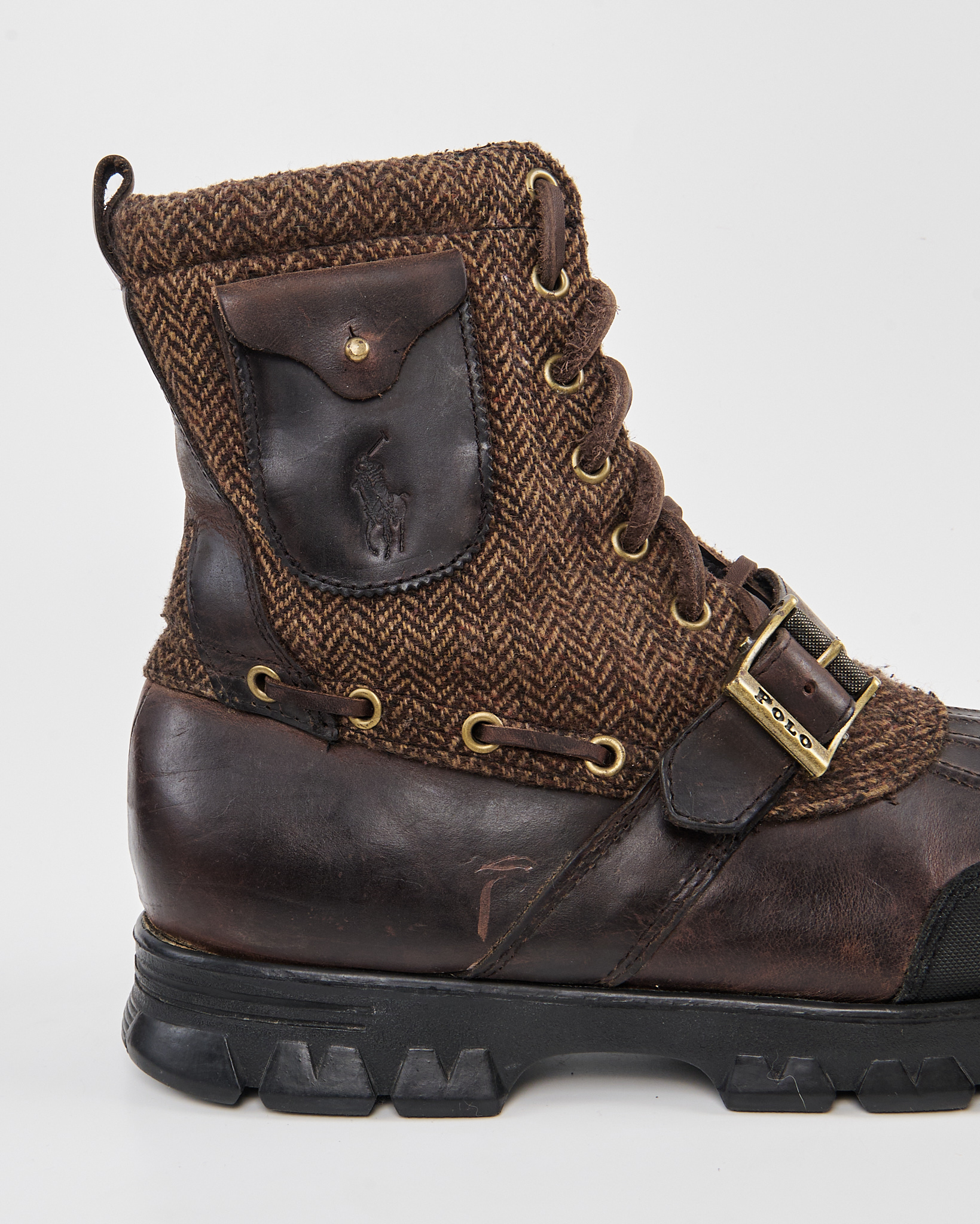 Polo Ralph Lauren кожаные ботинки с твидовой вставкой. Модель Polo Ralph Lauren с массивной протекторной подошвой и регулируемый ремень с фирменной пряжкой. Детали в виде накладного кармана и контрастной подошвы.