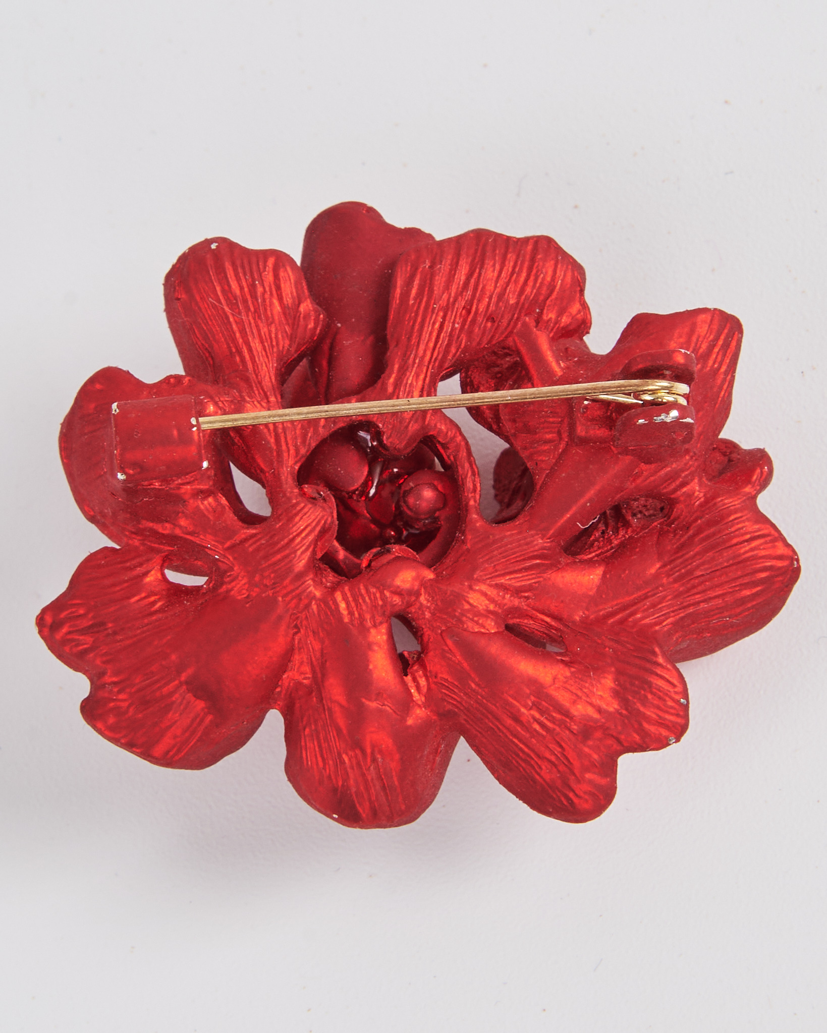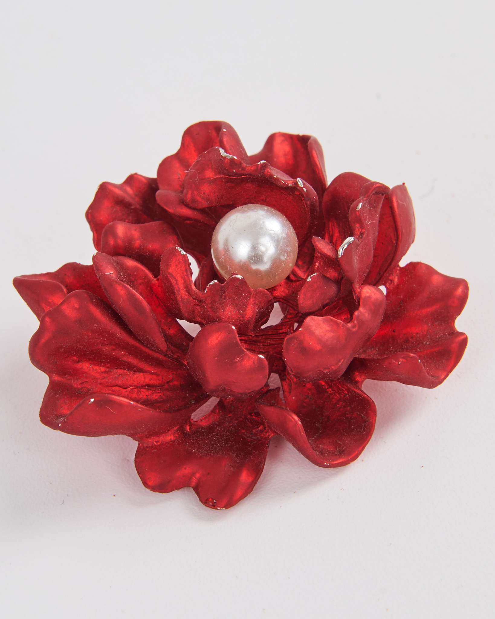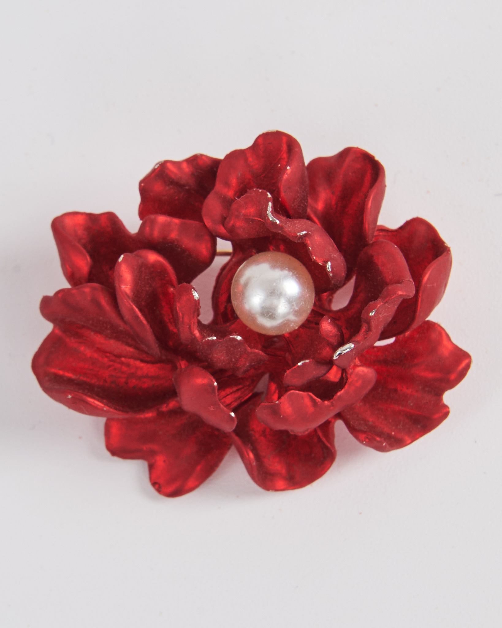 Брошь в форме цветка с жемчугом в насыщенном красном оттенке. Лепестки выполнены с плавными изгибами. Поверхность с лёгким глянцем
