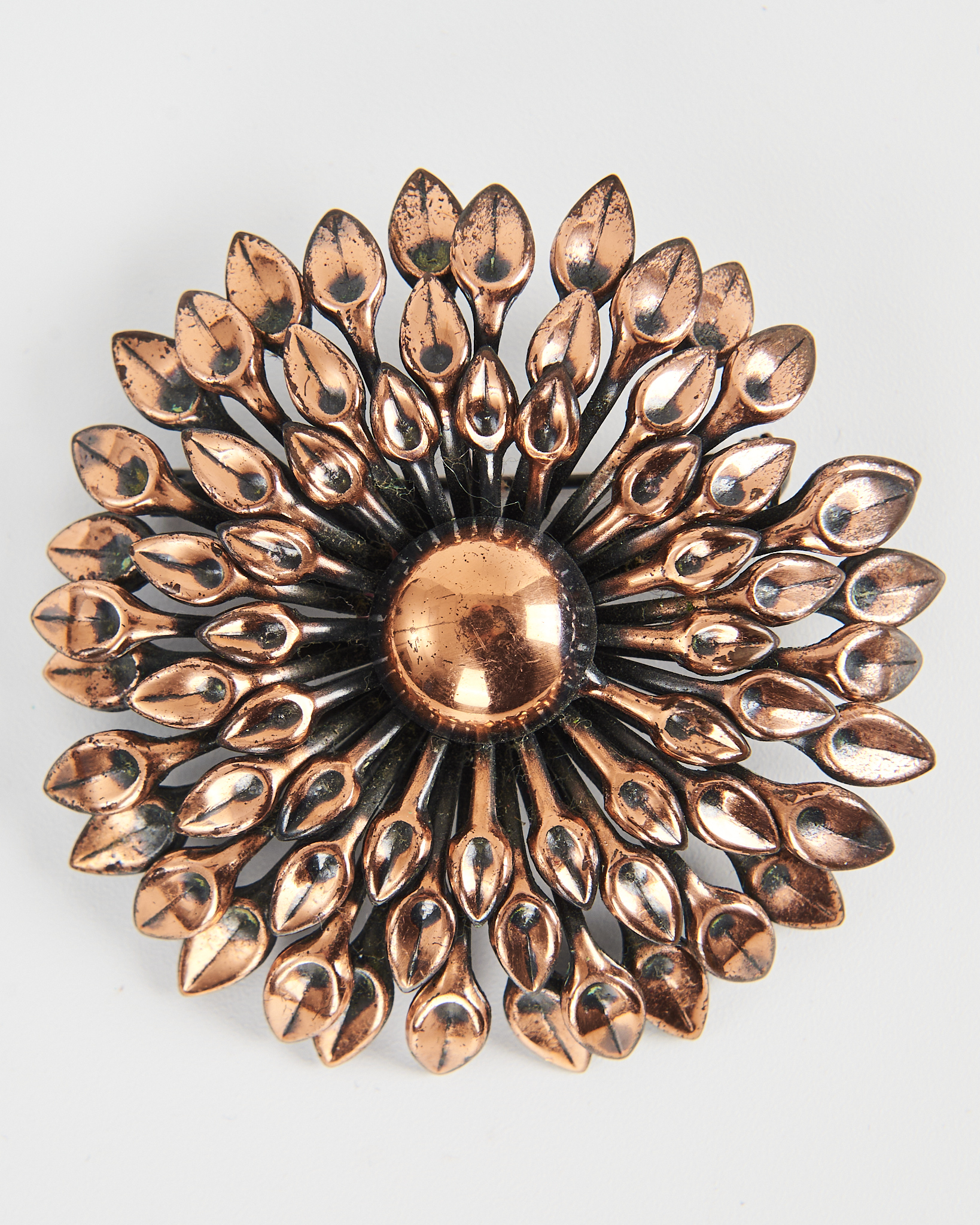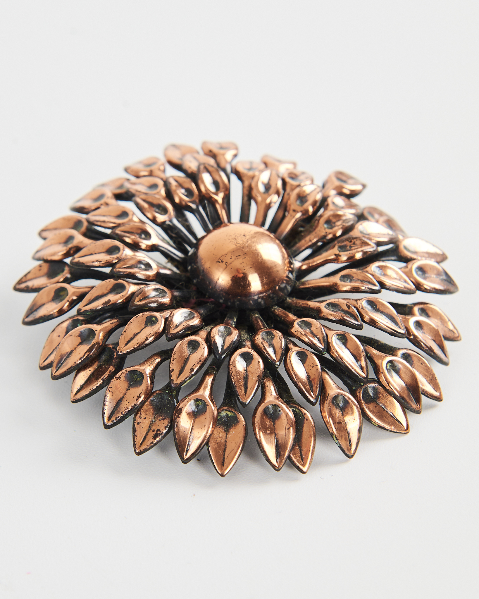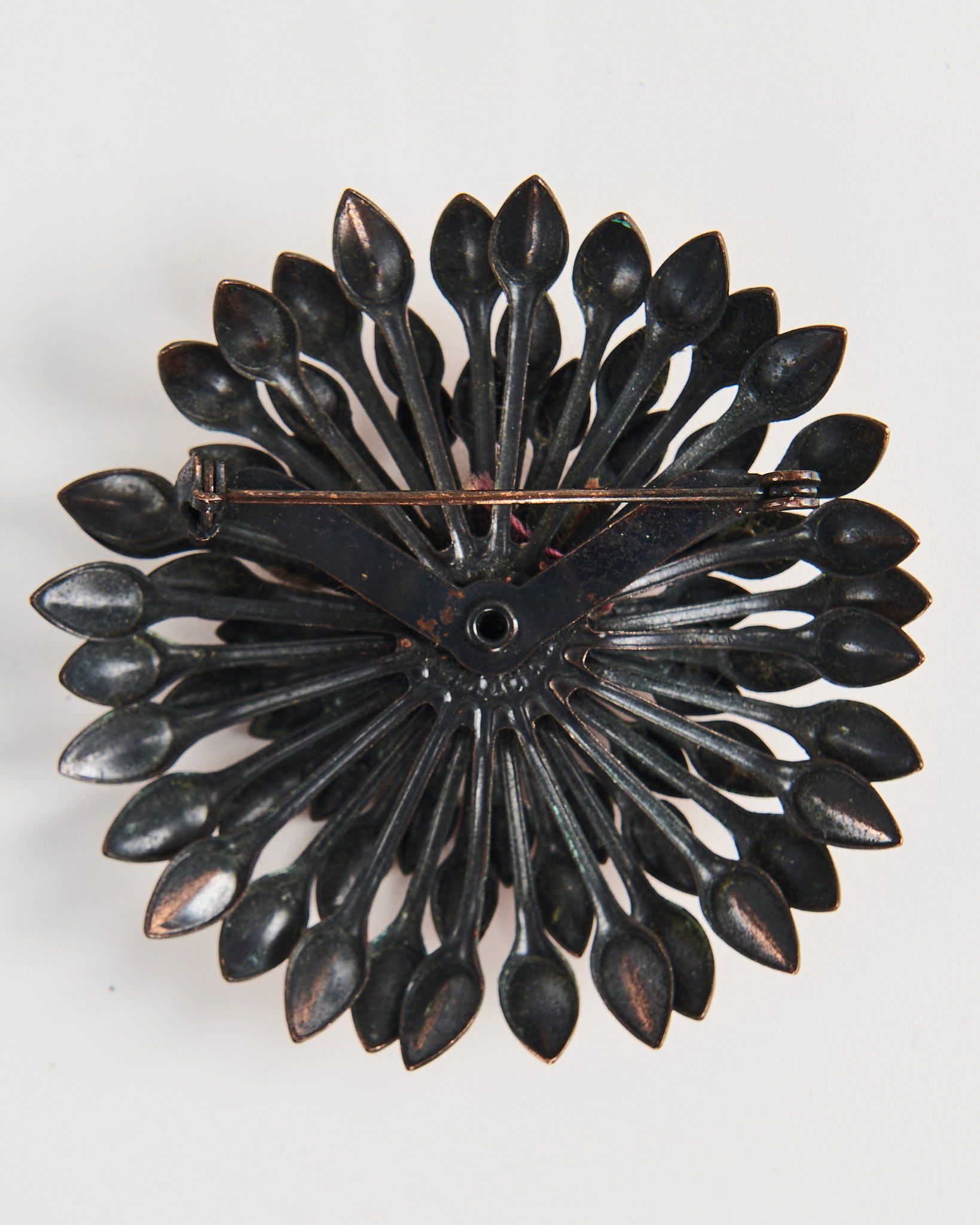 Металлическая брошь в форме цветка. Брошь уверенно фиксируется на ткани за счет удобной застежки.