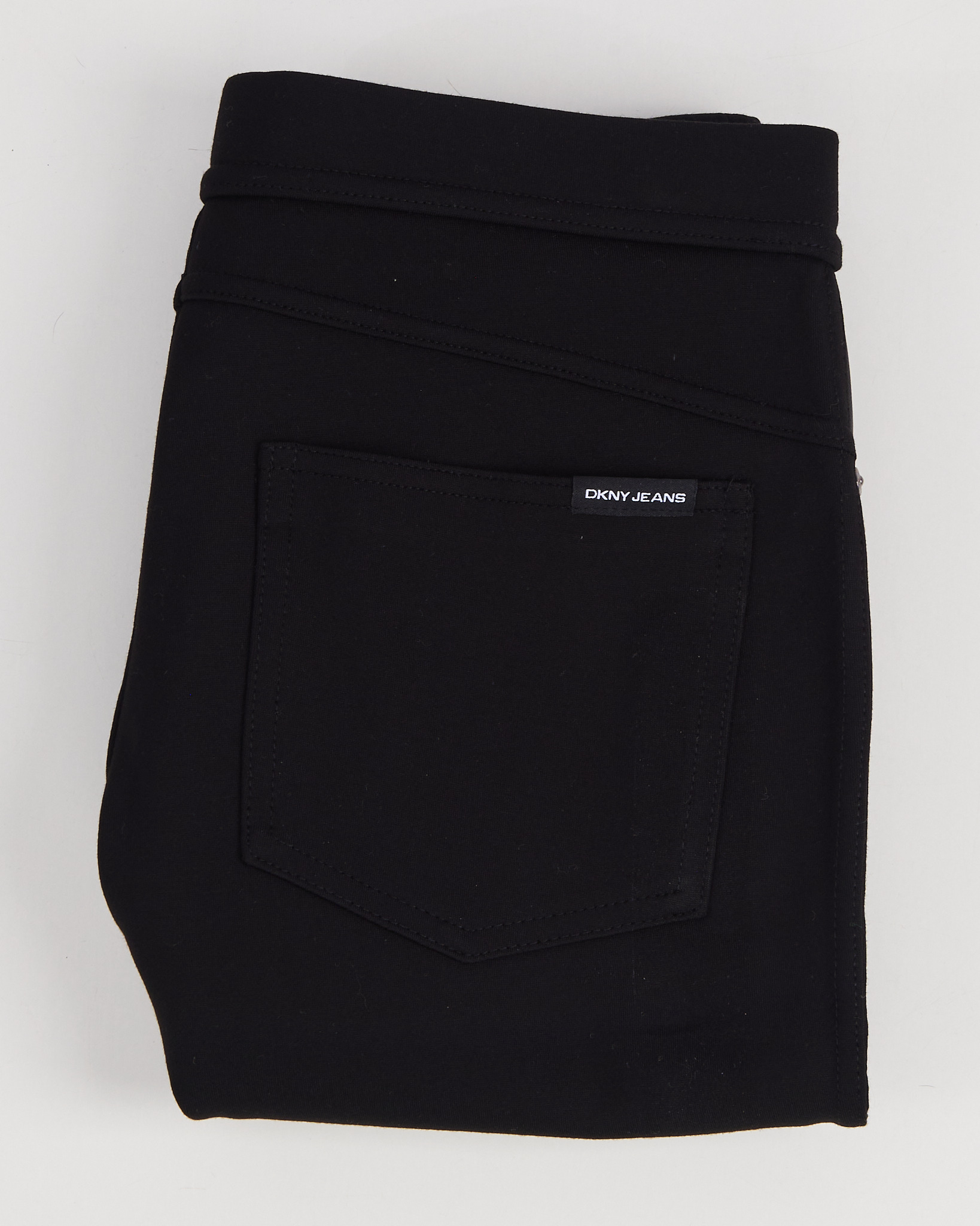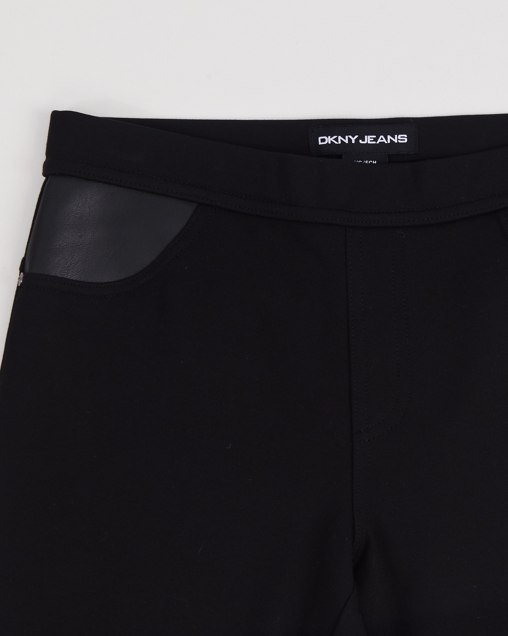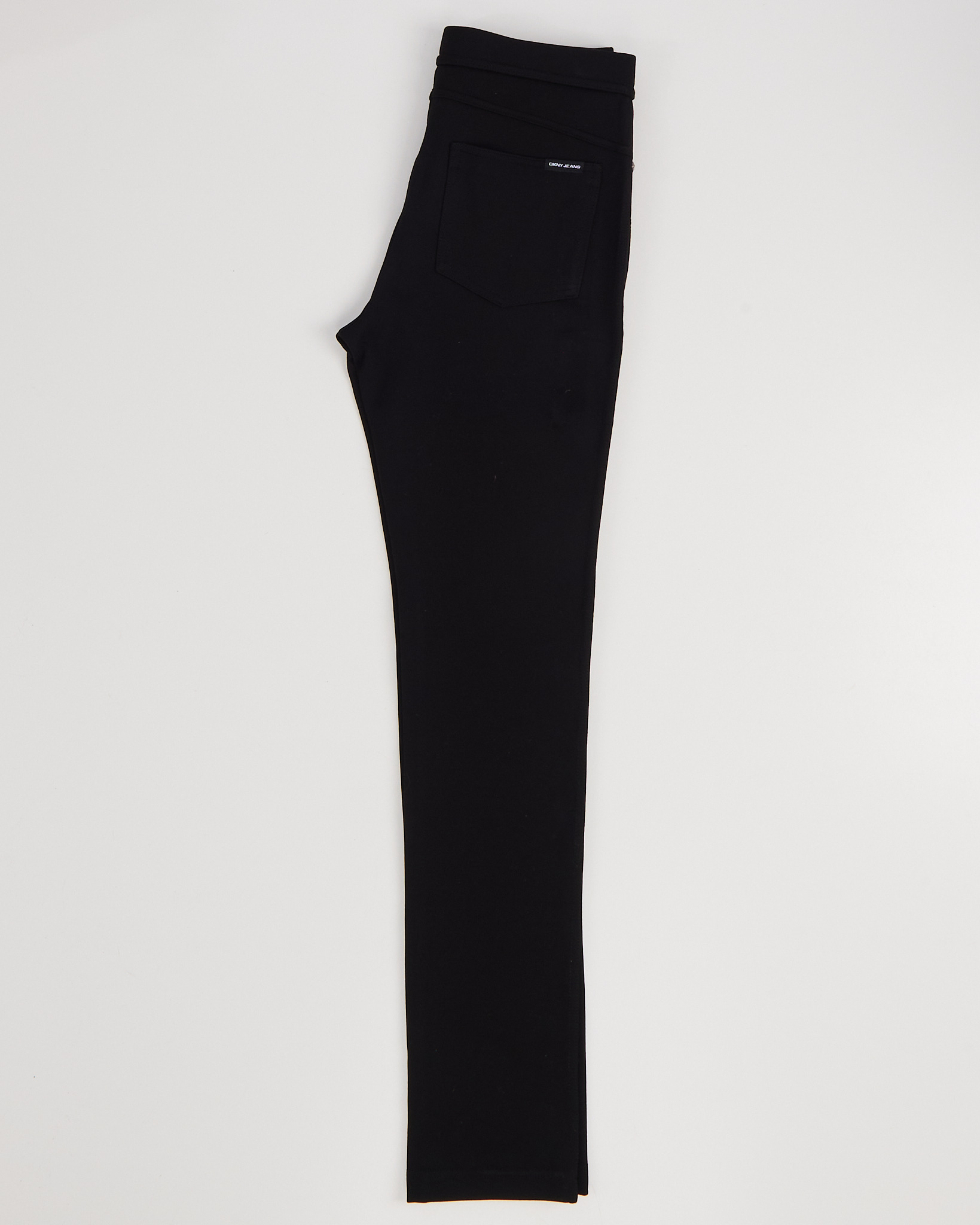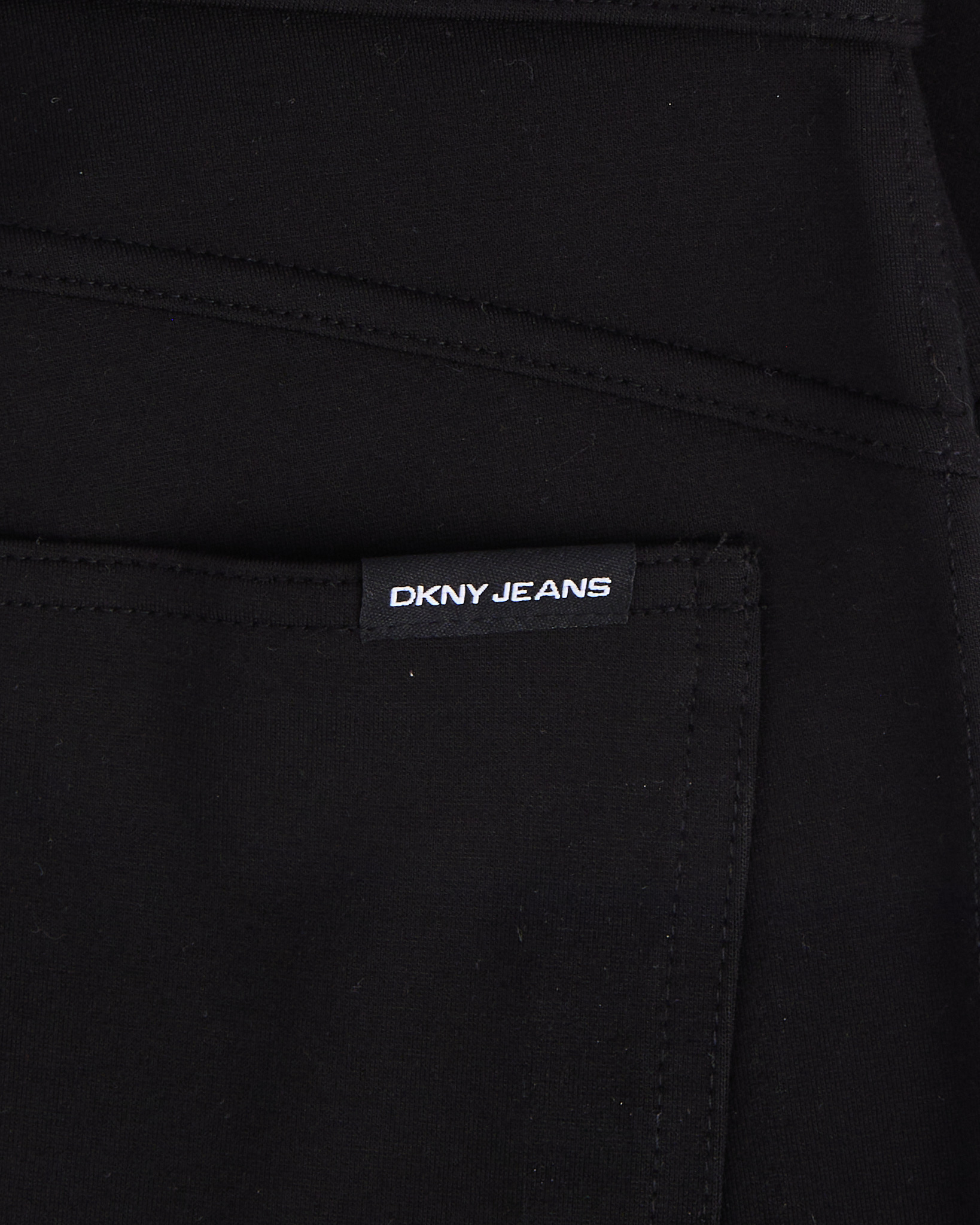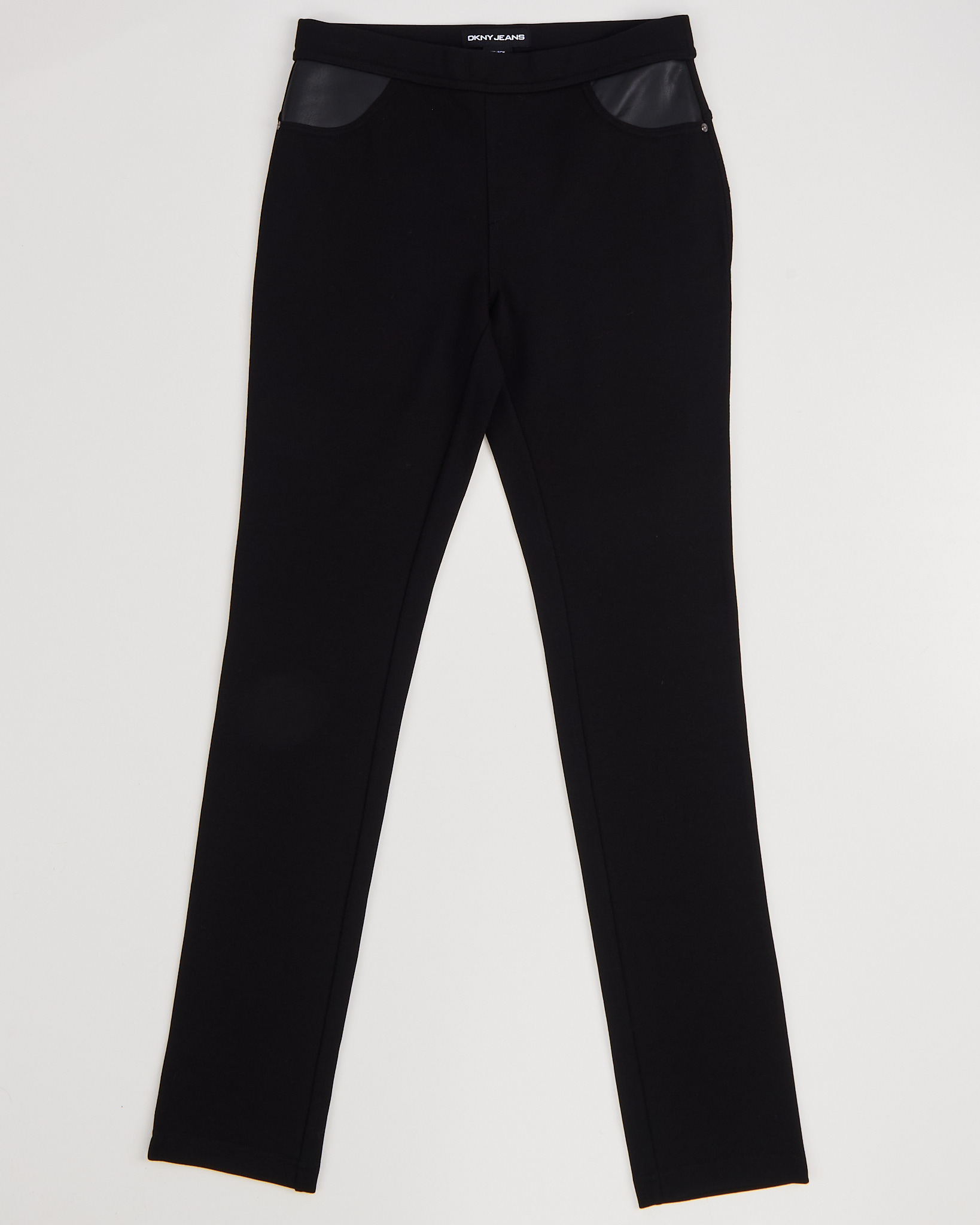 Брюки DKNY Jeans черного цвета. Средняя посадка. Прямой силуэт. Широкий пояс. Скрытая застежка. Сзади накладной карман с логотипом. Декоративные карманы из экокожи. По бокам металлические брендированные клепки.