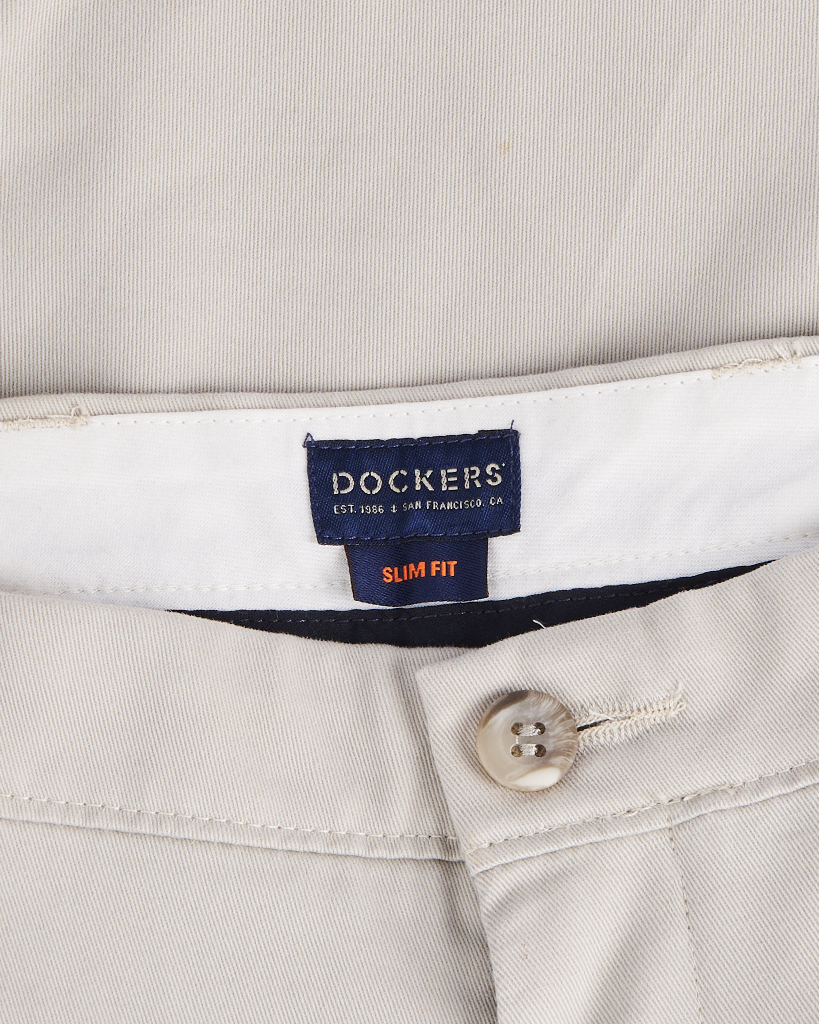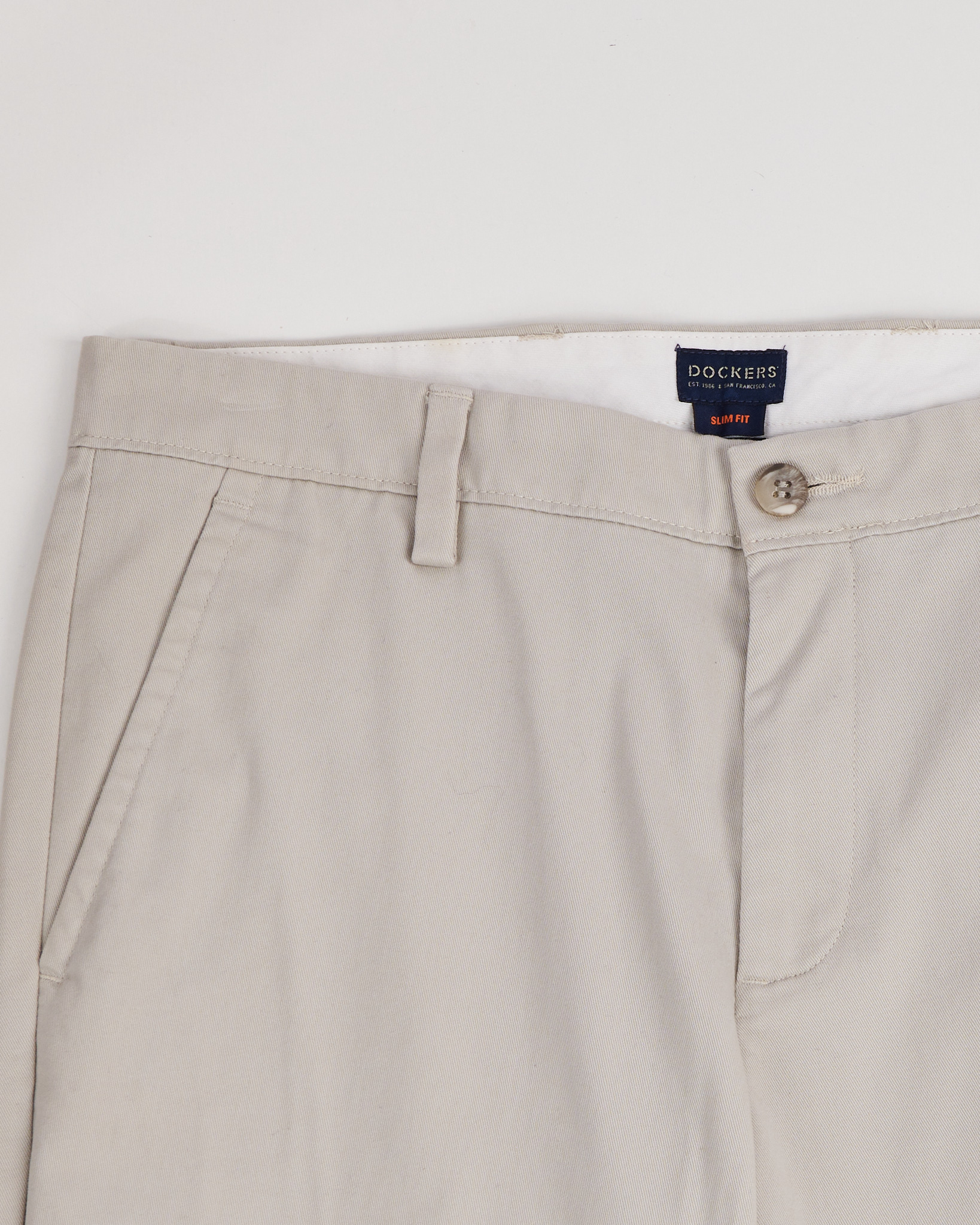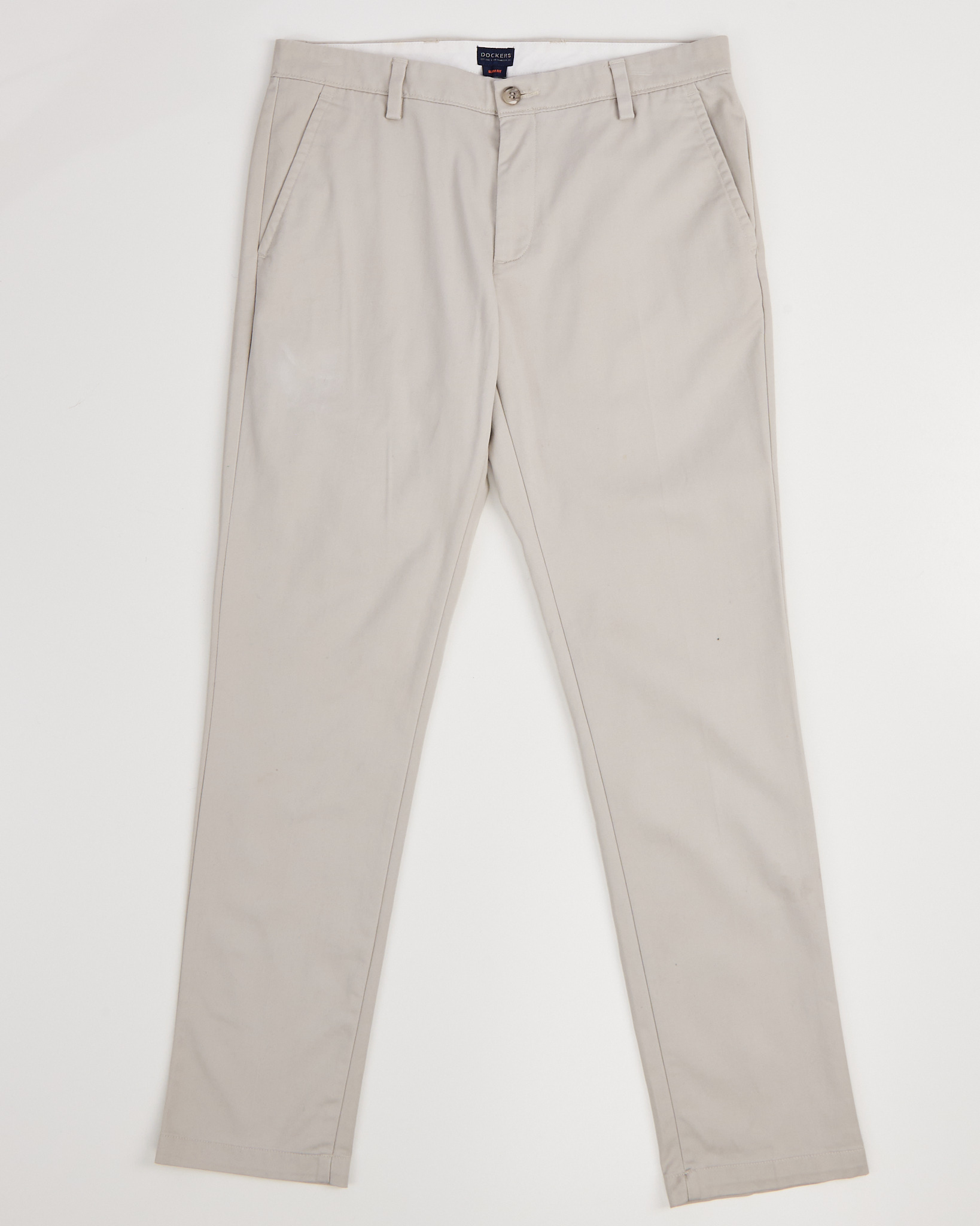 Брюки Dockers светло-бежевого цвета. Прямая посадка. Средняя линия талии. Пояс со шлевками. Застежка на пуговицу и молнию. Внутри фирменная отделка Slim Fit. Функциональные карманы.