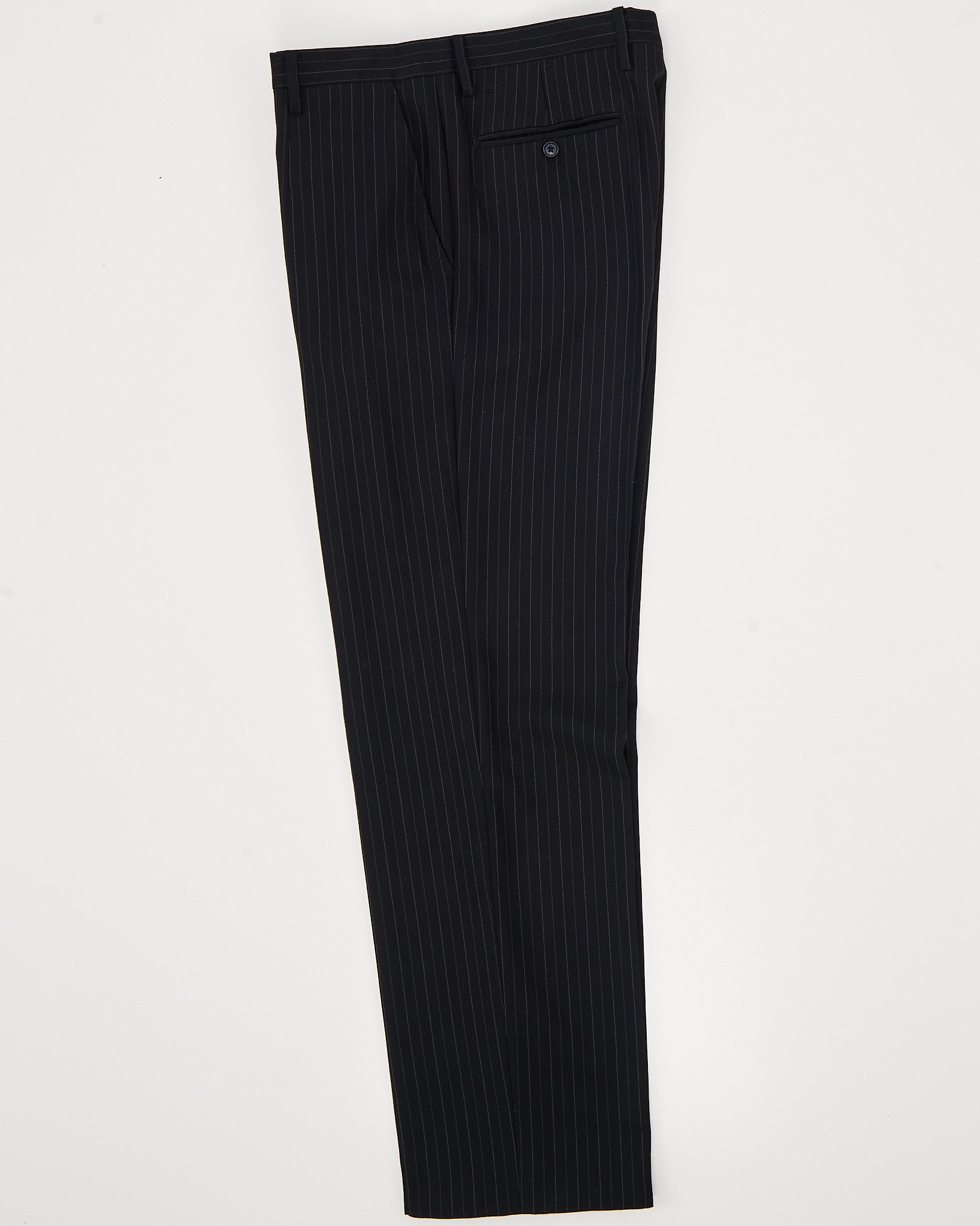 Классические брюки из тонкой шерсти с вертикальной полоской. Вытянутый силуэт, благодаря прямому крою и аккуратной посадке по талии. Внутренняя отделка с фирменной тесьмой, функциональные карманы.