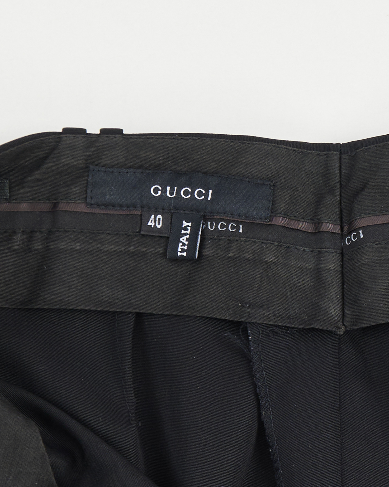Брюки из тонкой костюмной шерсти. Высокая посадка визуально удлиняющая силуэт. Фирменная отделка Gucci. Сделаны в Италии