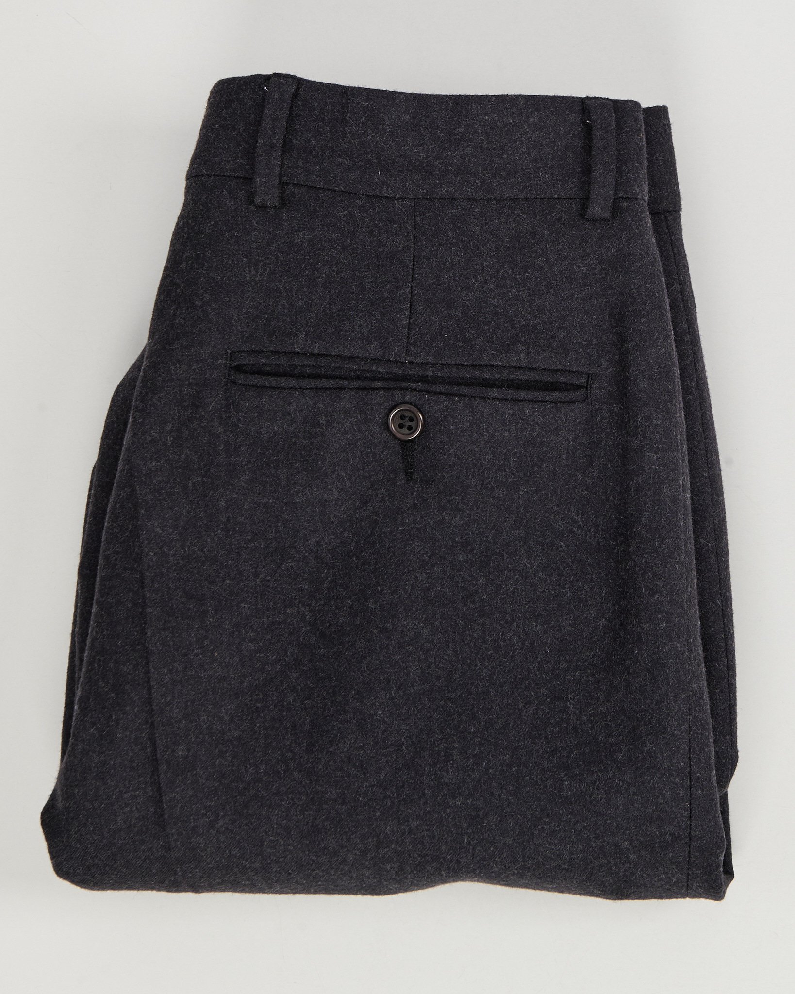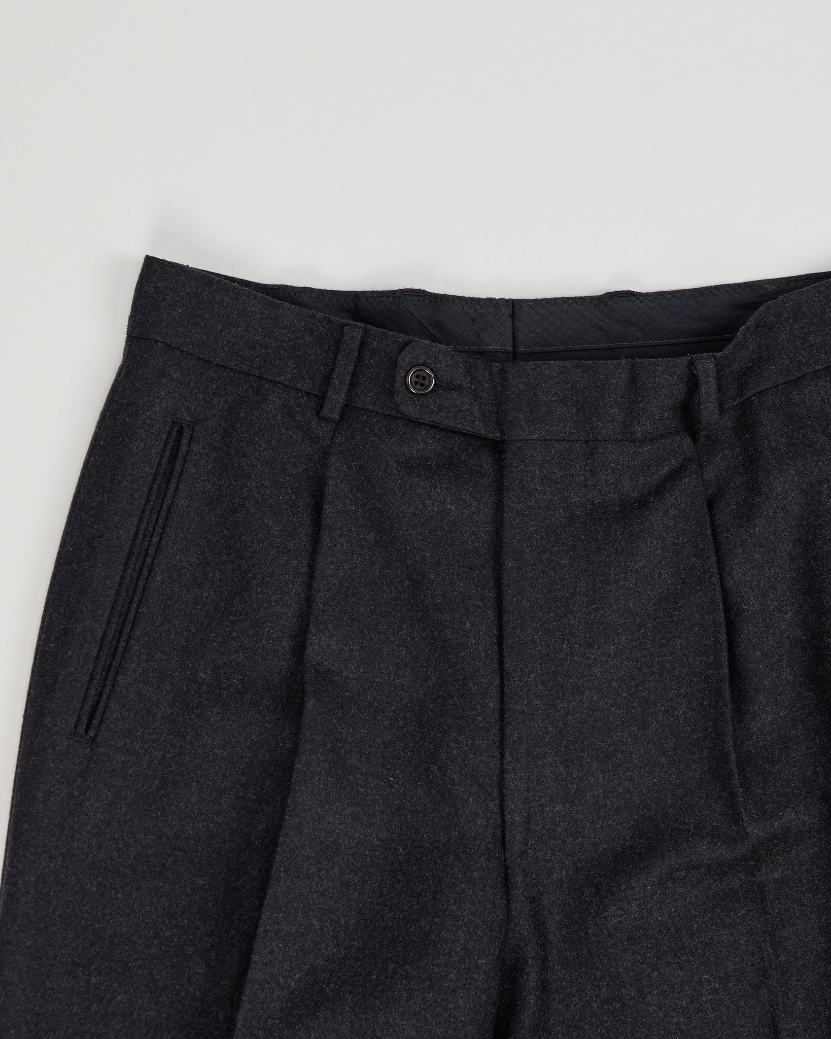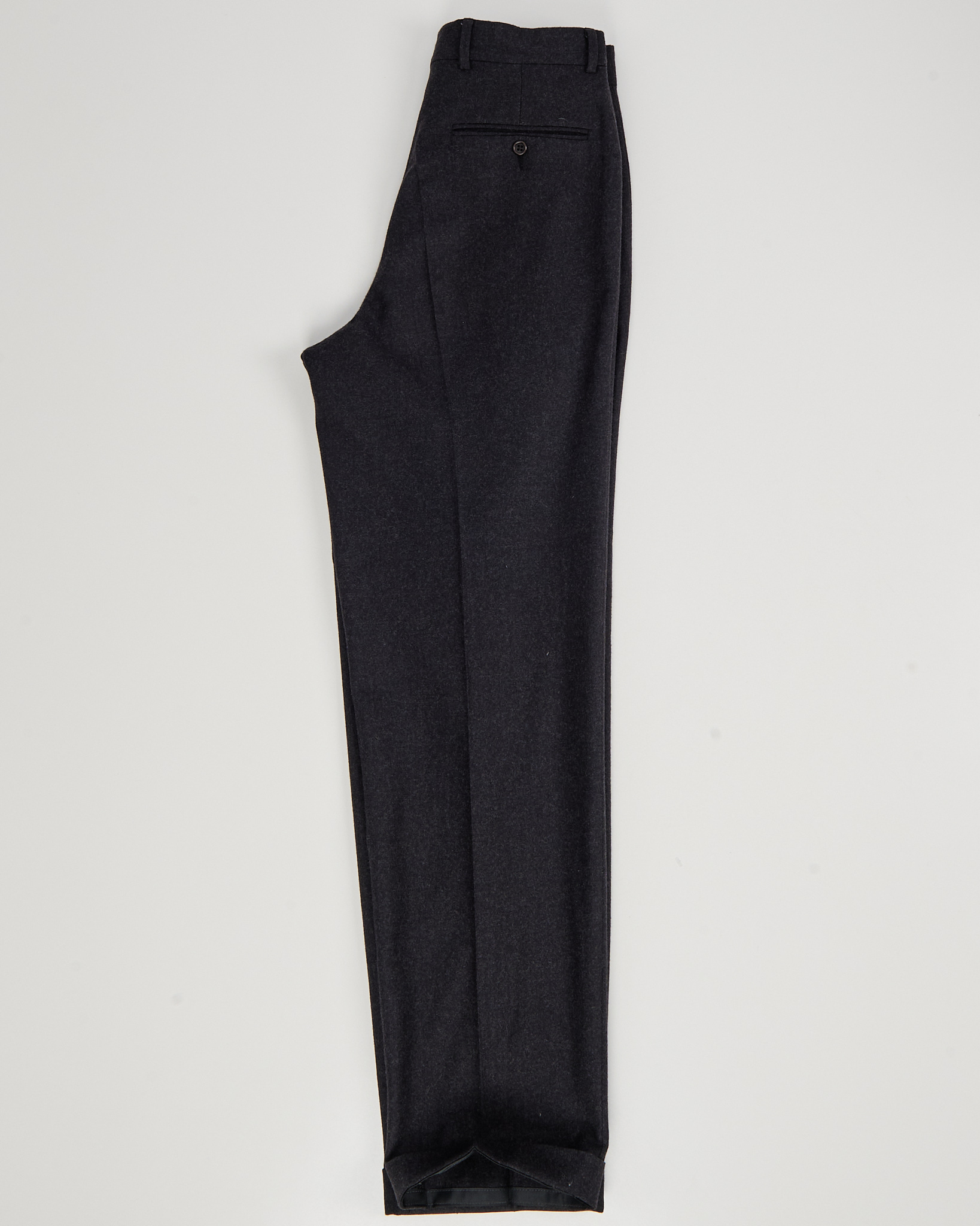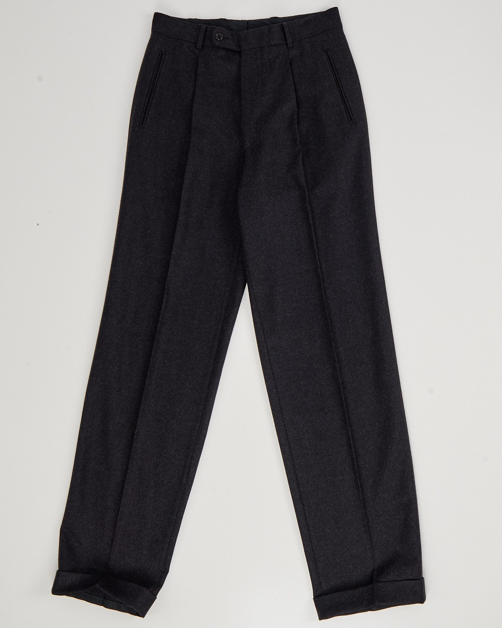 Брюки из 100% шерсти темно-серого цвета. Прямой крой, классические стрелки. По бокам функциональные карманы, брюки отмечены знаком woolmark.