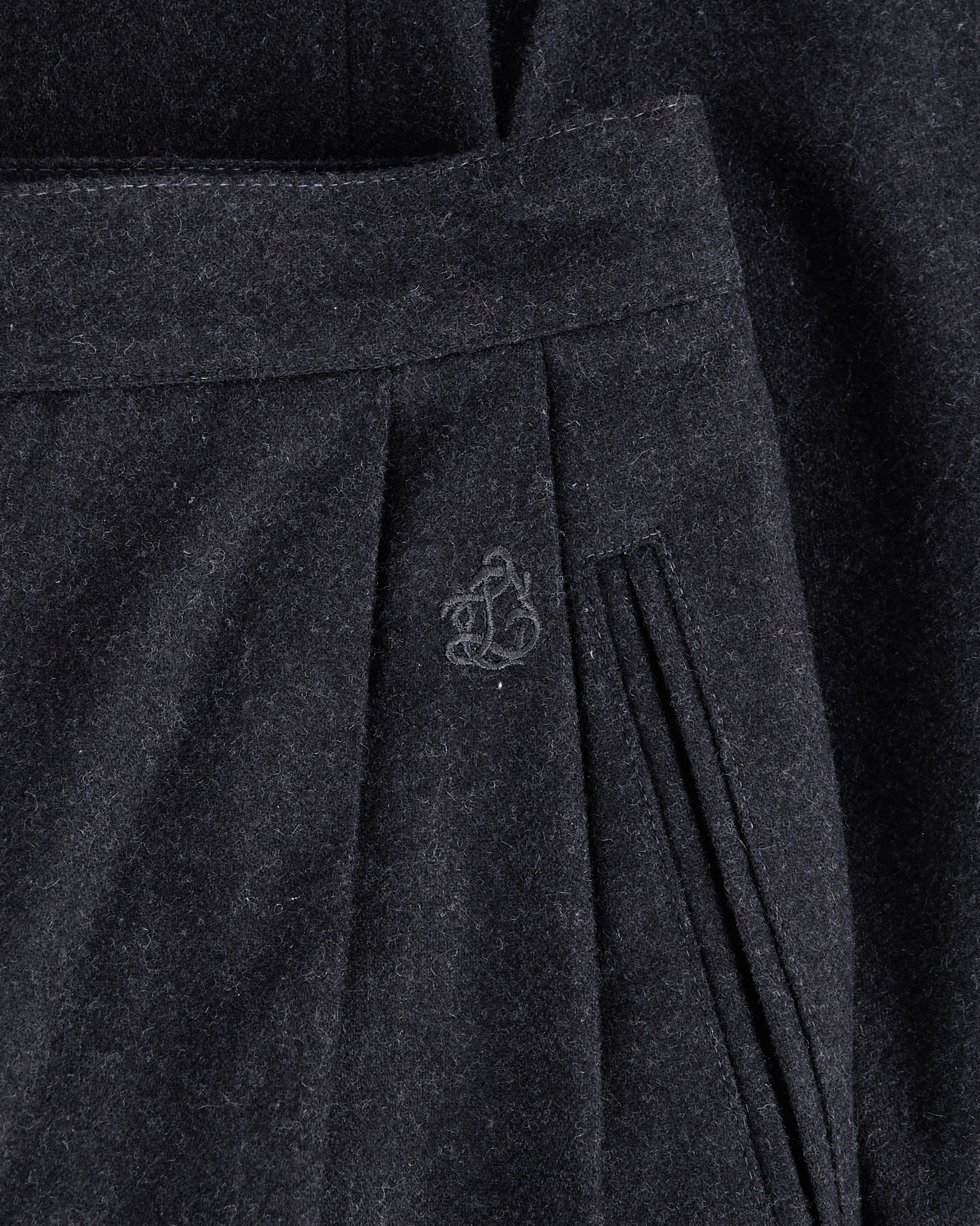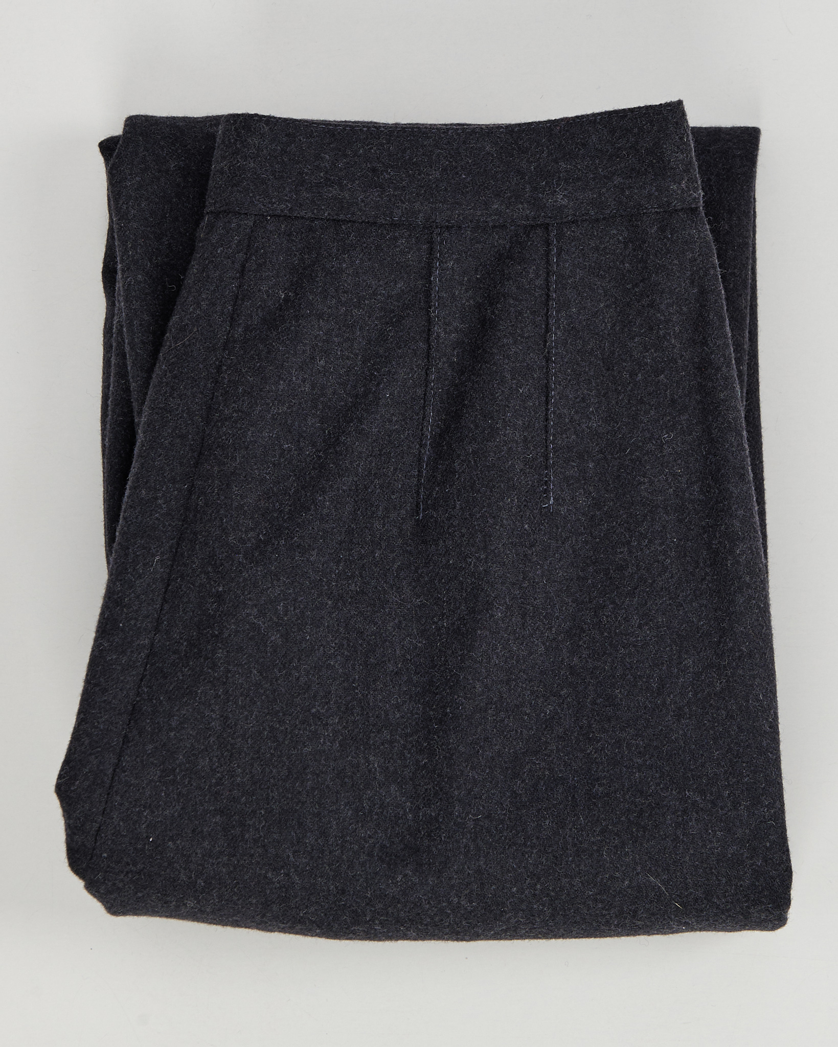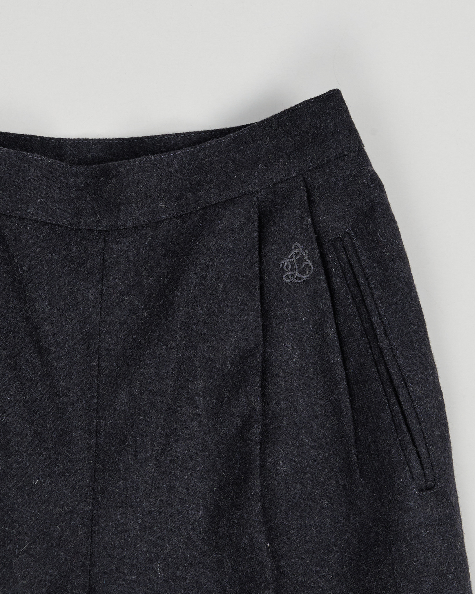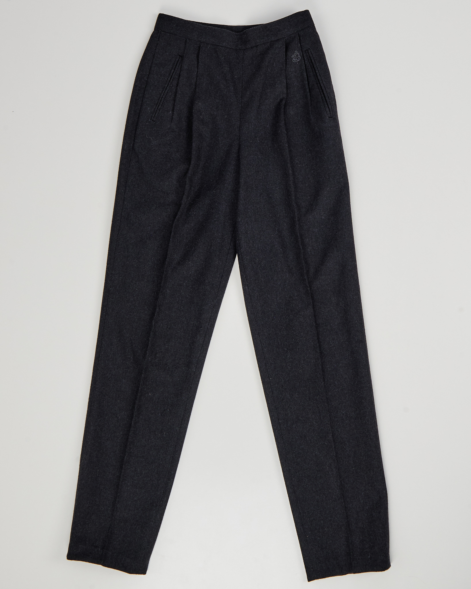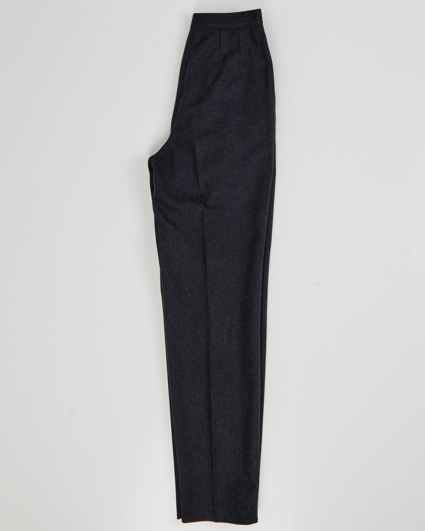 Брюки из шерсти с добавлением полиэстера темно-серого цвета. Высокая посадка, аккуратные защипы на талии. Два боковых прорезаных кармана. Сделаны в Италии.