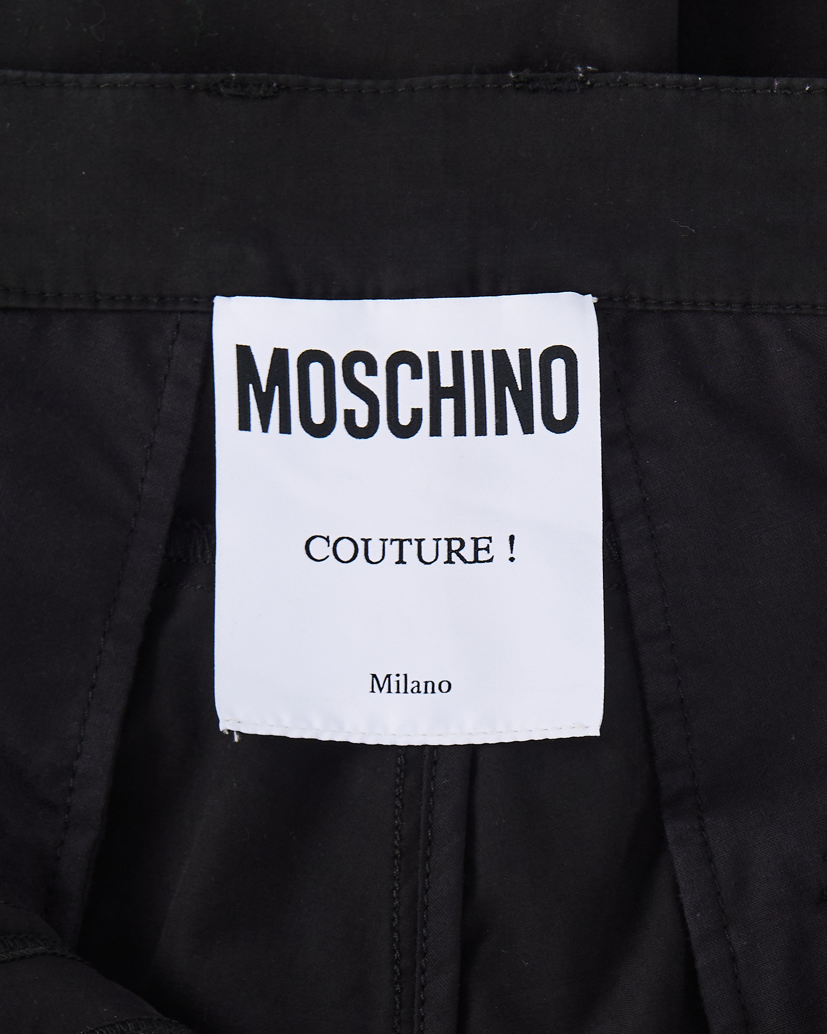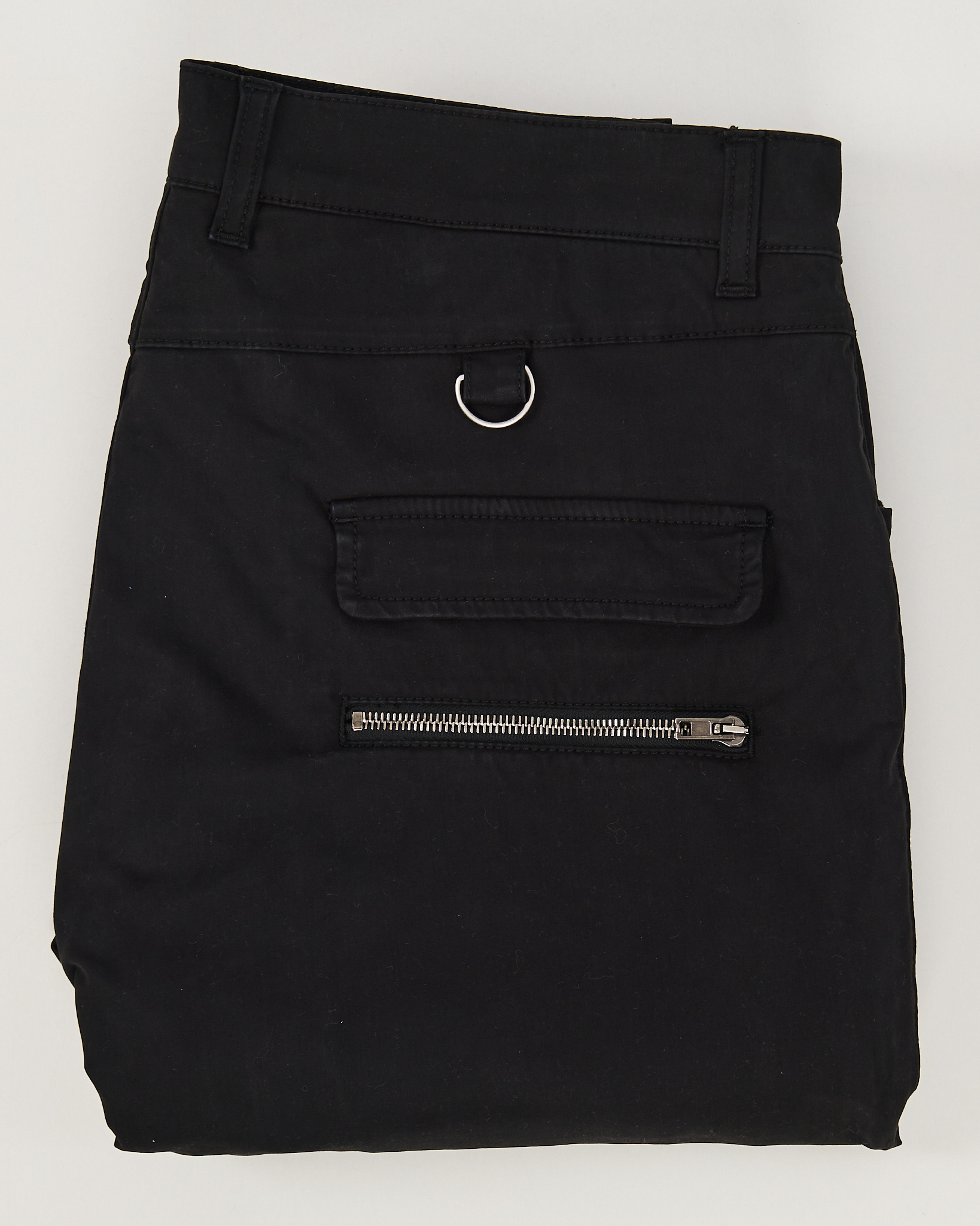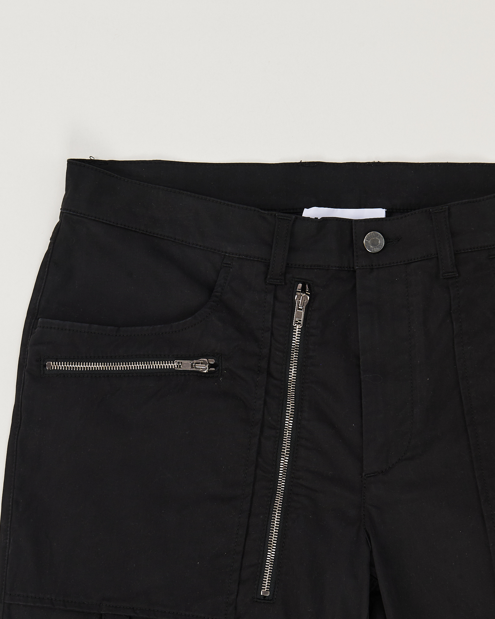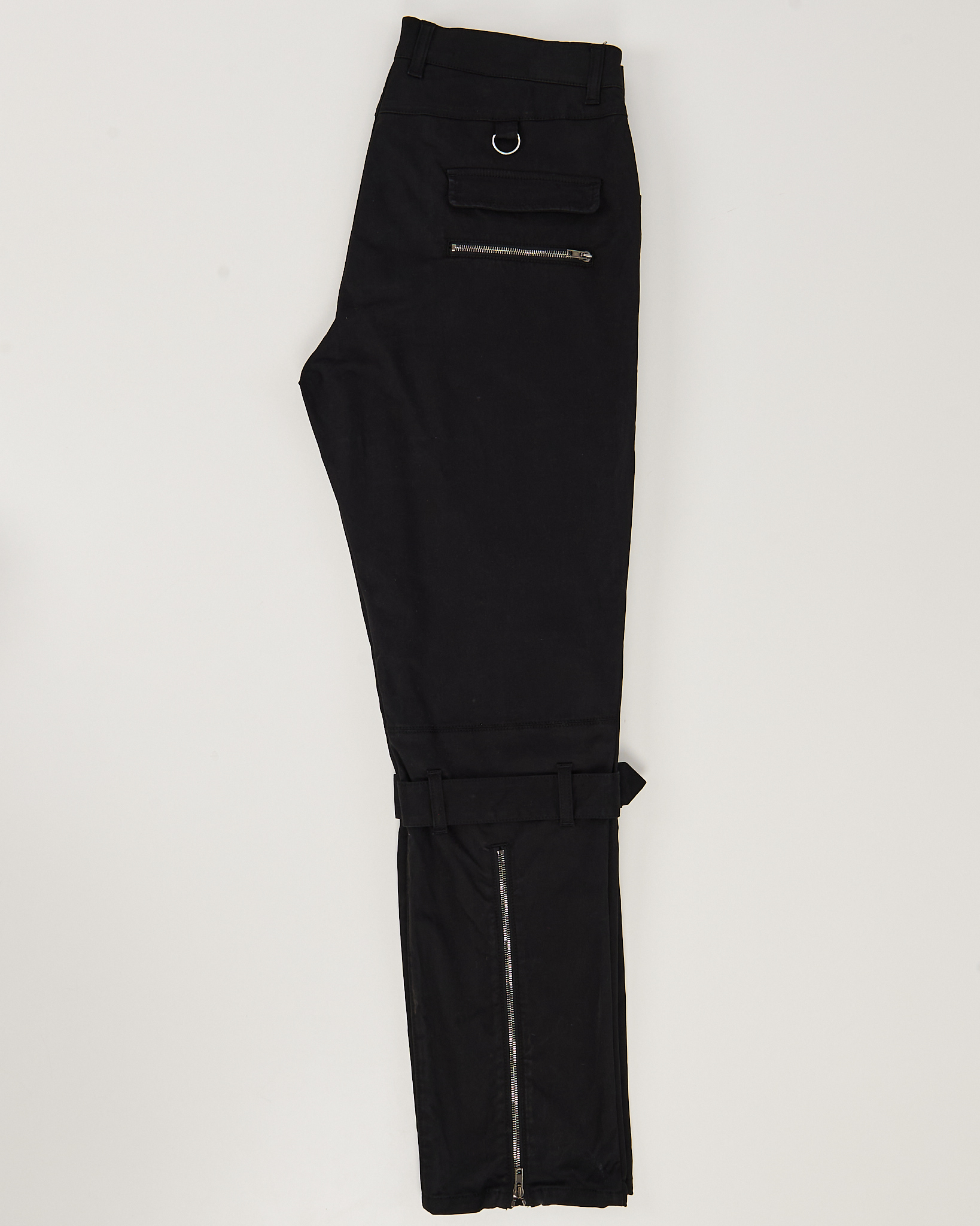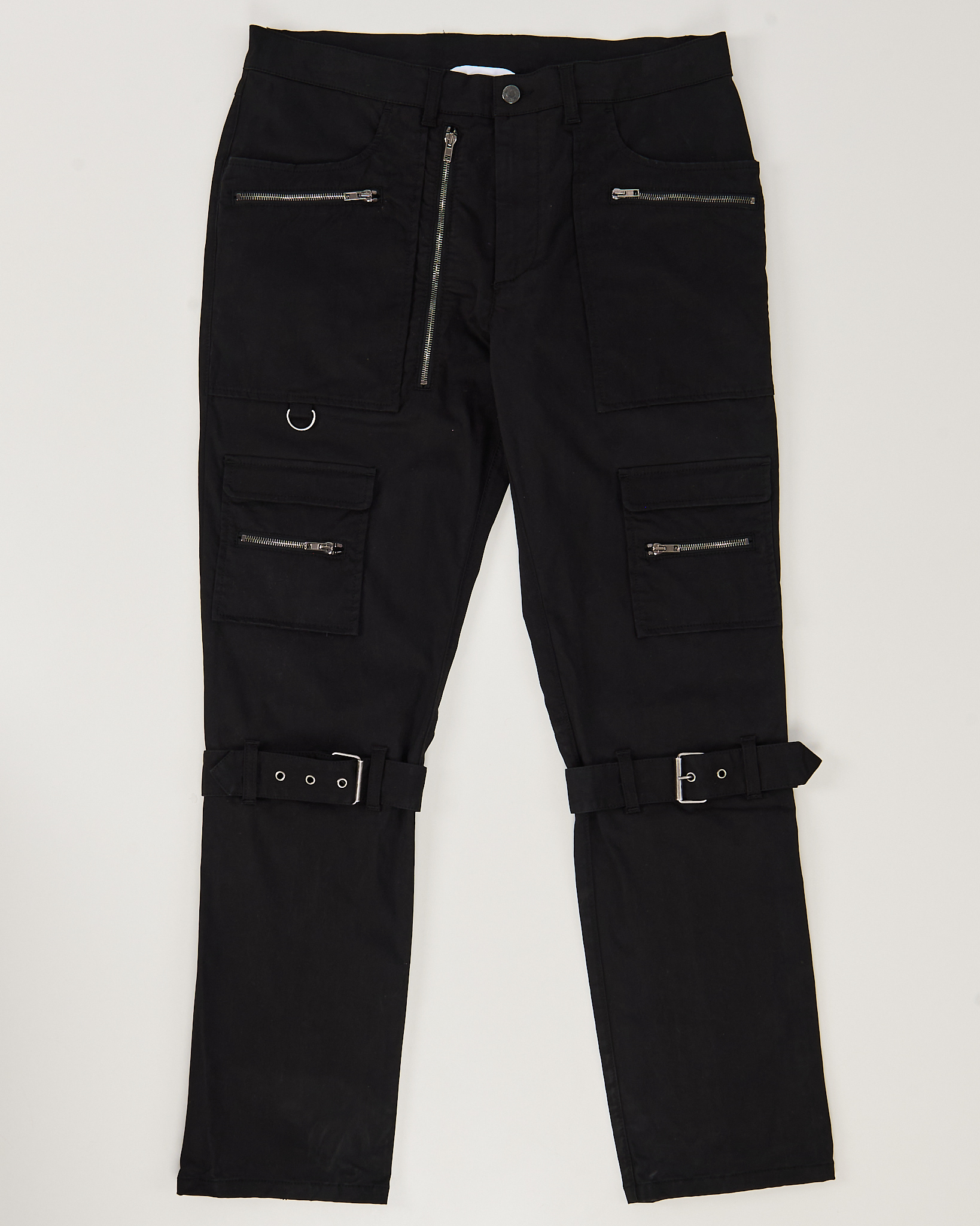 Чёрные брюки-карго Moschino из плотного хлопка. Прямой крой, акцентные ремешки, крупные накладные карманы. Акцентные молнии сзади.