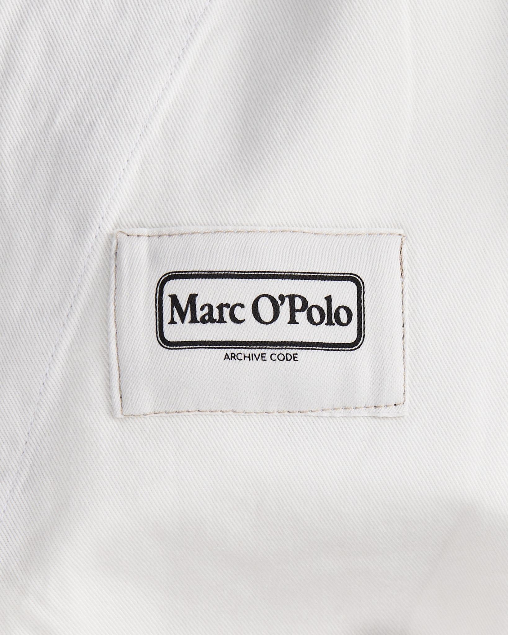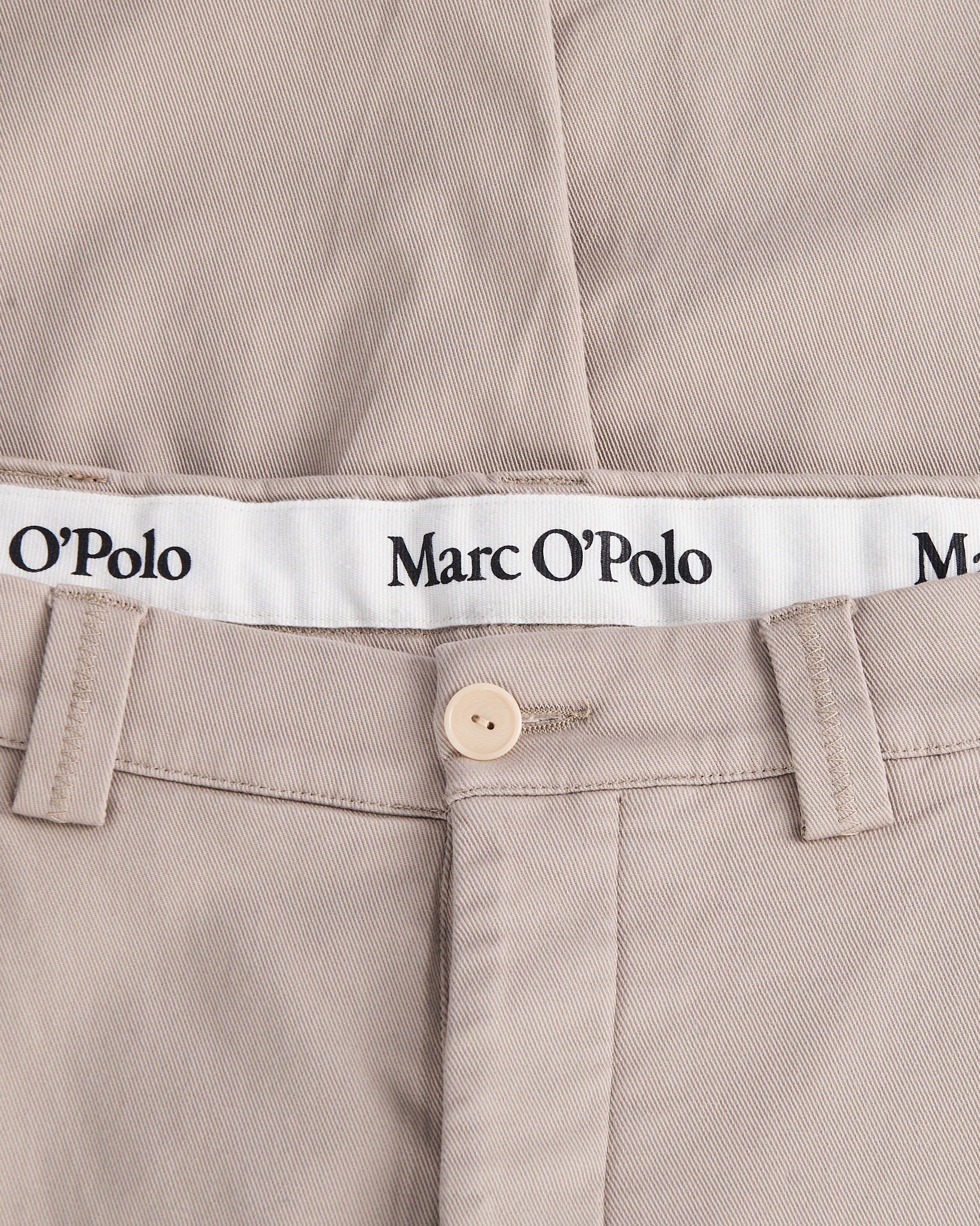 Брюки Marc O’Polo из плотной хлопковой ткани светлого бежевого оттенка. Посадка высокая, спереди заложены складки, линия брюк формирует свободный и аккуратный силуэт. Функциональные карманы.