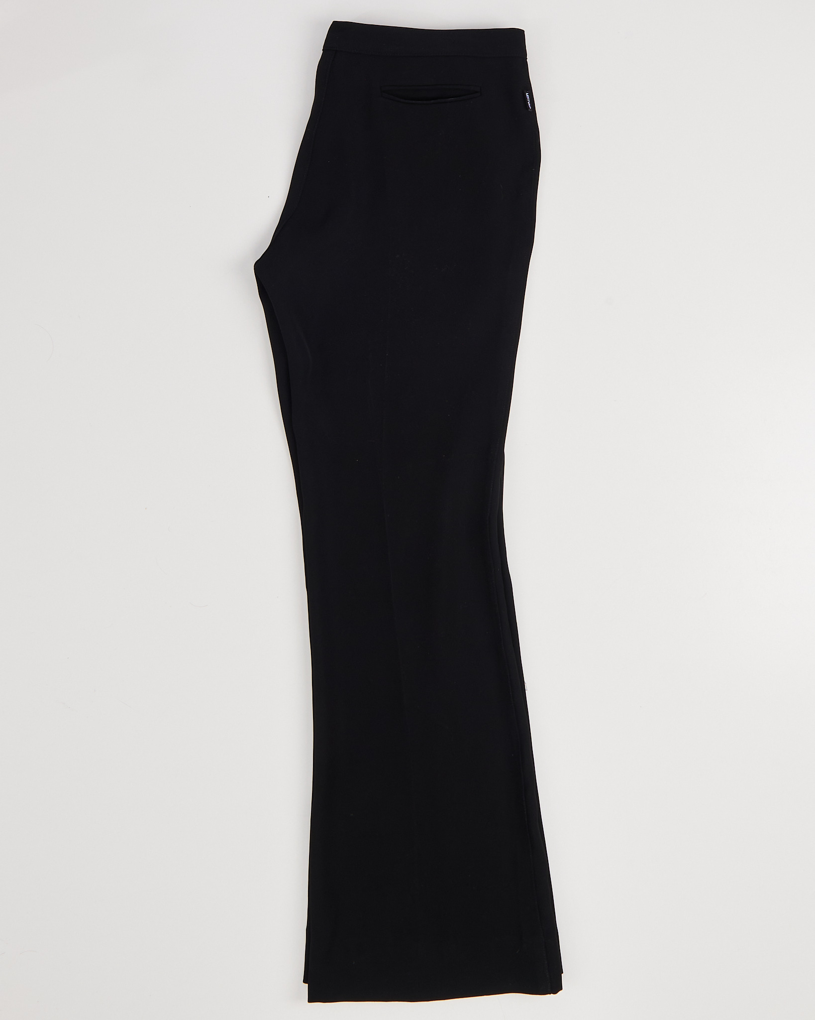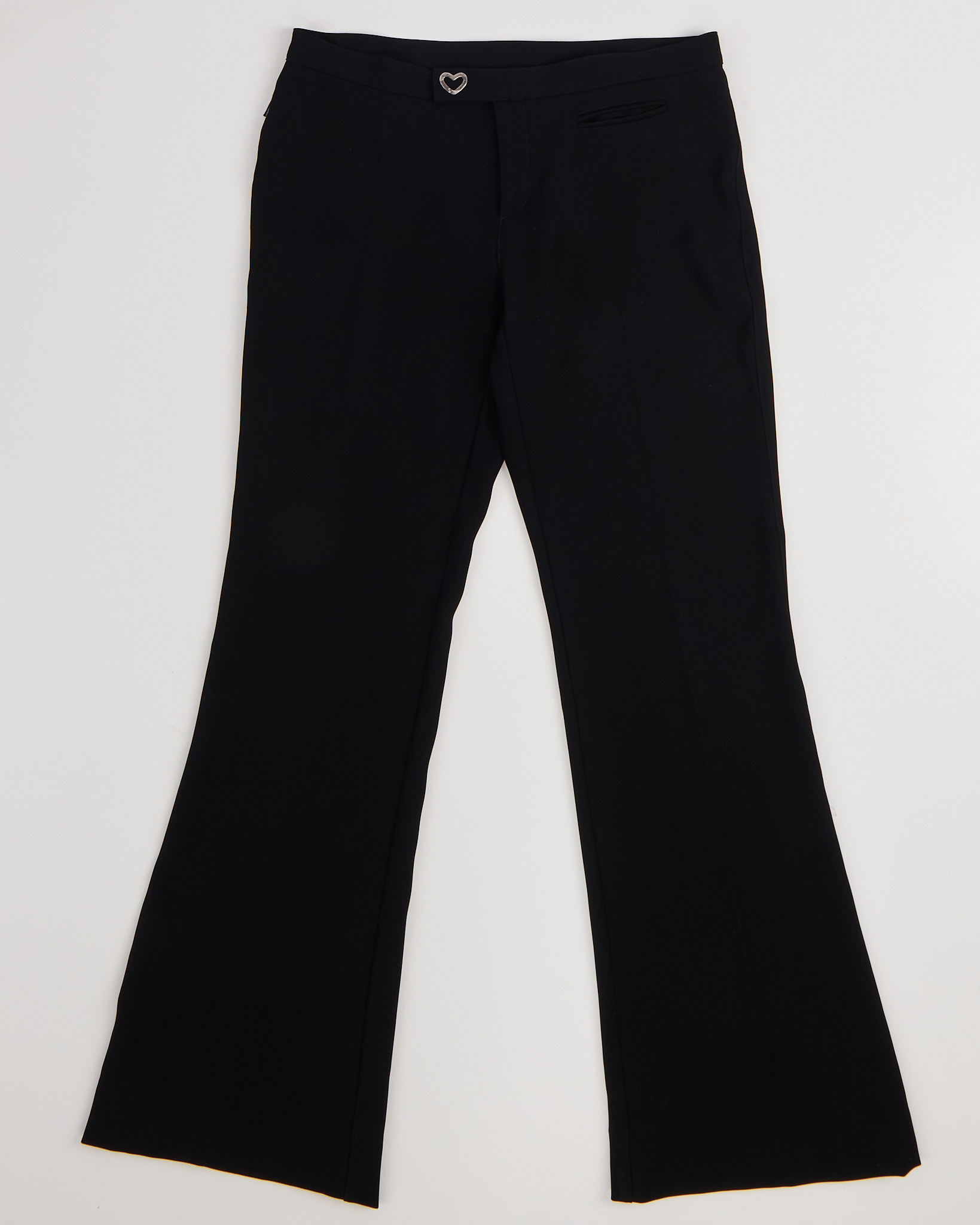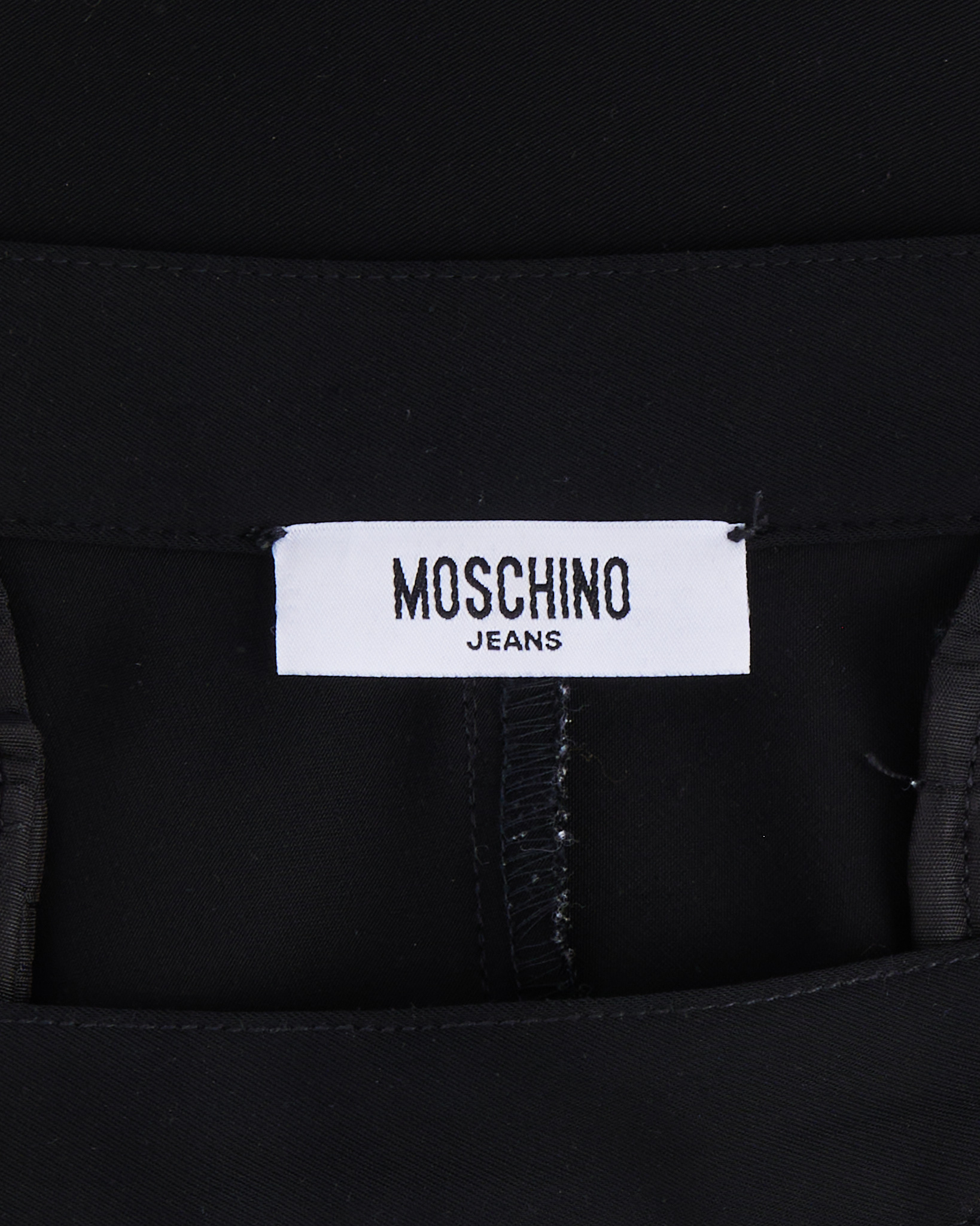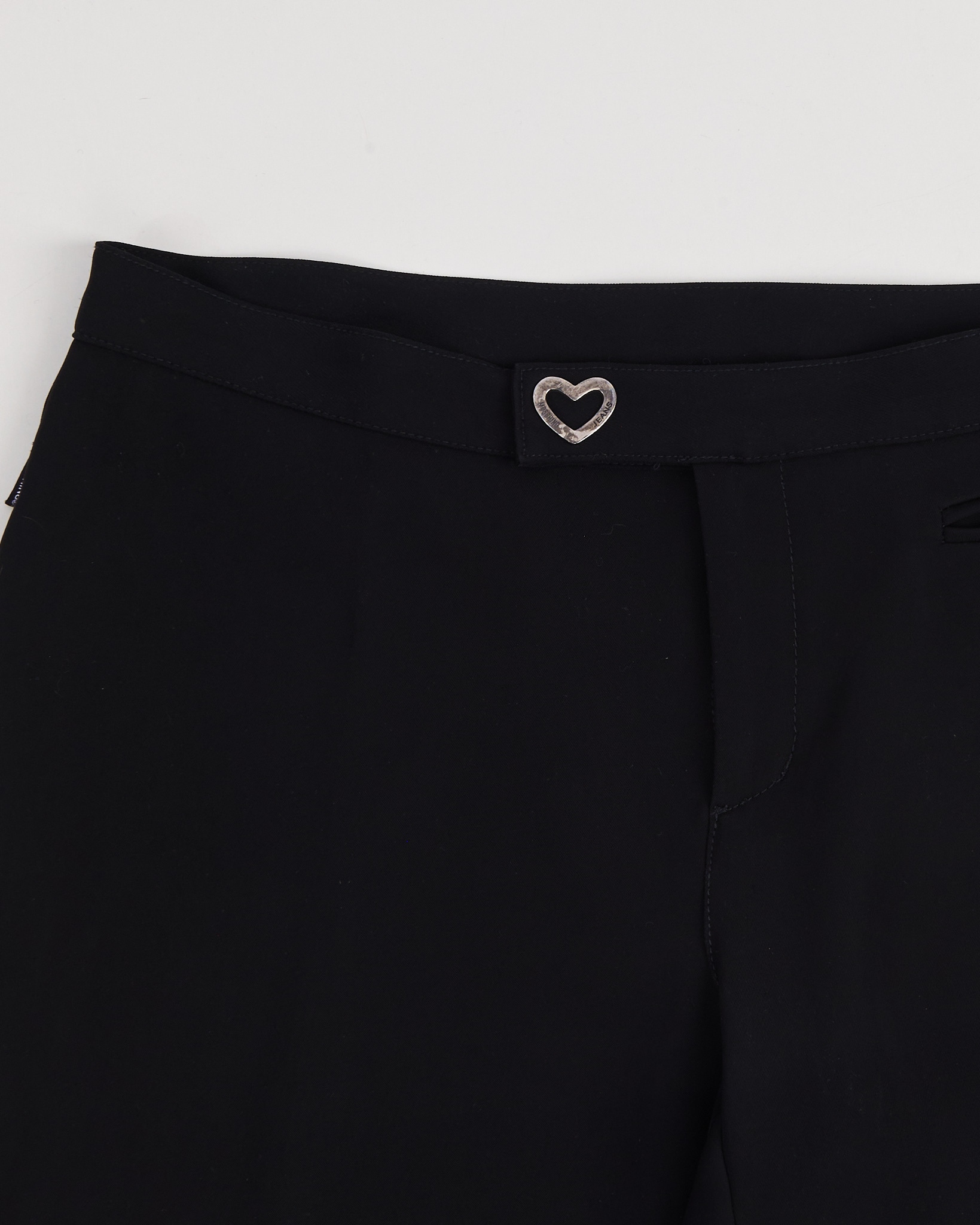 Брюки Moschino черного цвета. Посадка на талии. Пояс с декоративной металлической пряжкой в форме сердца. Застежка скрыта. Сзади функциональный карман.