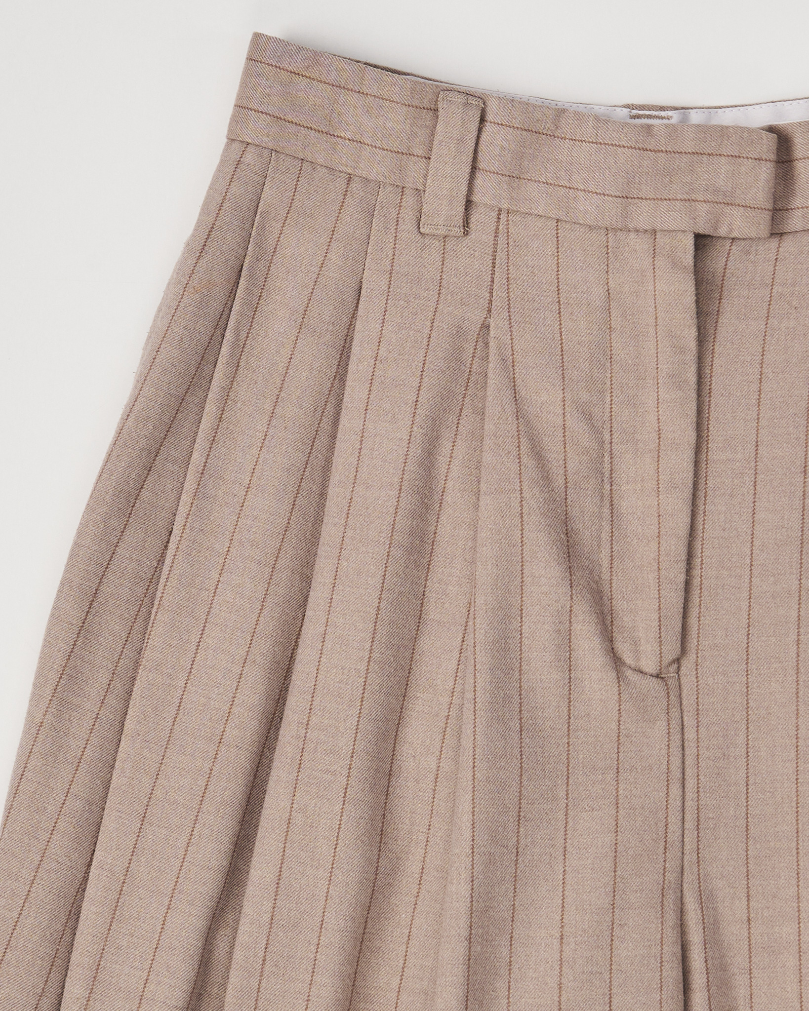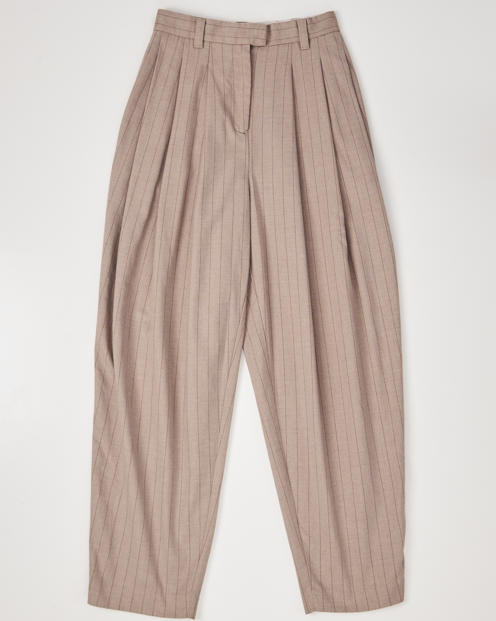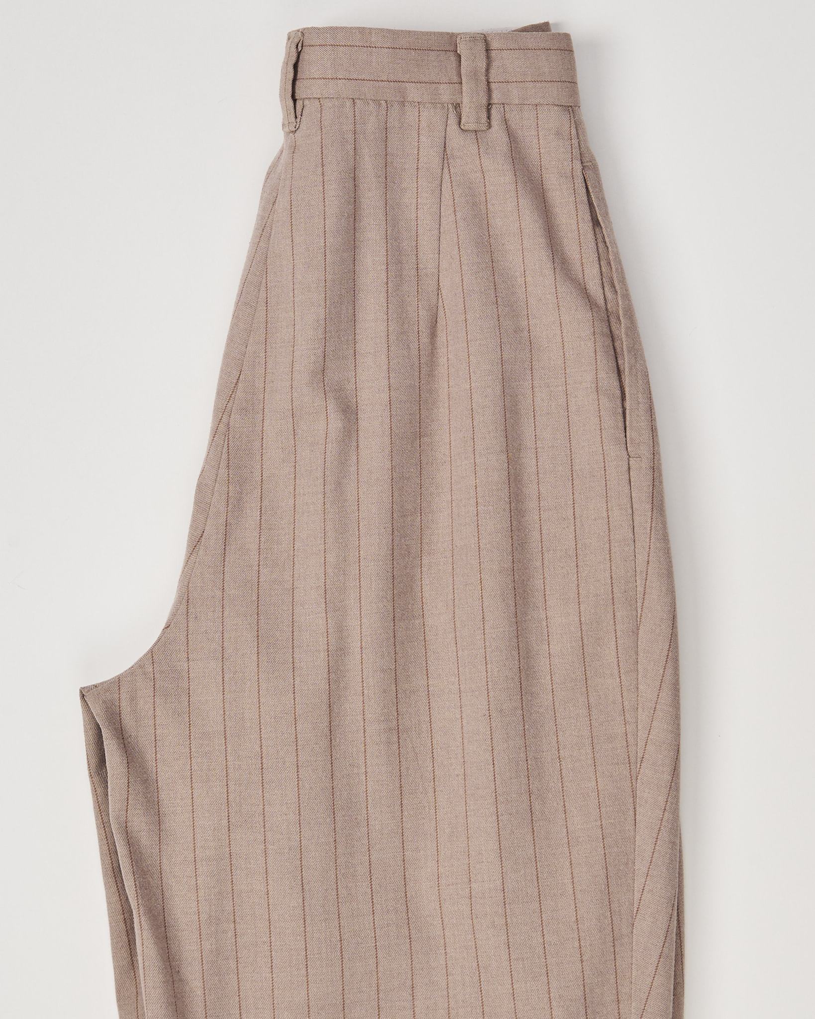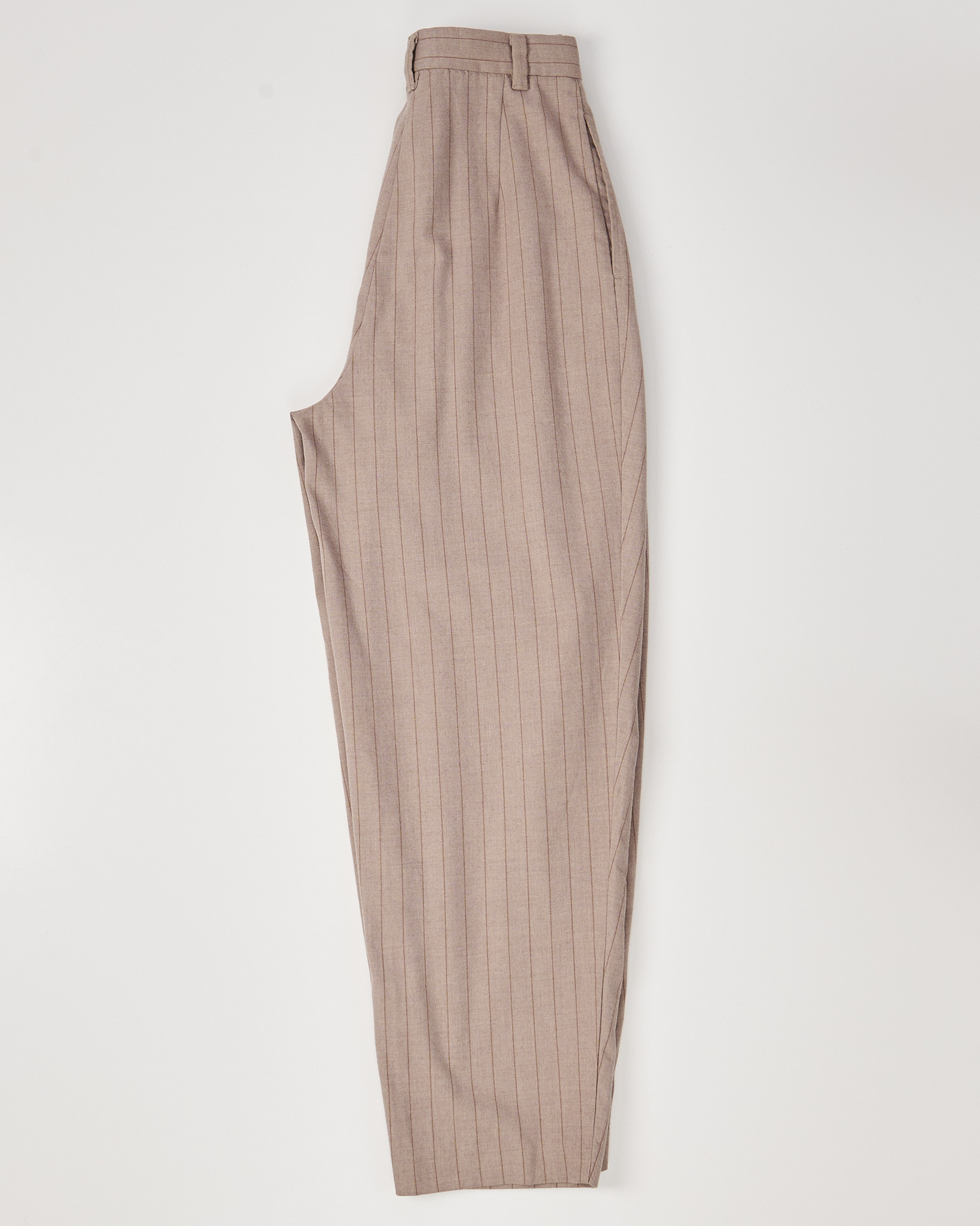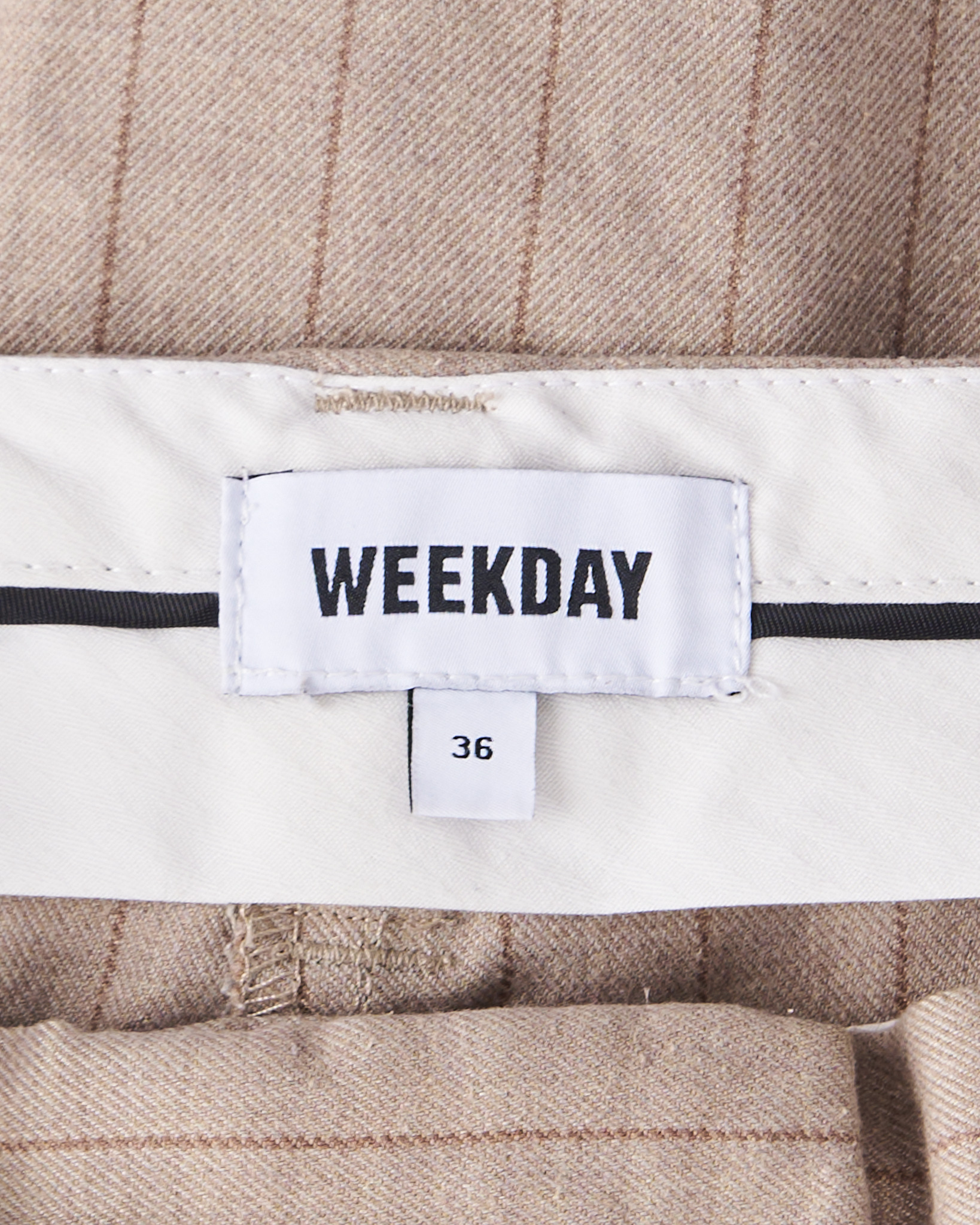 Брюки WEEKDAY в тонкую полоску из плотной костюмной ткани. Посадка высокая, штанины свободные, силуэт сужается к низу. Вертикальная полоска визуально вытягивает силуэт. Функциональные карманы по бокам, застежка на молнию и крючок.