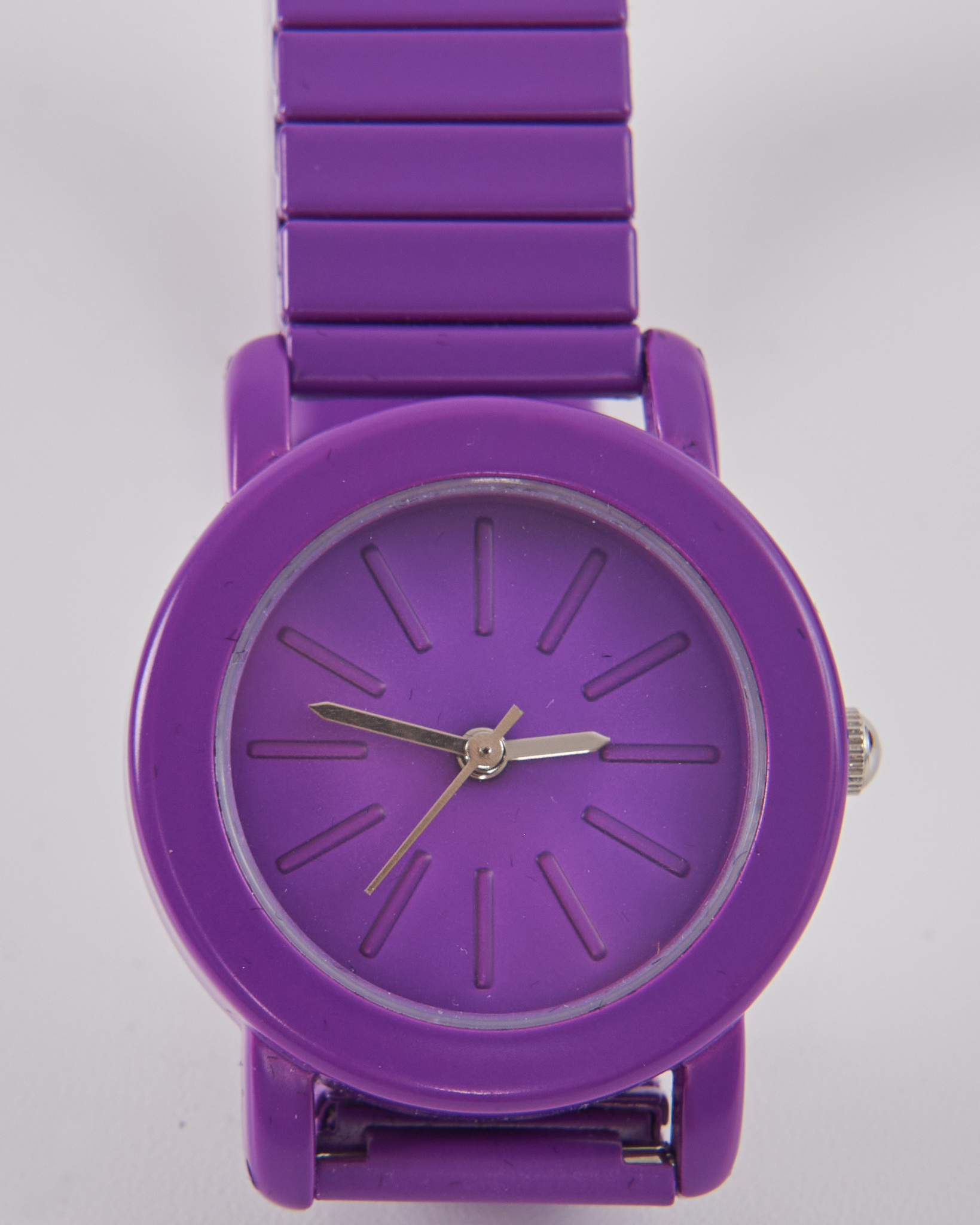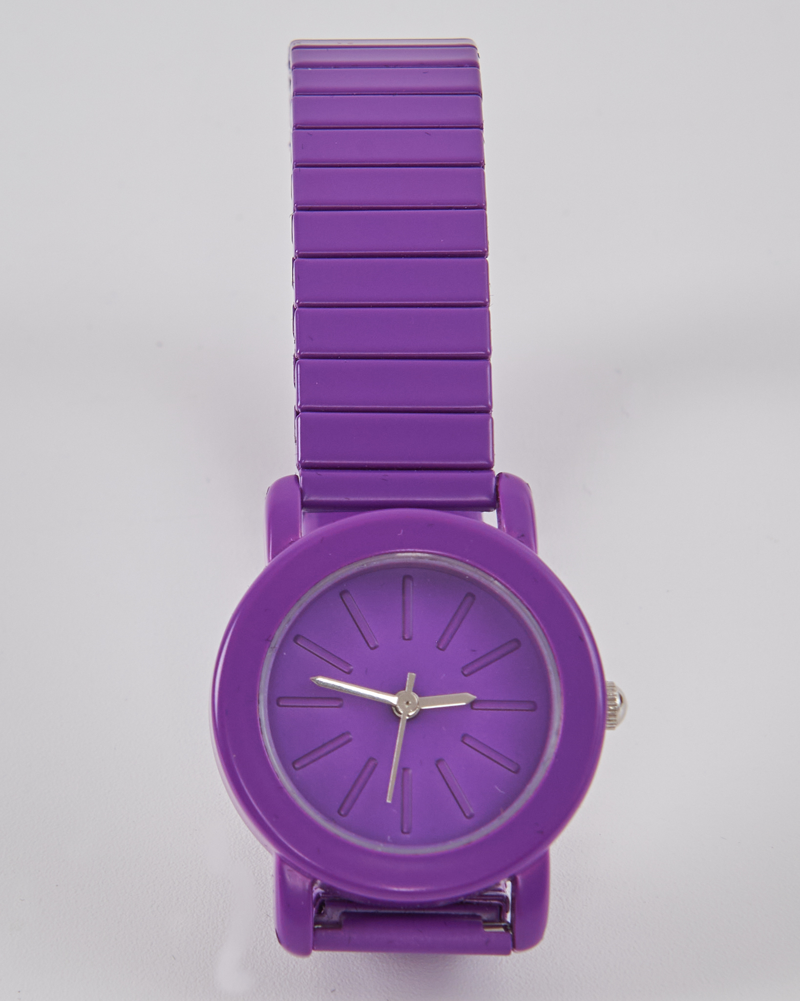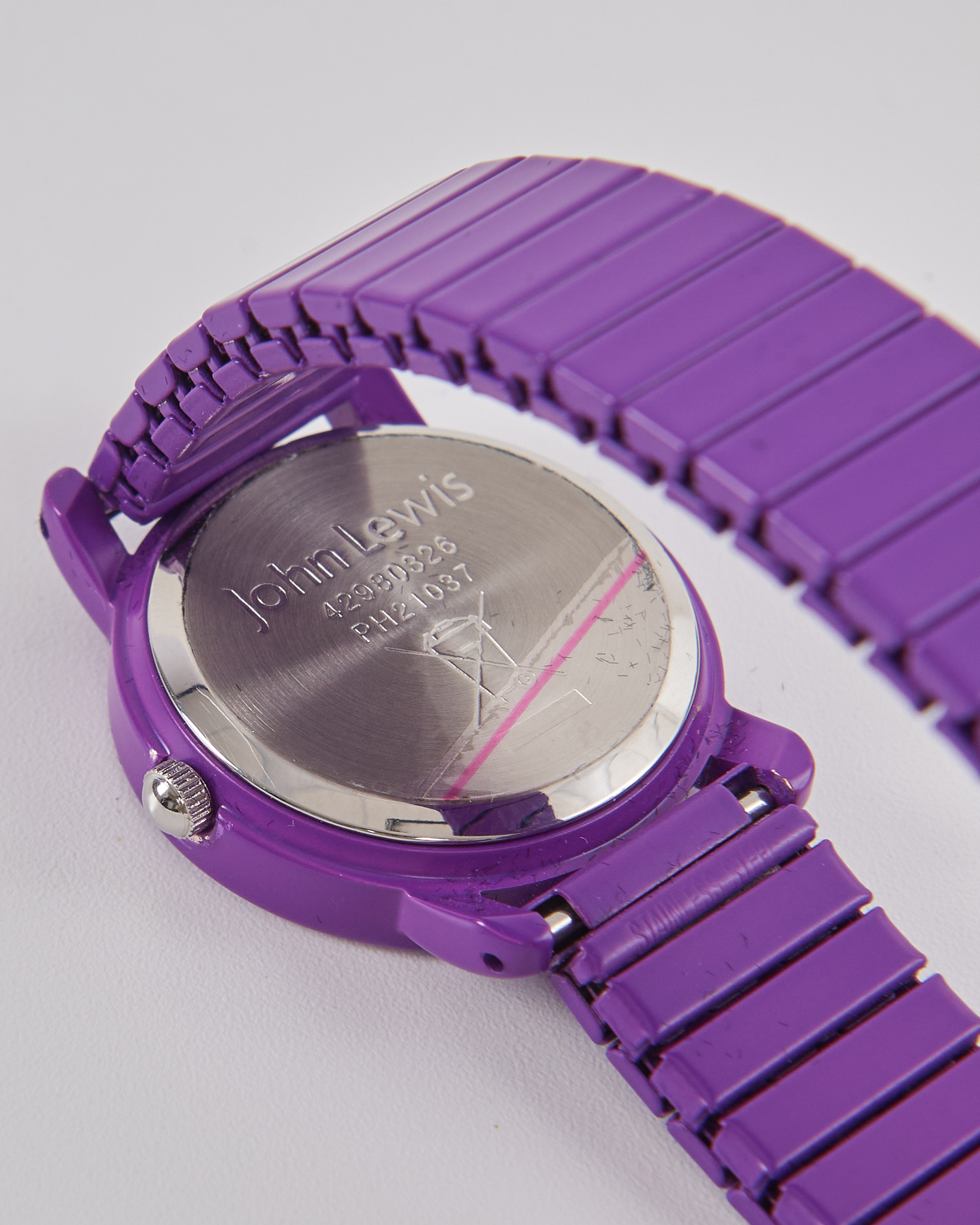 Часы John Lewis с матовым покрытием. Корпус и браслет выполнены в насыщенном фиолетовом оттенке, поверхность ровная и приятная на ощупь. Гибкий браслет адаптируется под форму руки. Минималистичный циферблат с тонкими метками в цвет корпуса.
