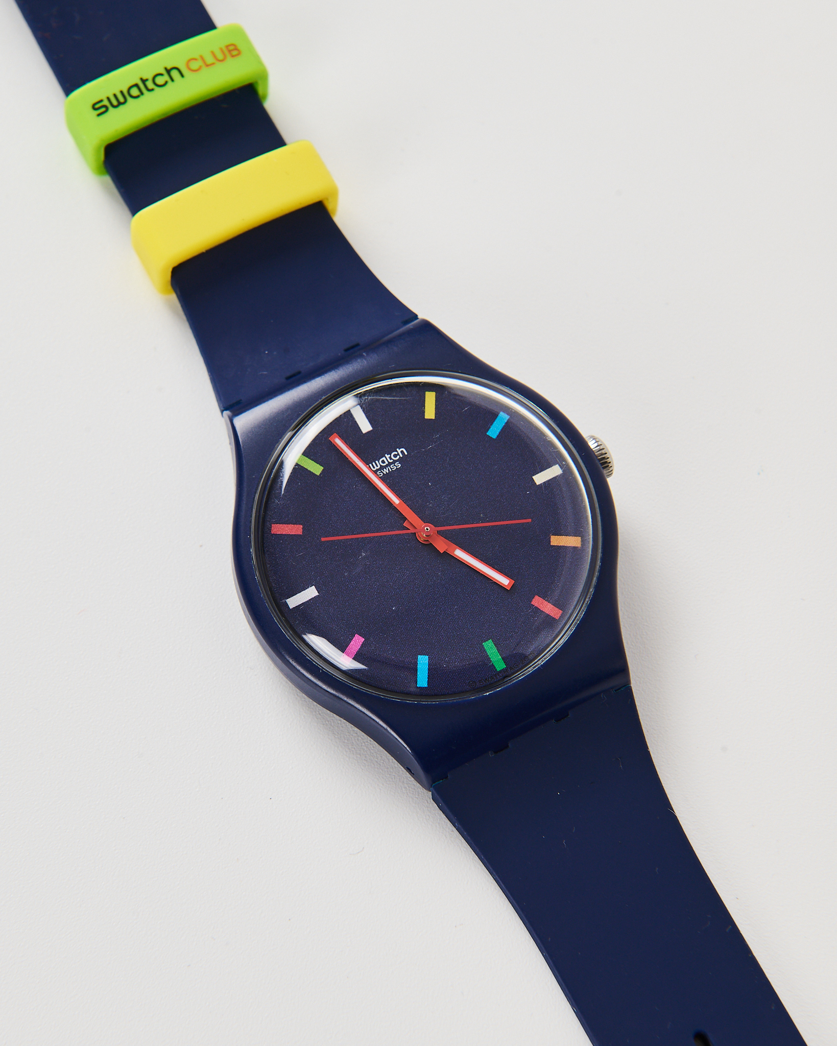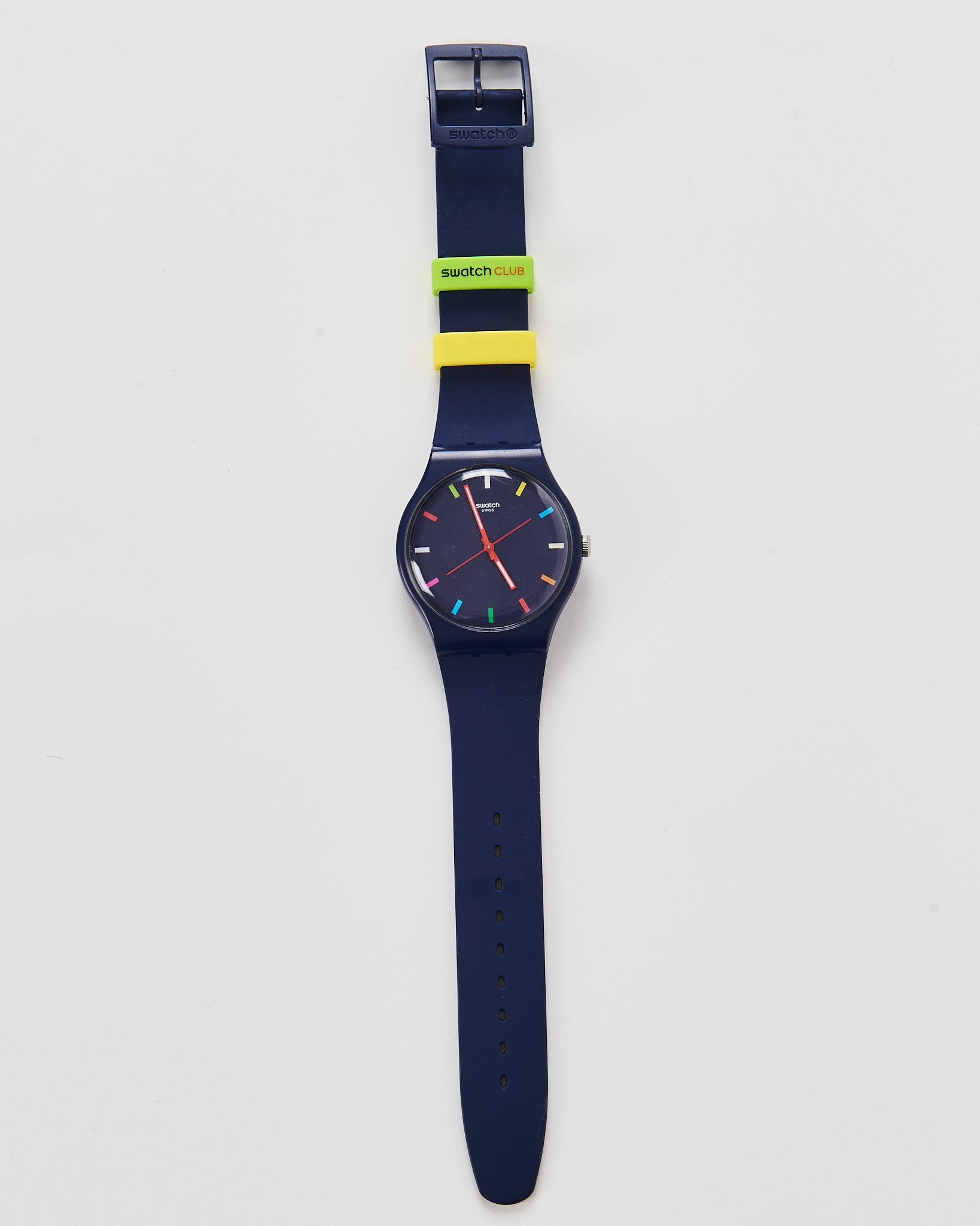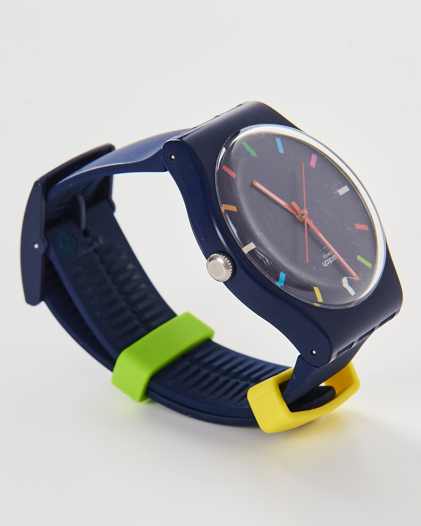 Часы Swiss в синем цвете. Часы комфортны в носке, благодаря гибкому браслету. Компактный циферблат с тонкими красными стрелками, акцентные желтые и зеленые крепления на ремешках.