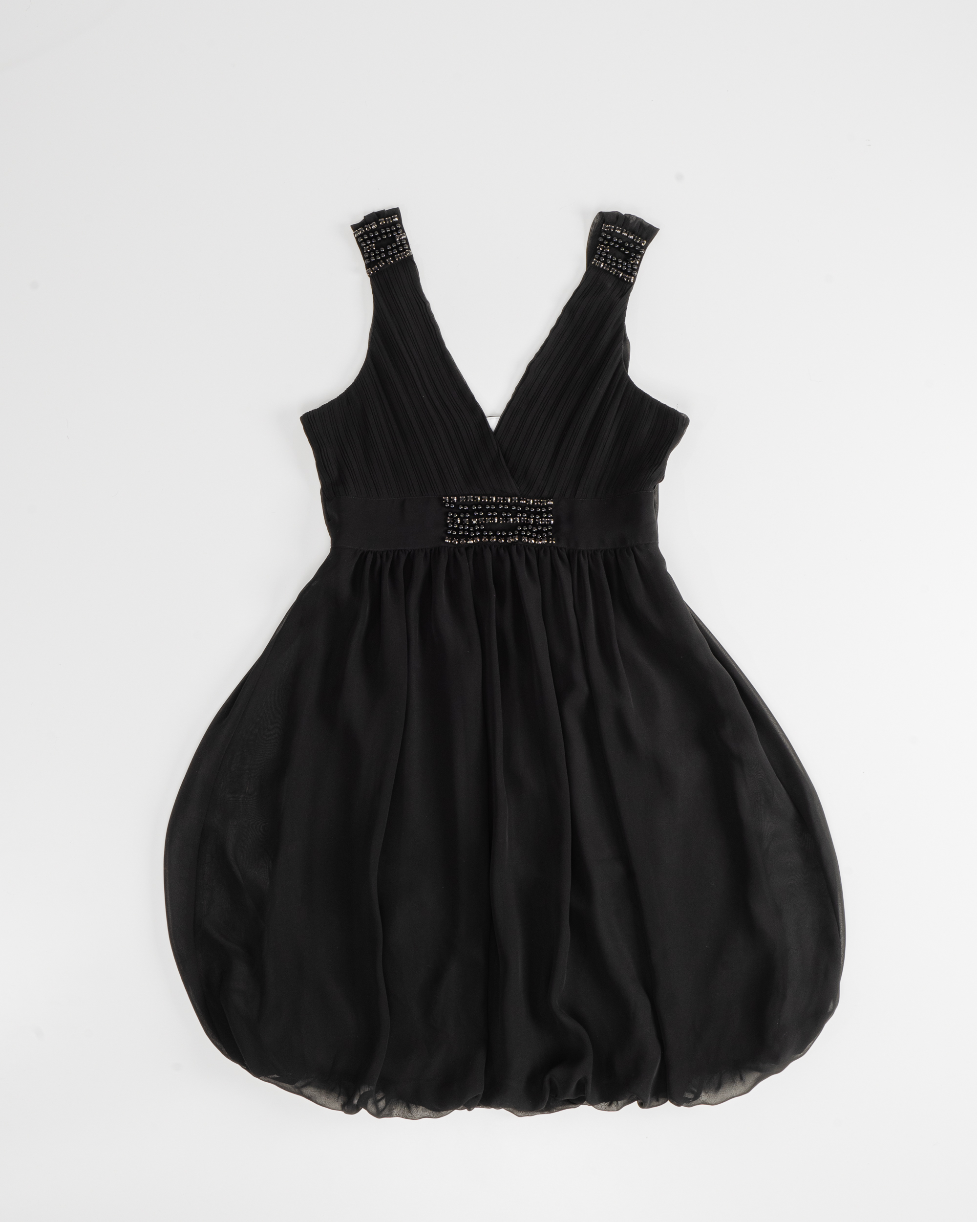 - Рисунок основан на фактурных вертикальных складках в лифе и аккуратной расстановке блестящих декоративных элементов на бретелях и под грудью.