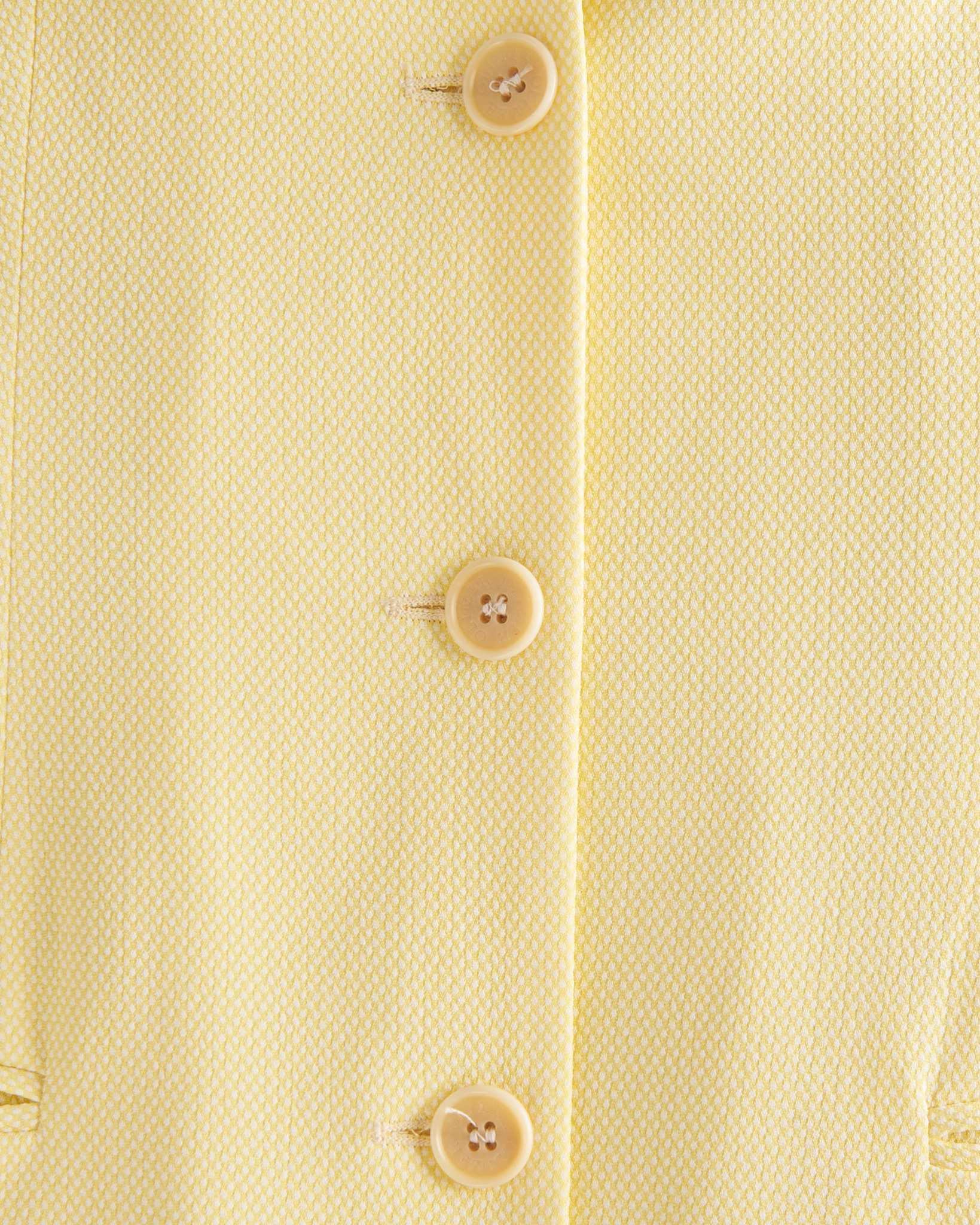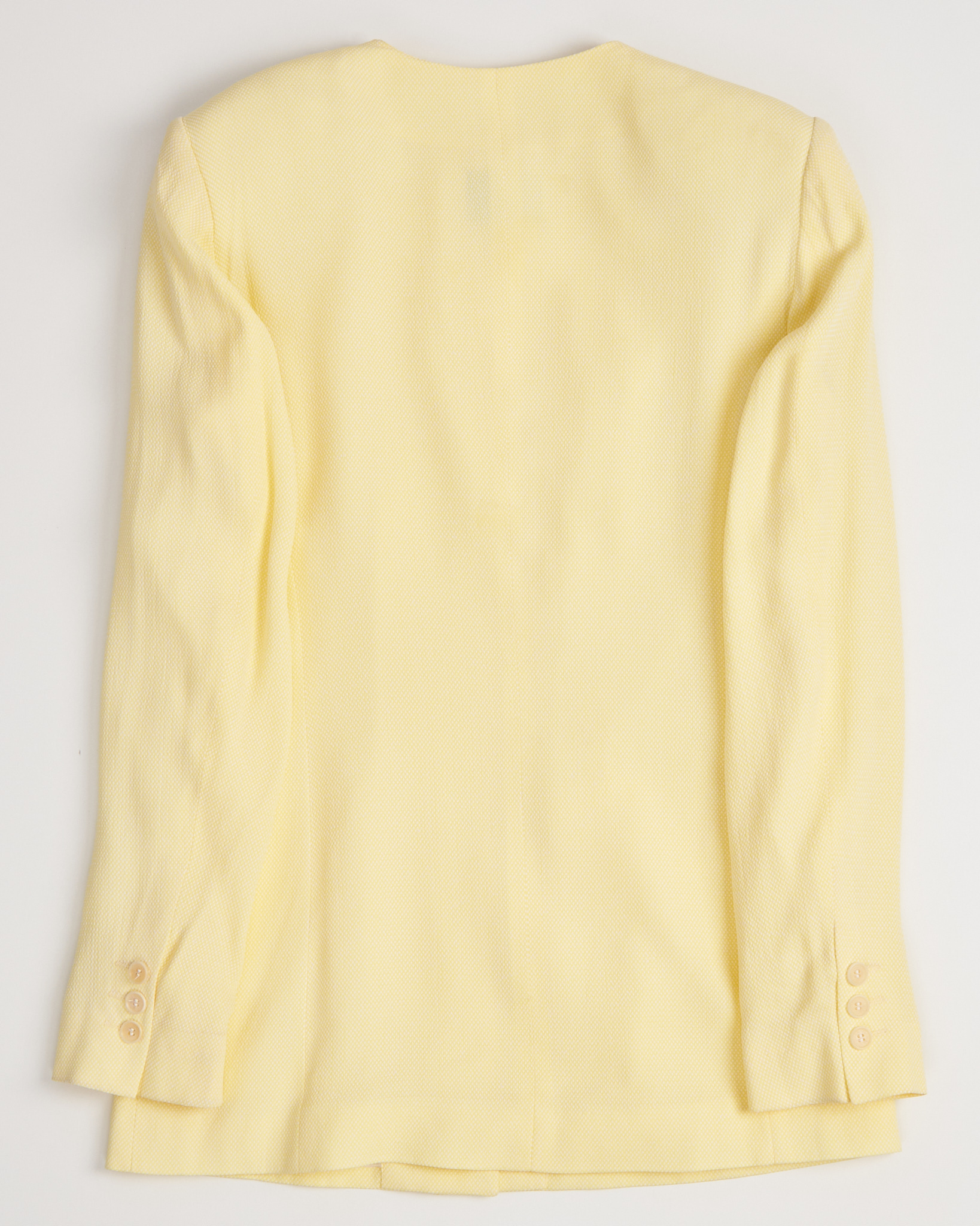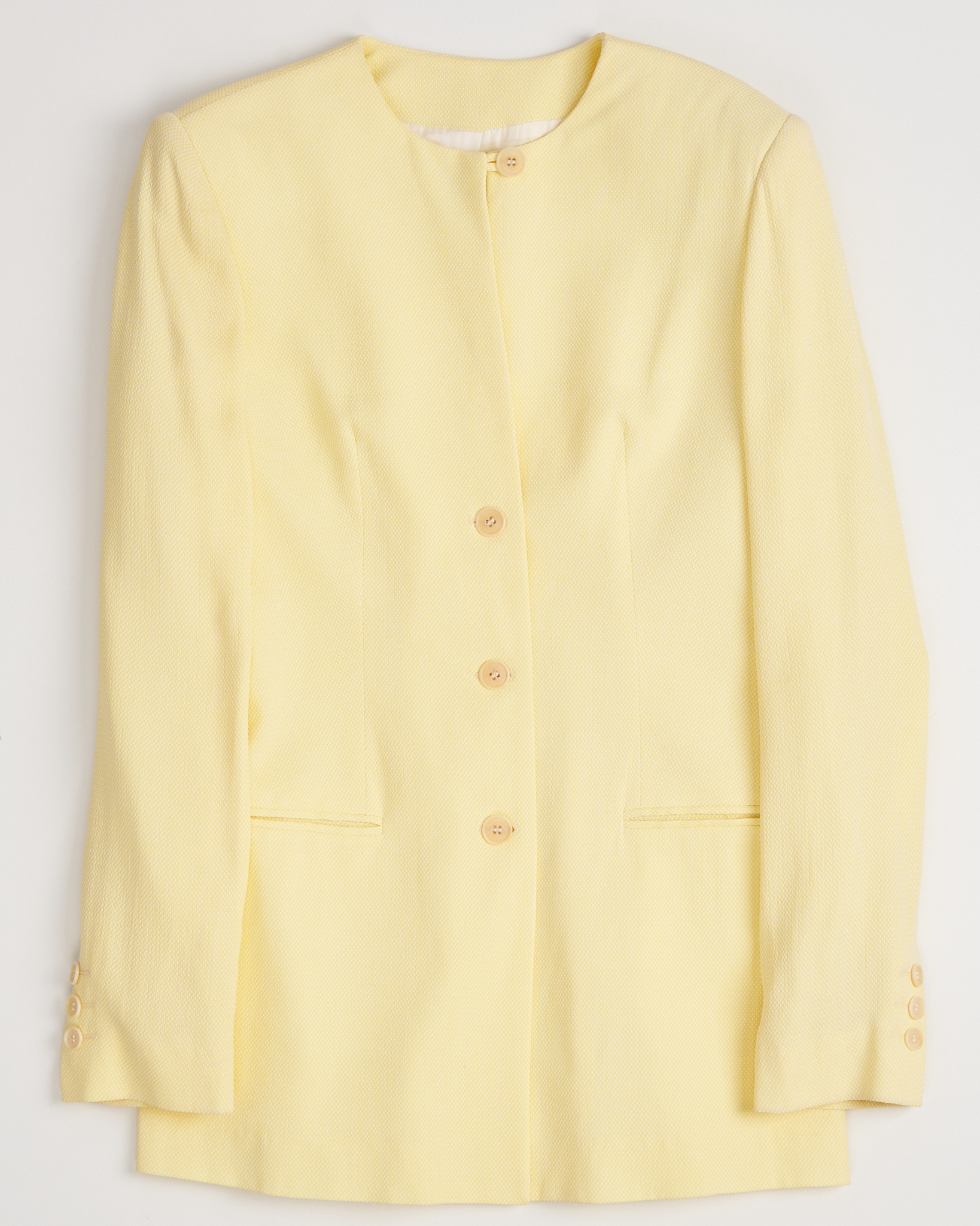 Пиджак нежно-желтого цвета с текстурированной тканью. Прямой силуэт, удлиненный крой. Застежки на пуговицах в тон. Удобные подплечники. Сделан в Италии.