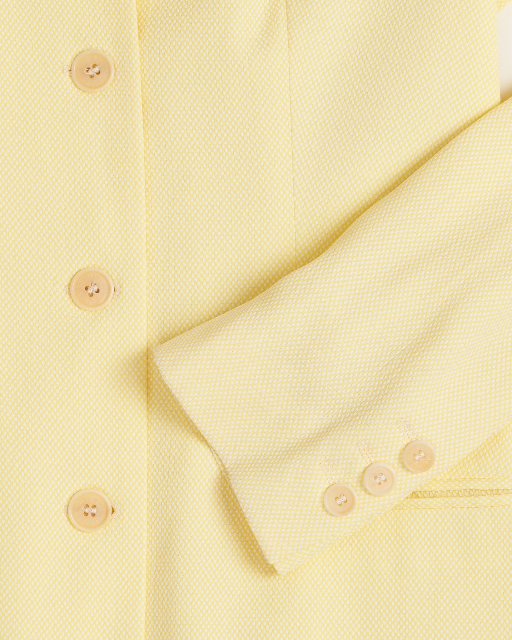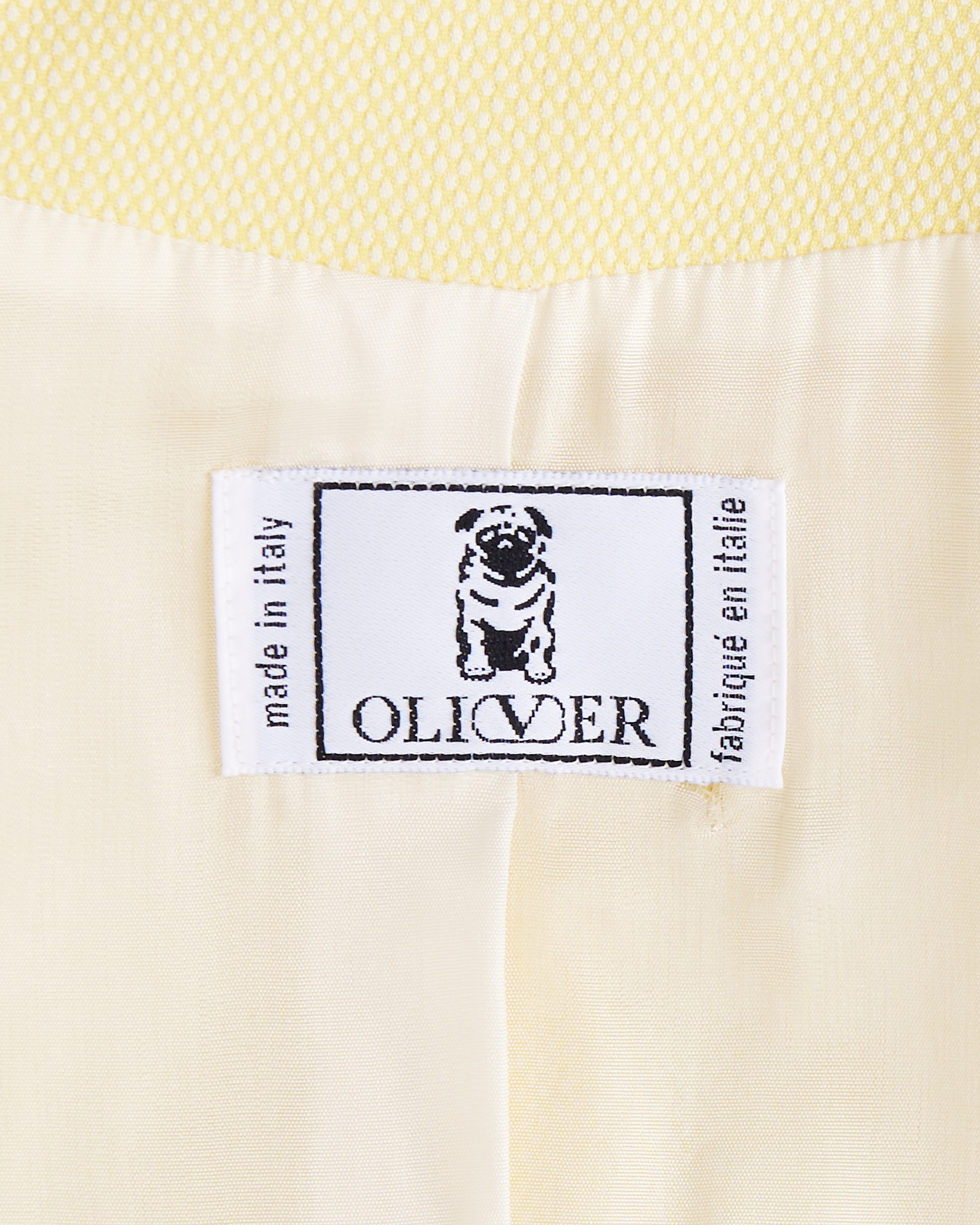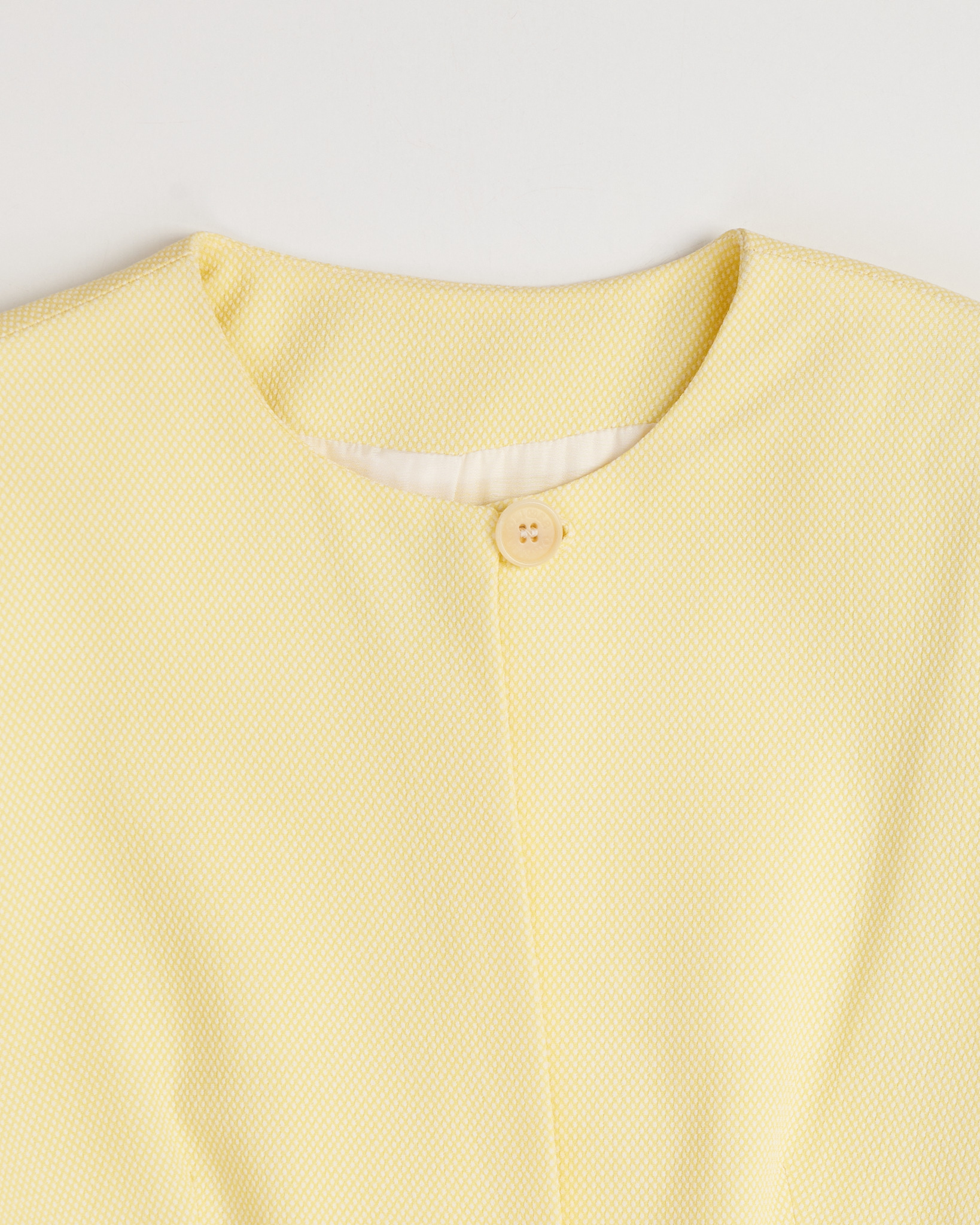 Пиджак нежно-желтого цвета с текстурированной тканью. Прямой силуэт, удлиненный крой. Застежки на пуговицах в тон. Удобные подплечники. Сделан в Италии.