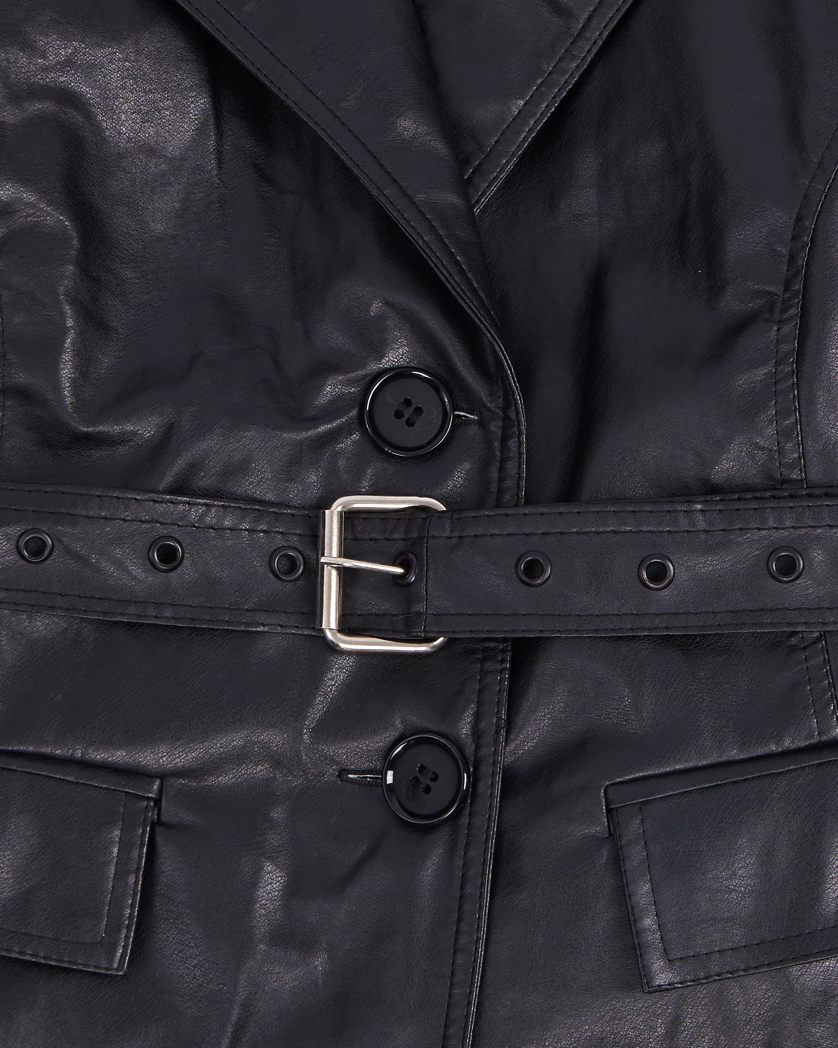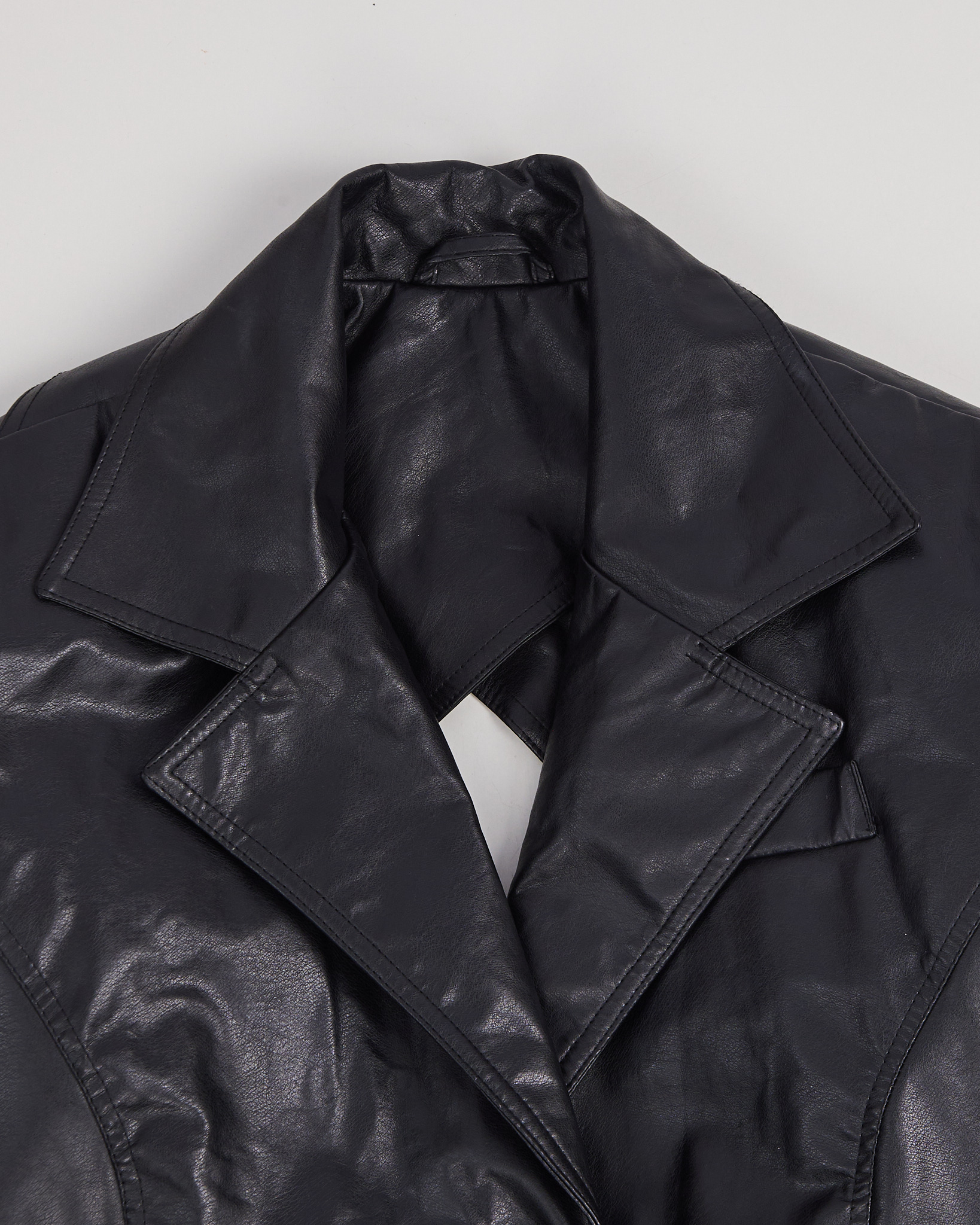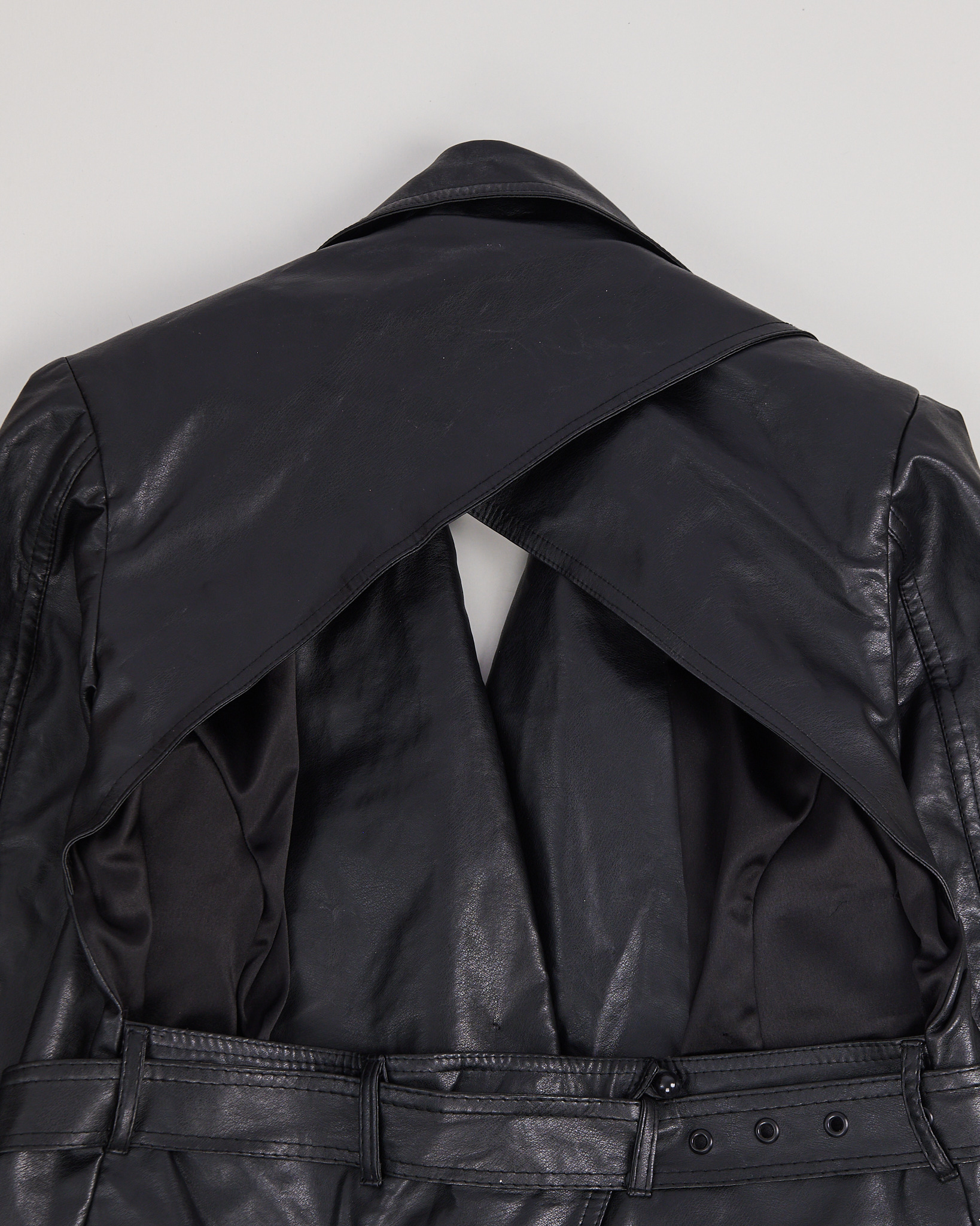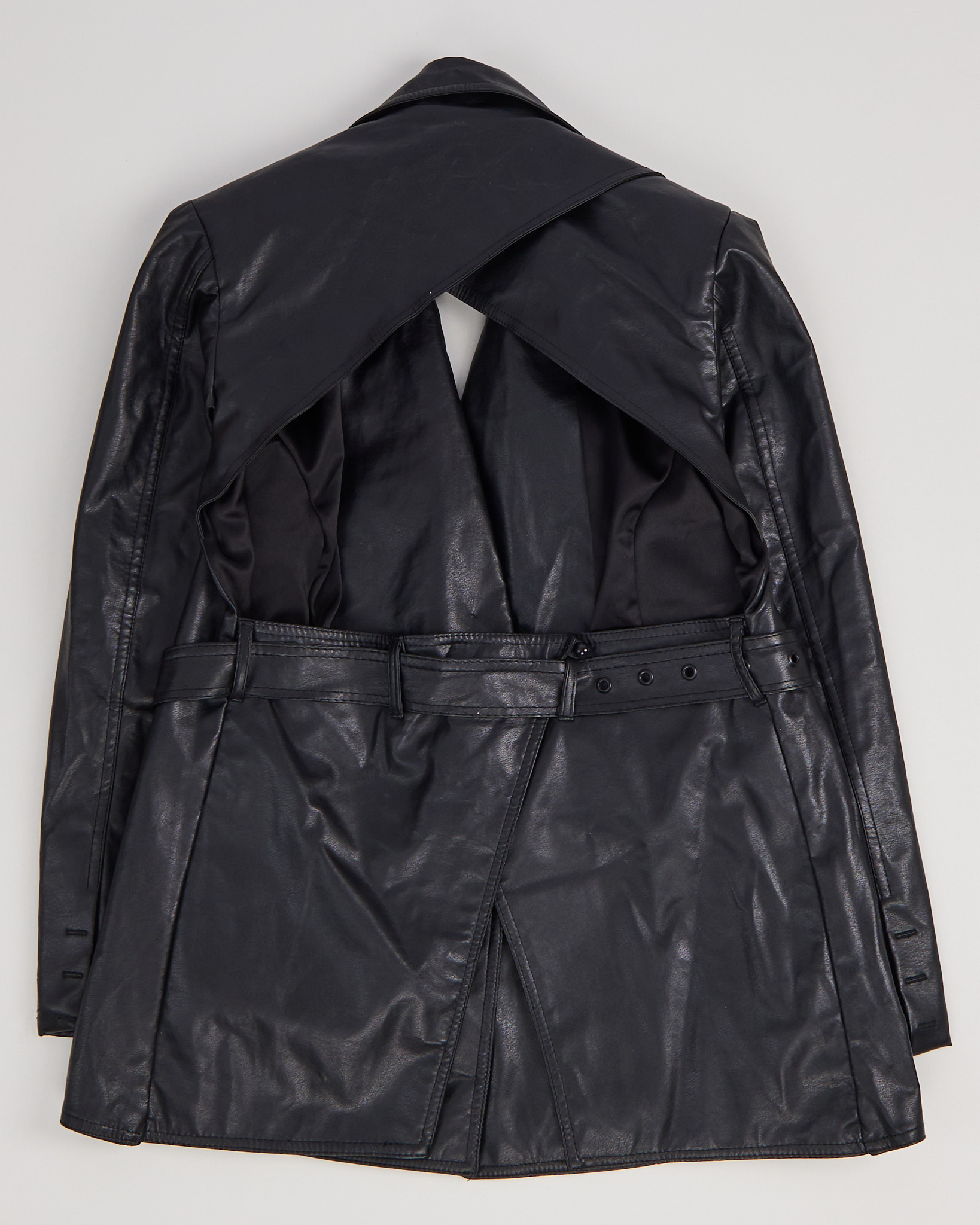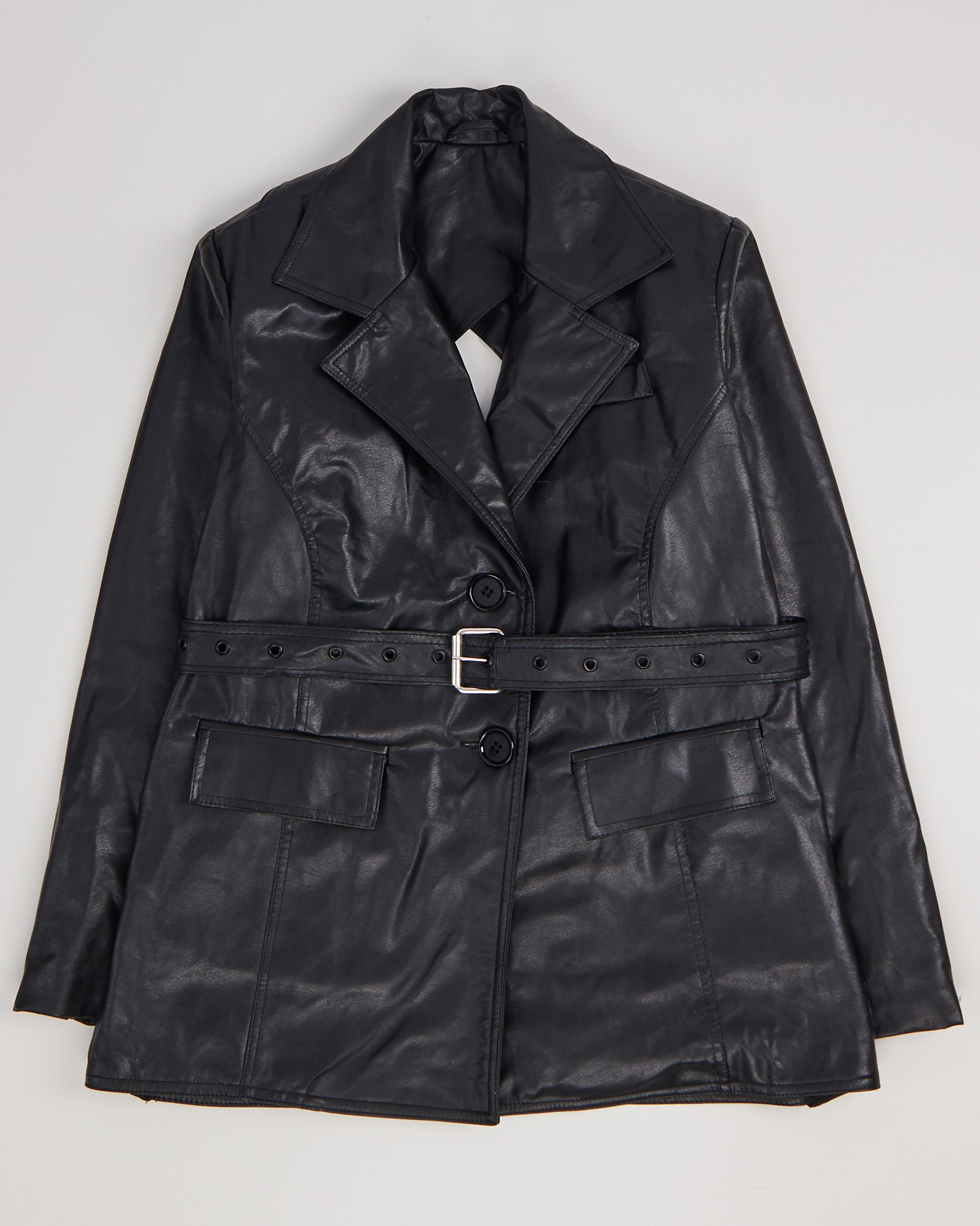 Куртка из искусственной кожи. Застежка на пуговицы, двубортный воротник. Посадка на талии регулируется поясом, функциональные карманы. Акцент - открытая спина с вырезом.