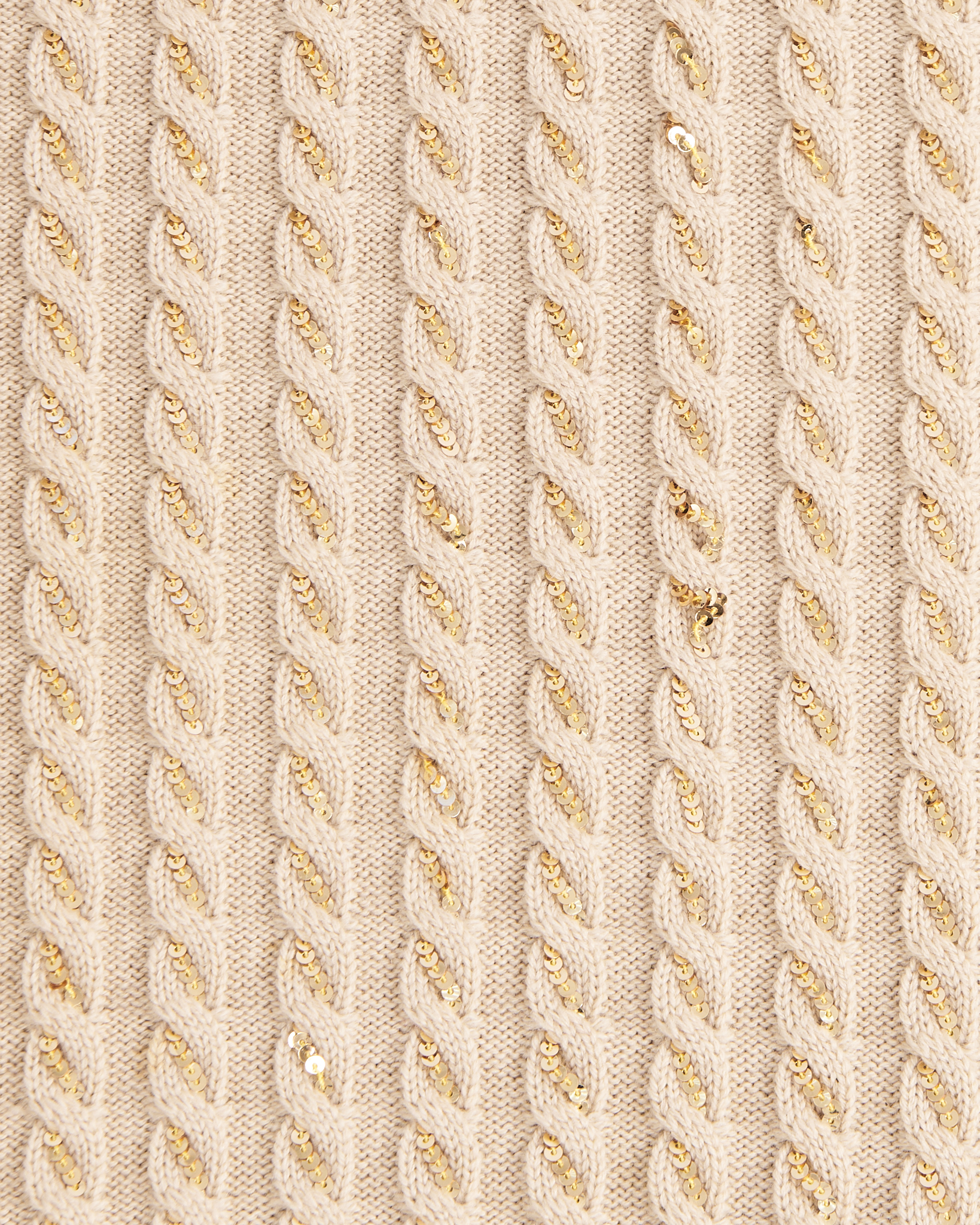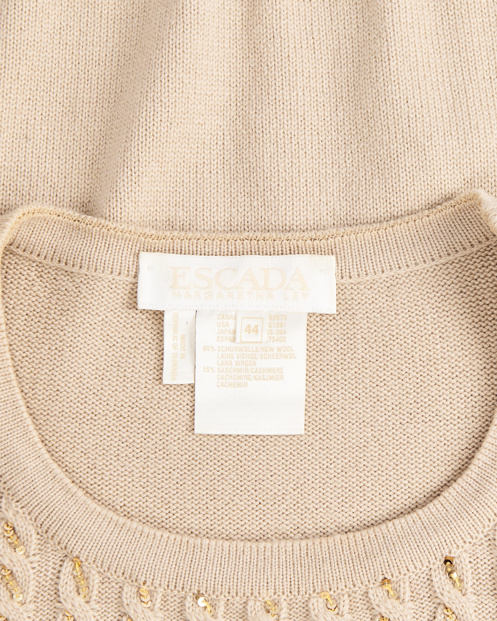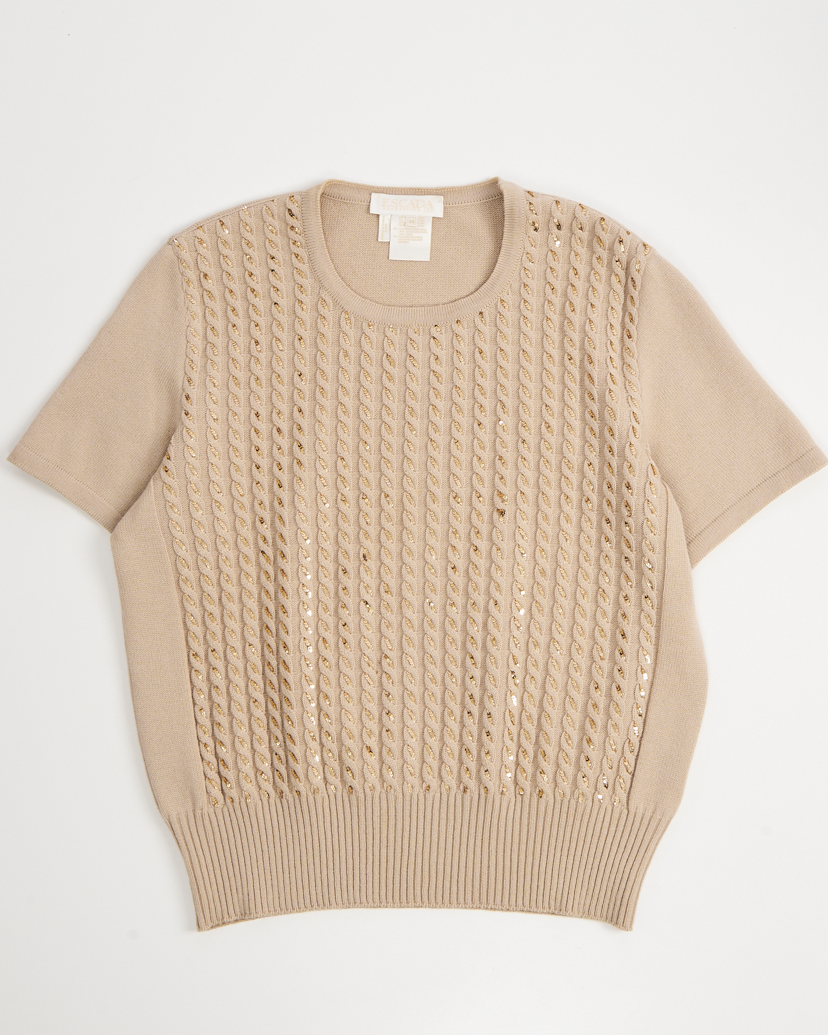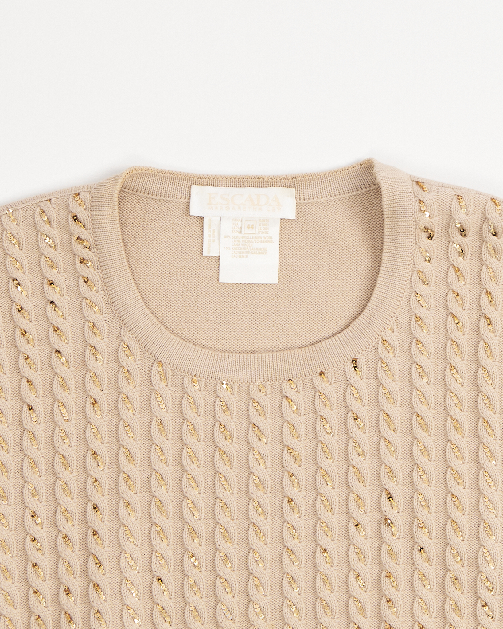 Кашемировый джемпер Escada Margaretha Ley с пайетками. Смесь шерсти и кашемира,крупная фактурная вязка, золотистые пайетки вплетены прямо в структуру пряжи. Эластичные манжеты и пояс, комфортная посадка по фигуре.