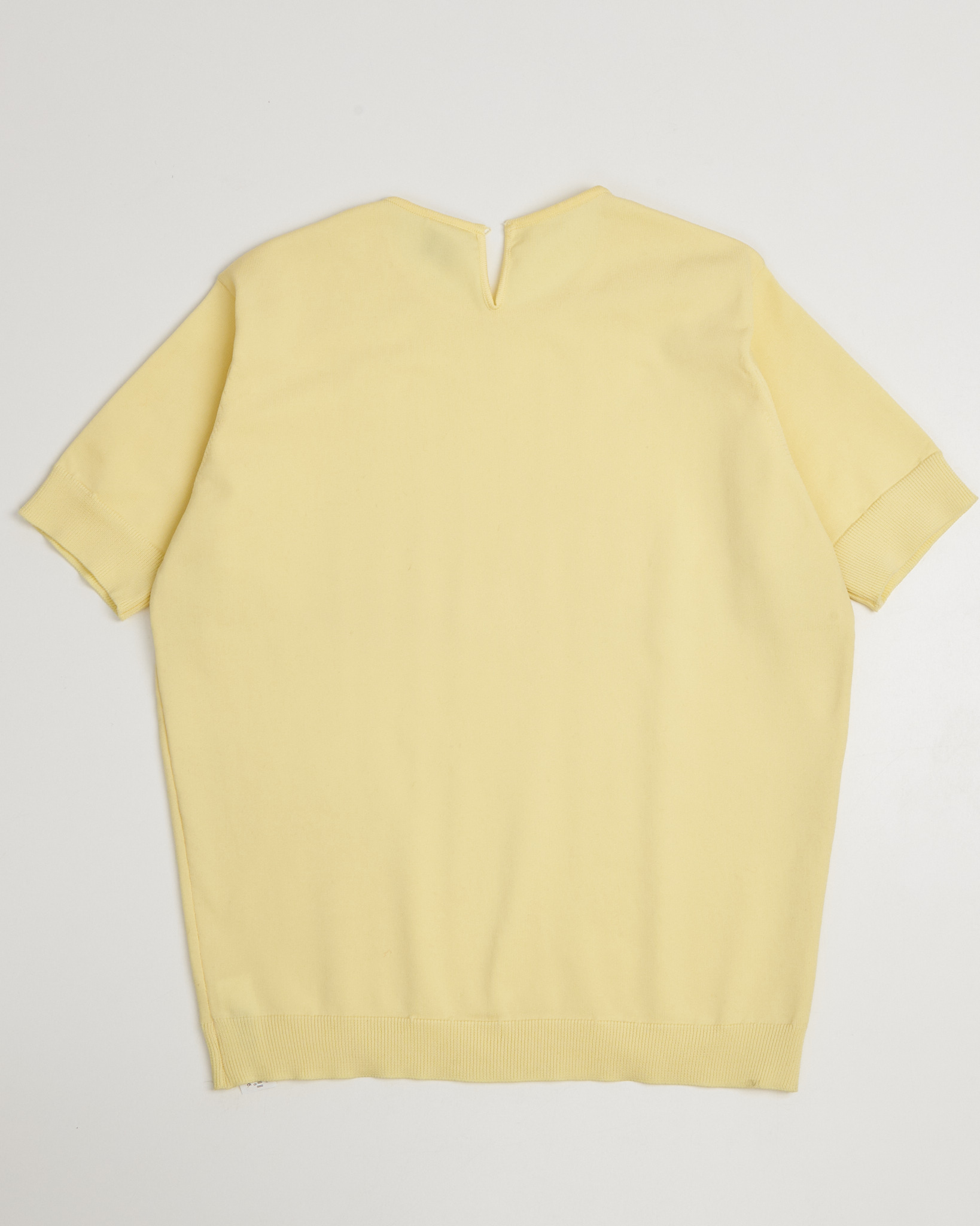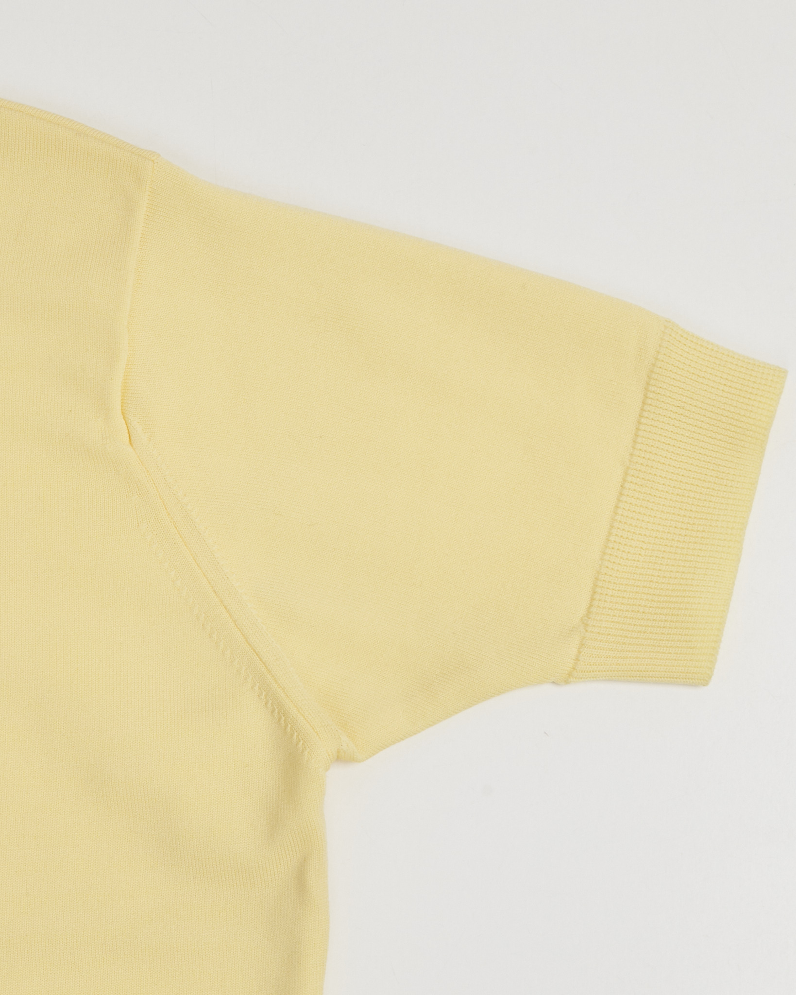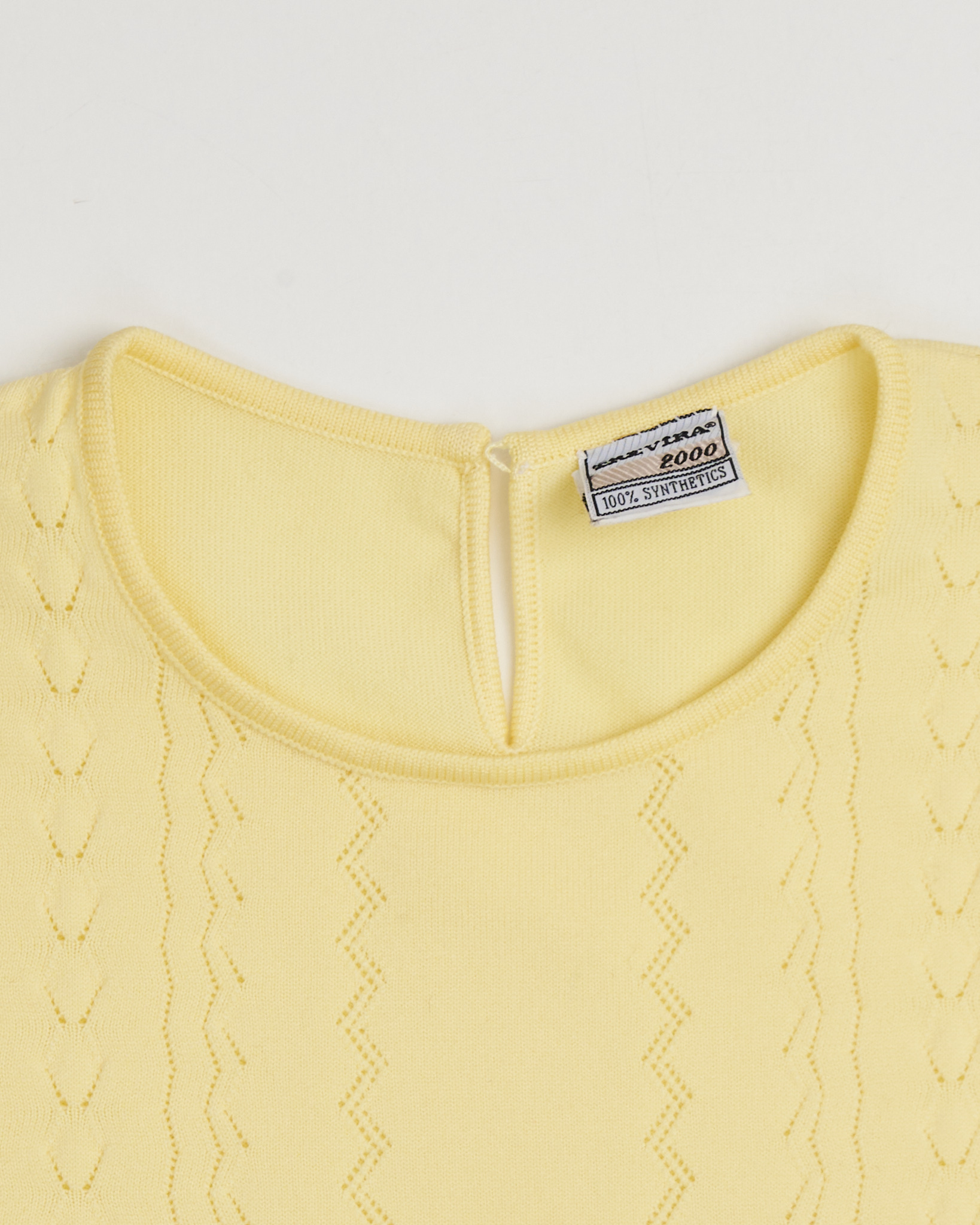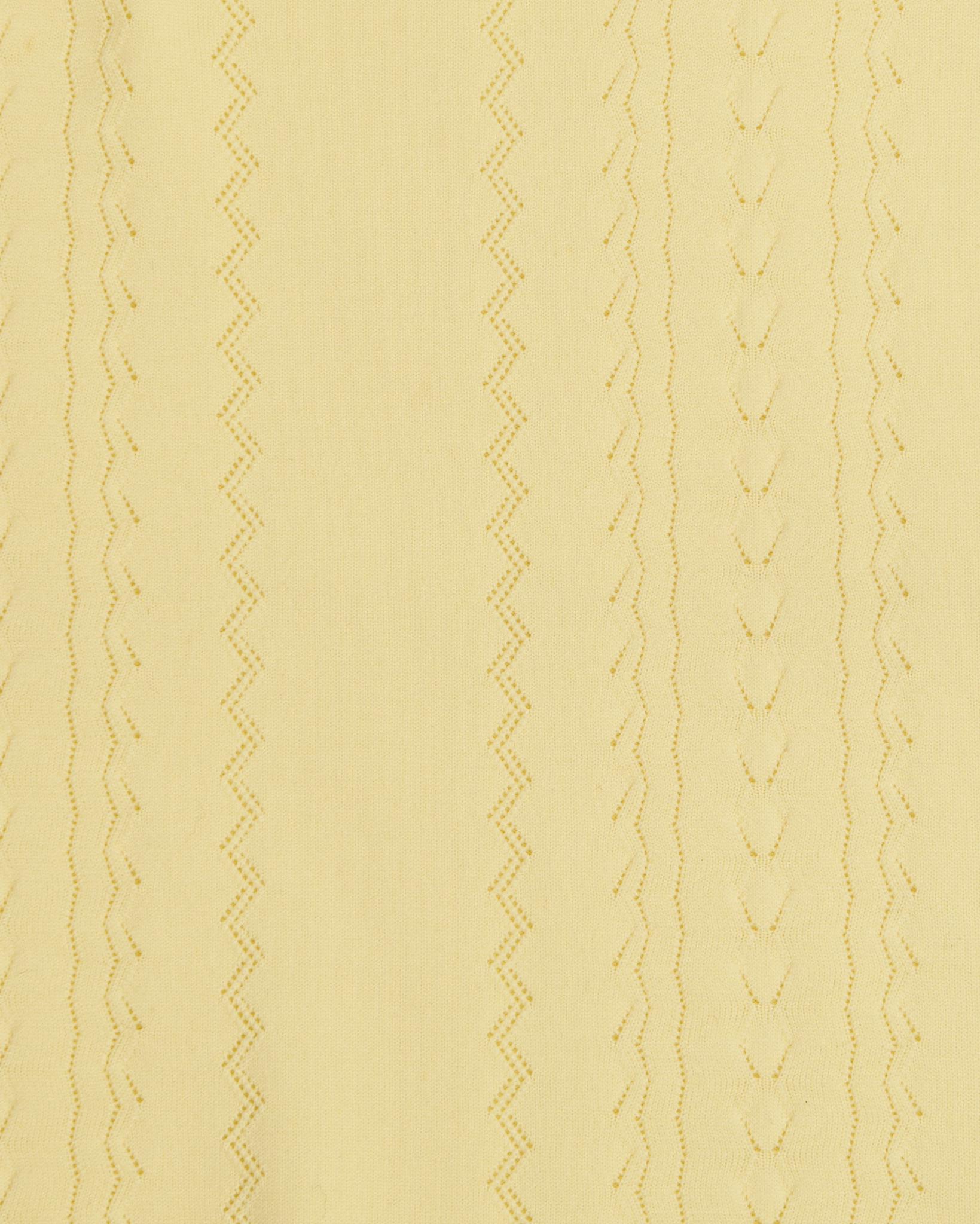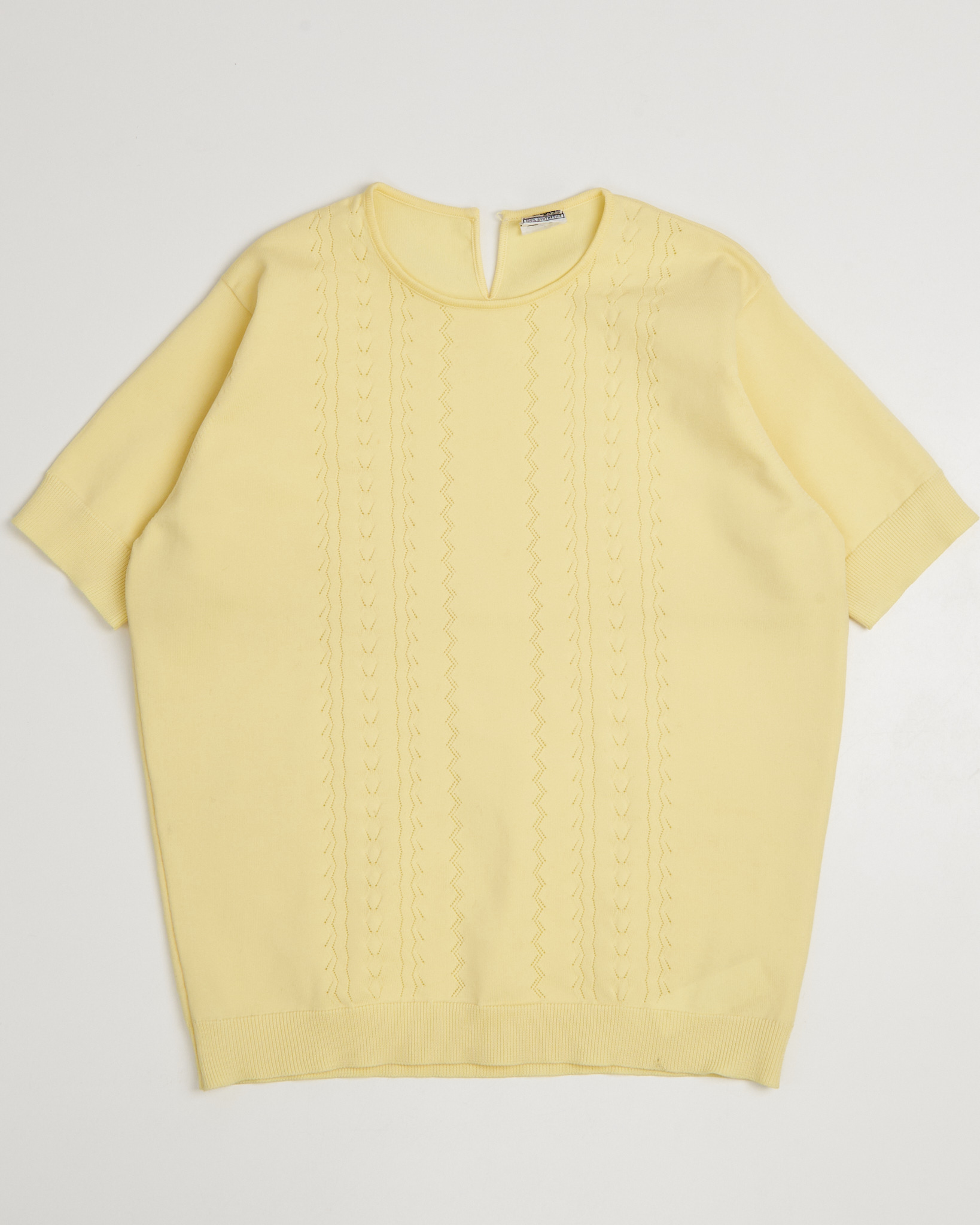 Джемпер в светло-жёлтом оттенке с вертикальным ажурным рисунком. Прямого силуэта, свободной посадки с коротким рукавом с плотной резинкой, низ изделия также оформлен эластичной планкой.