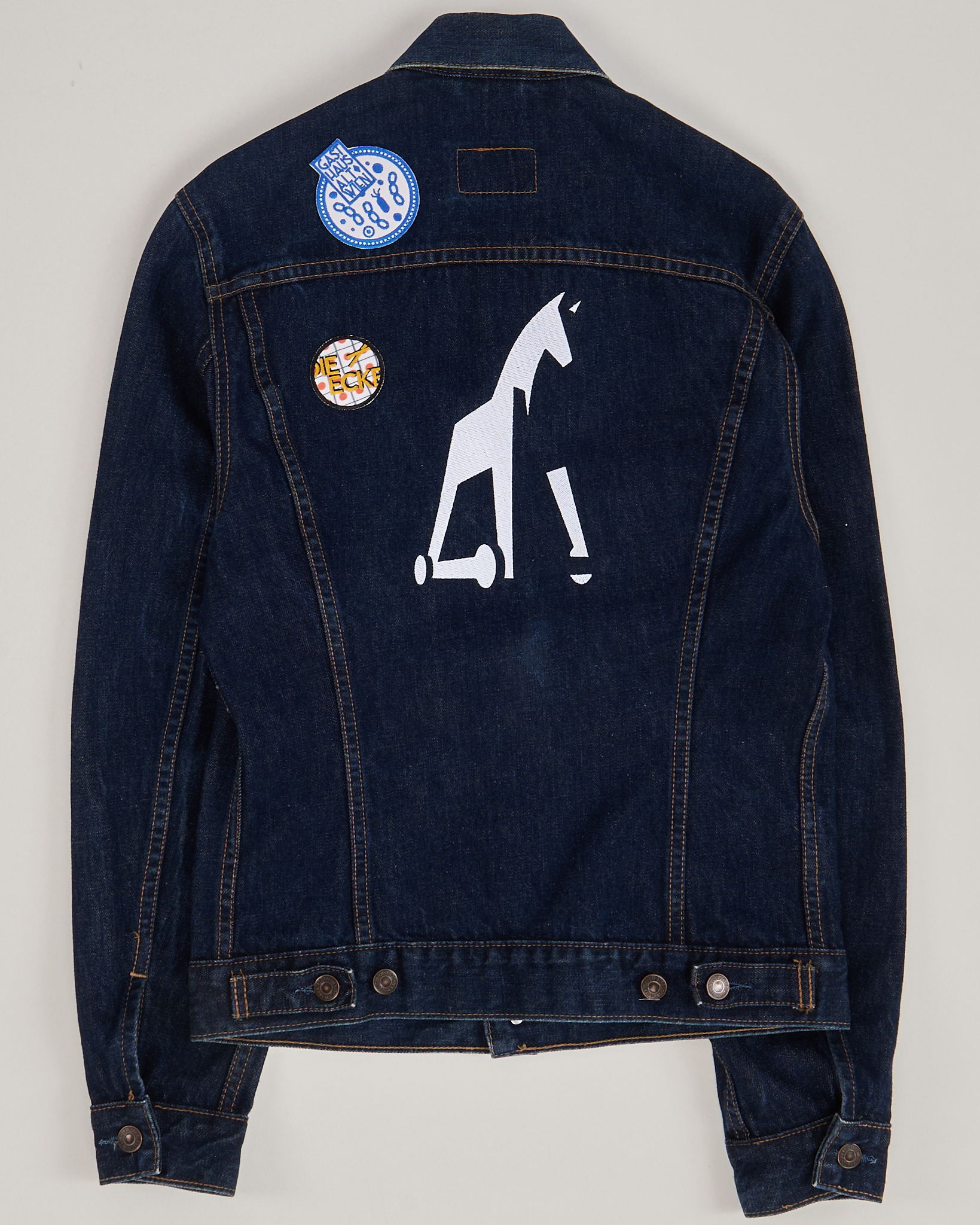 Классическая джинсовая куртка насыщенного синего оттенка с контрастной нитью. Фирменный принт на спине - стилизованный силуэт животного в минималистичном стиле. Декоративные нашивки